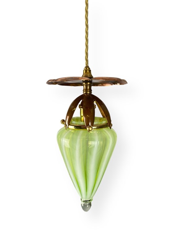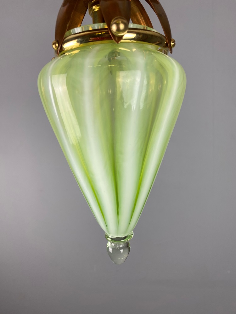 Fitted with a striped opalescent shade which has been hand made for us by a UK based glass blower.