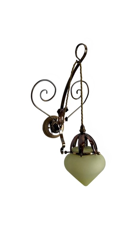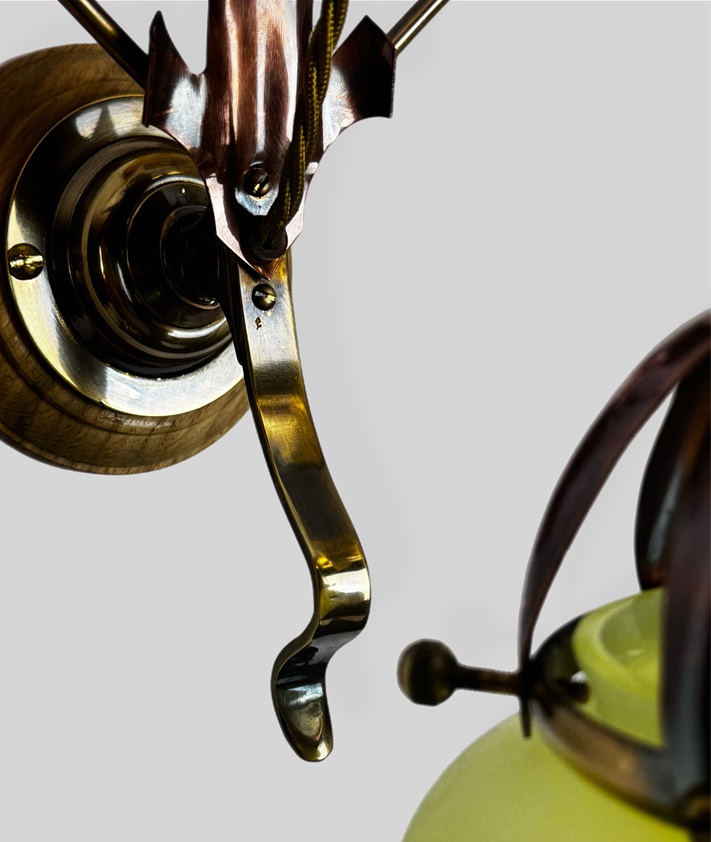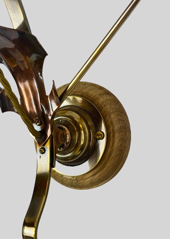 Taking inspiration from the works of WAS Benson. This large sized scrolled wall light combines both brass and copper elements.