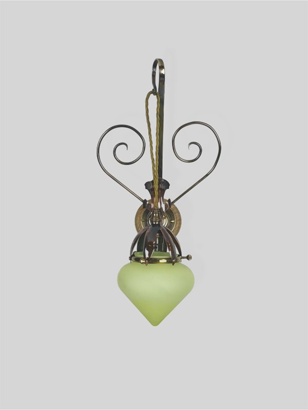 Dimensions – back plate measures 10cm. Projection from wall 26cm. Overall height from top of arm to bottom of glass shade 46cm. Width across the scrolls 24cm.