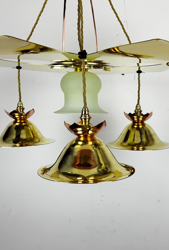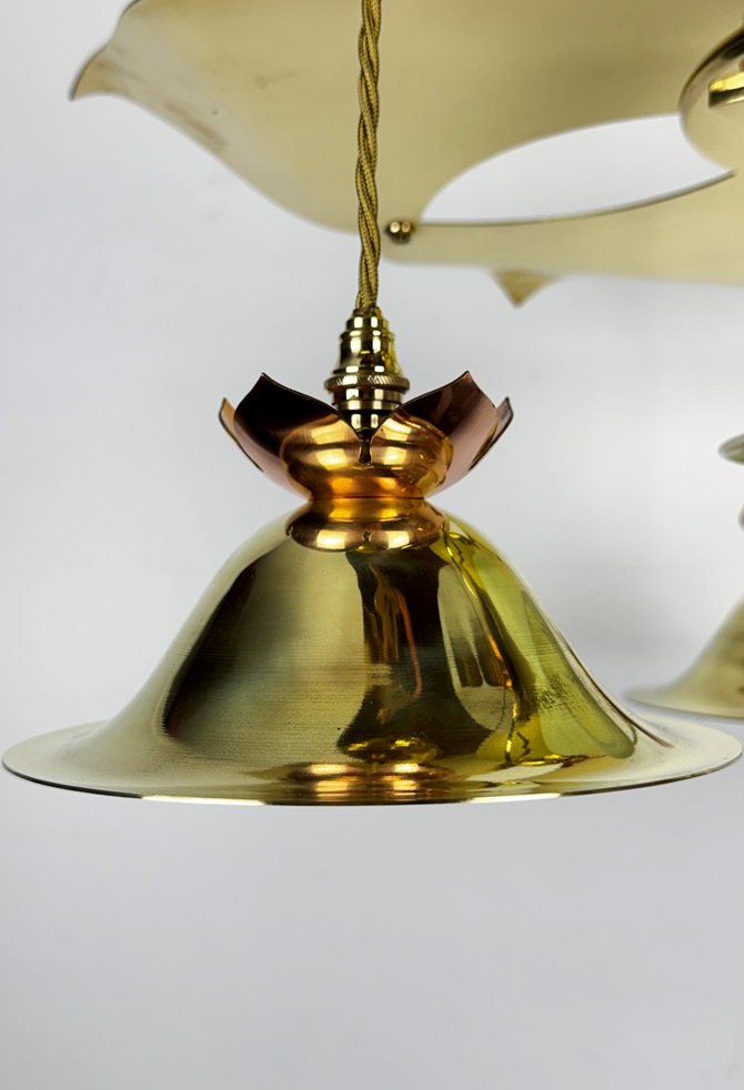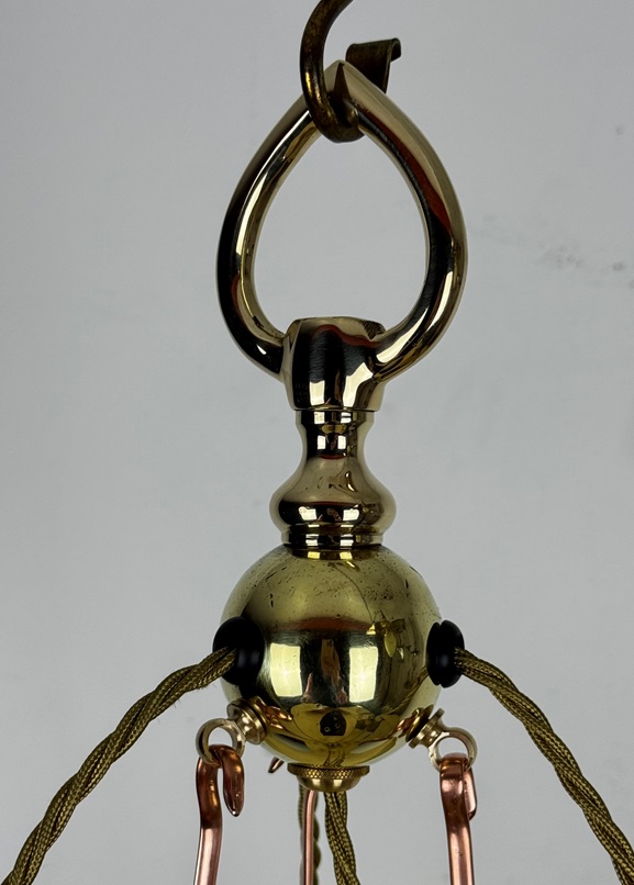 A stunning Arts and Crafts chandelier in polished brass and copper.