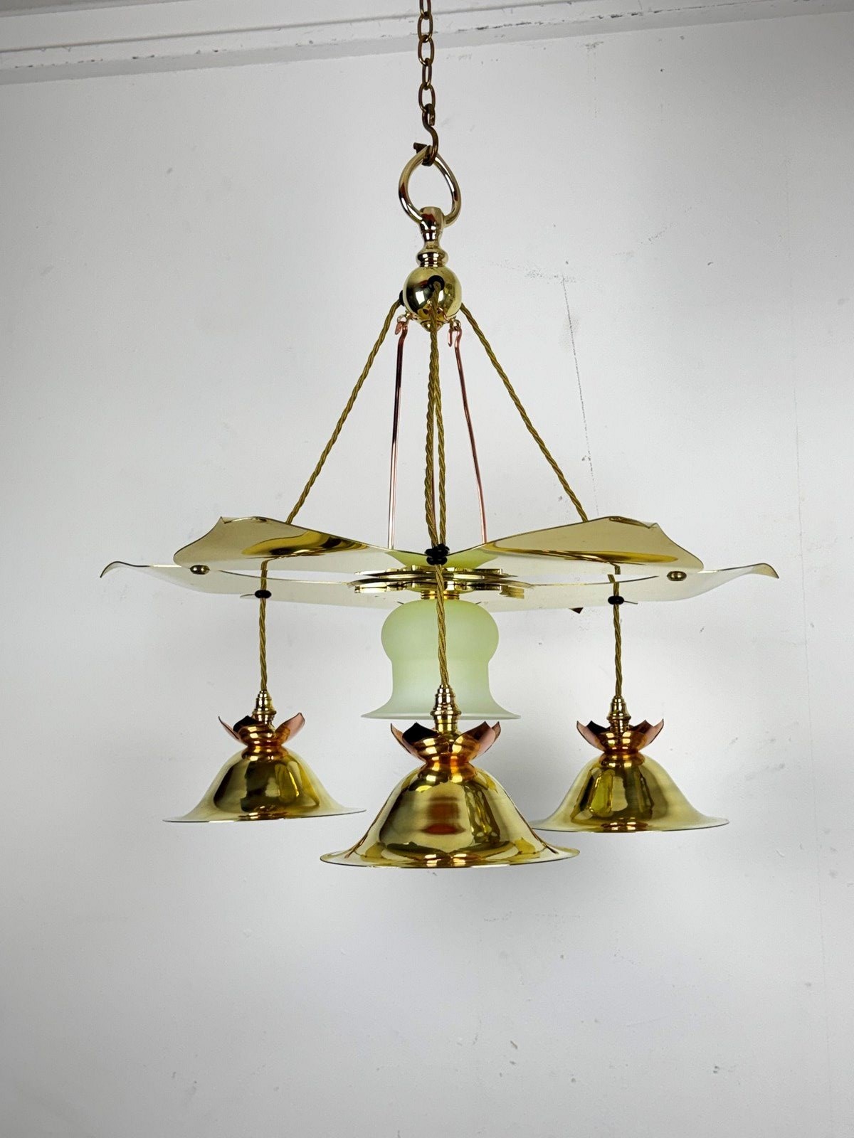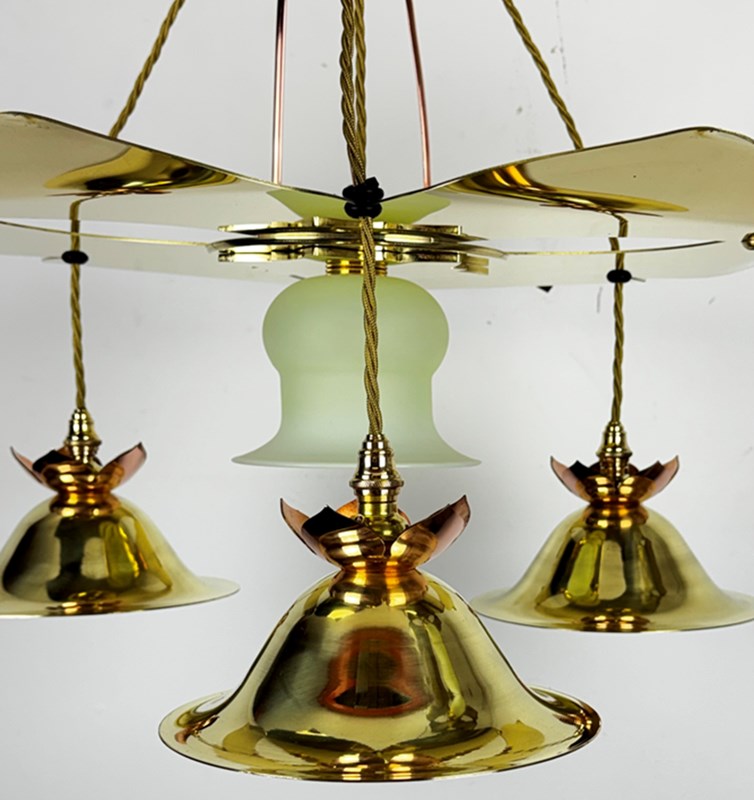 Three interlocking leaves create a canopy beneath which are suspended three brass domed reflector shades and a central vaseline glass shade.