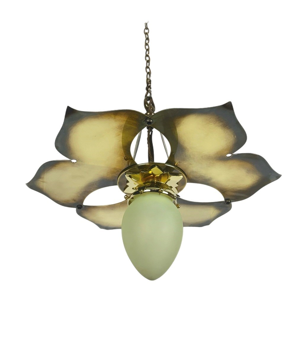 Three interlocking leaves create a canopy beneath which is fitted a vaseline glass shade.