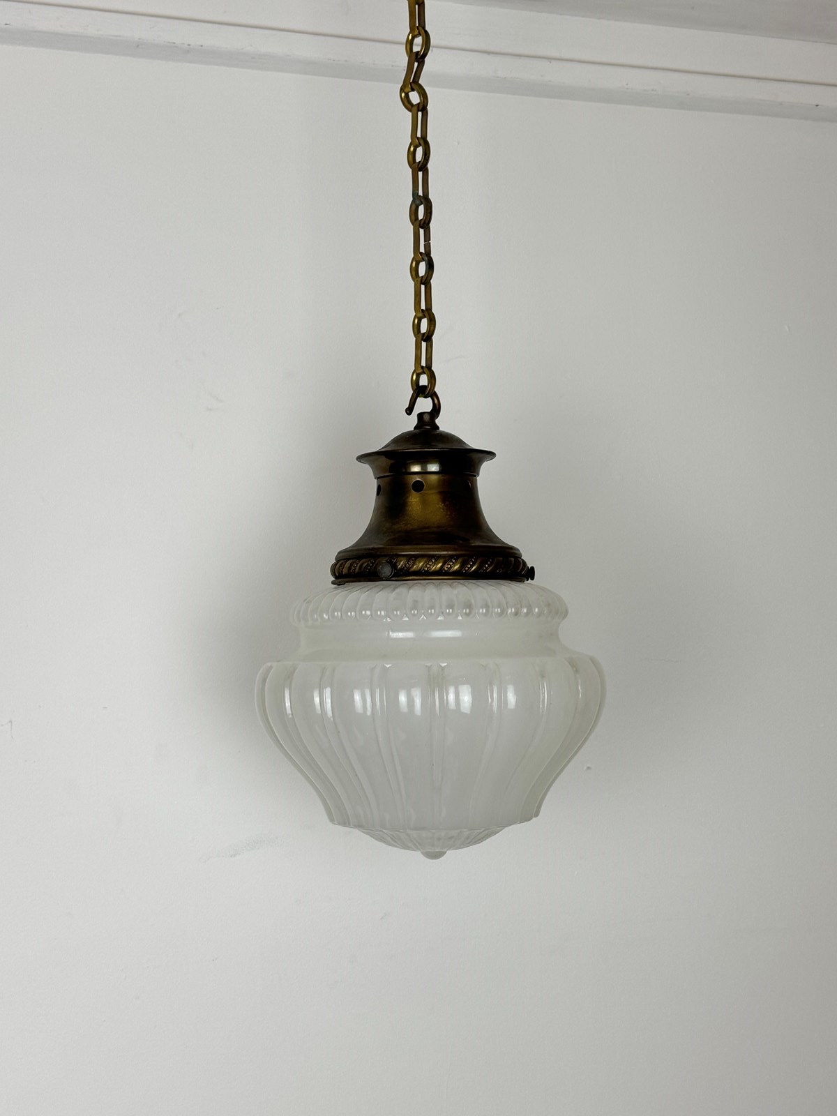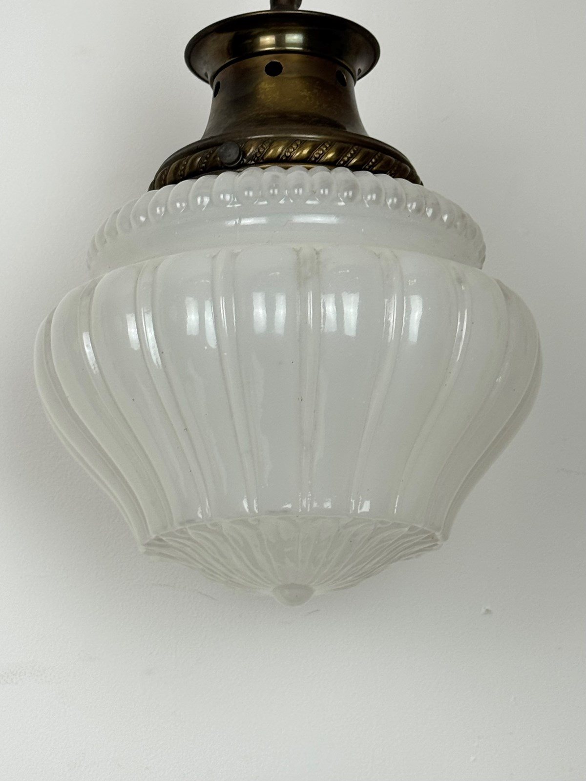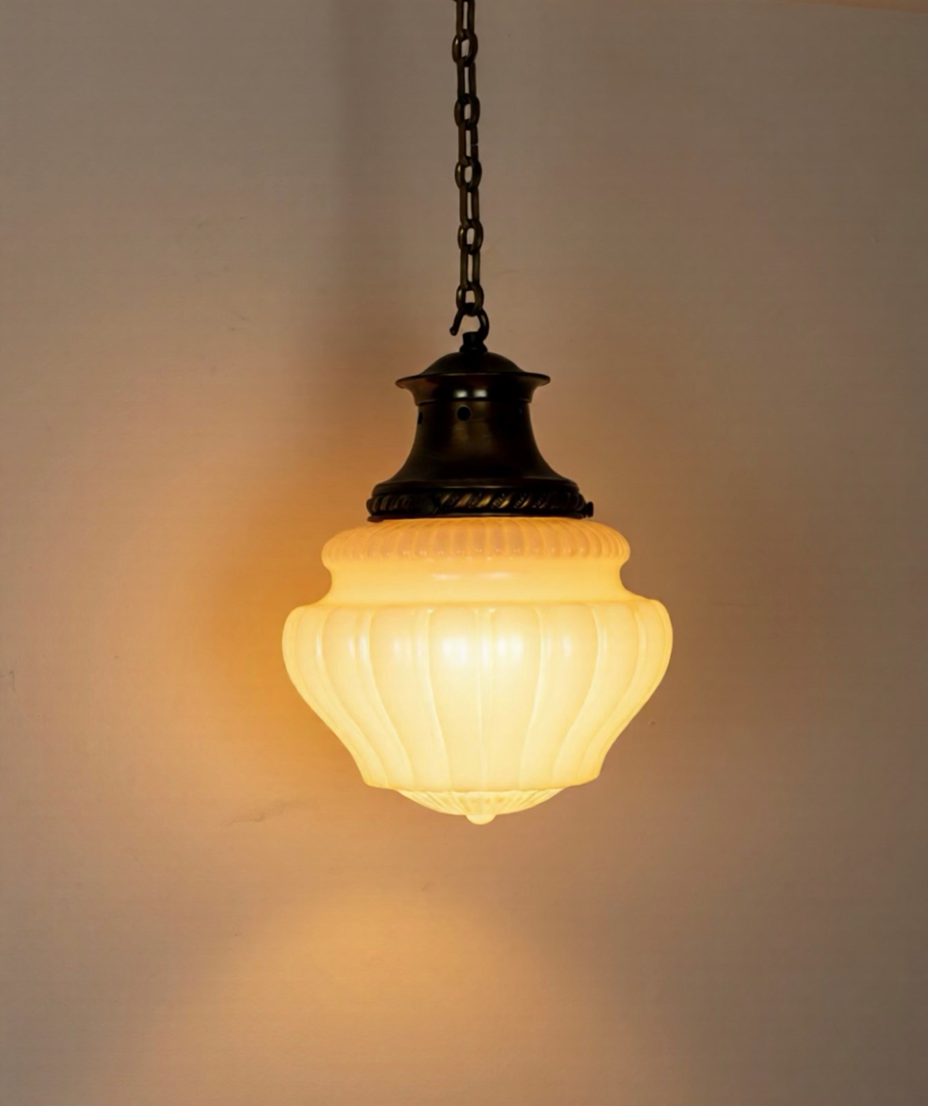 A beautifully detailed moonstone glass pendant light. Dating back to the early 20th century.
