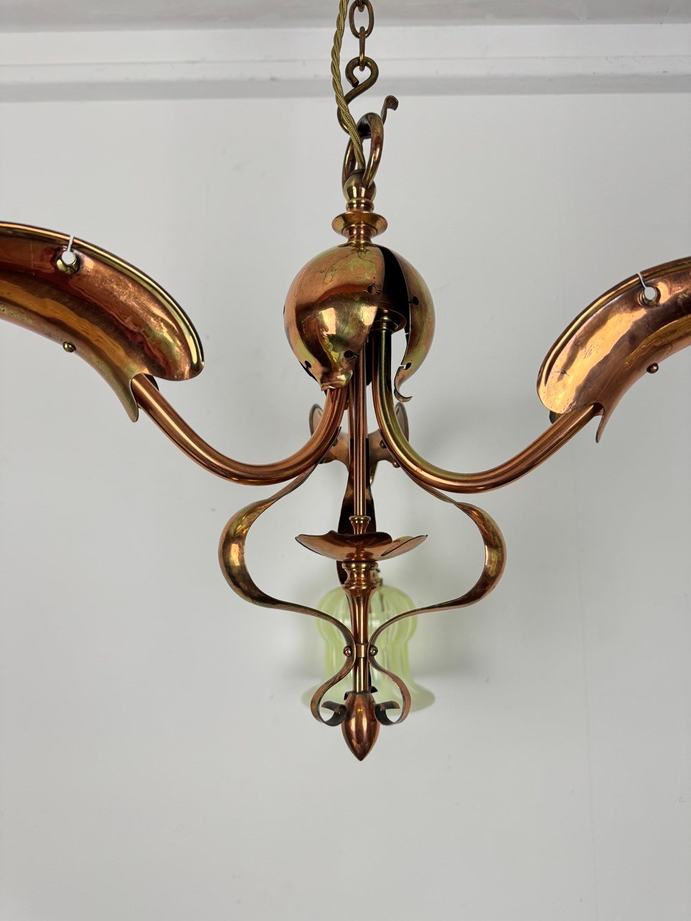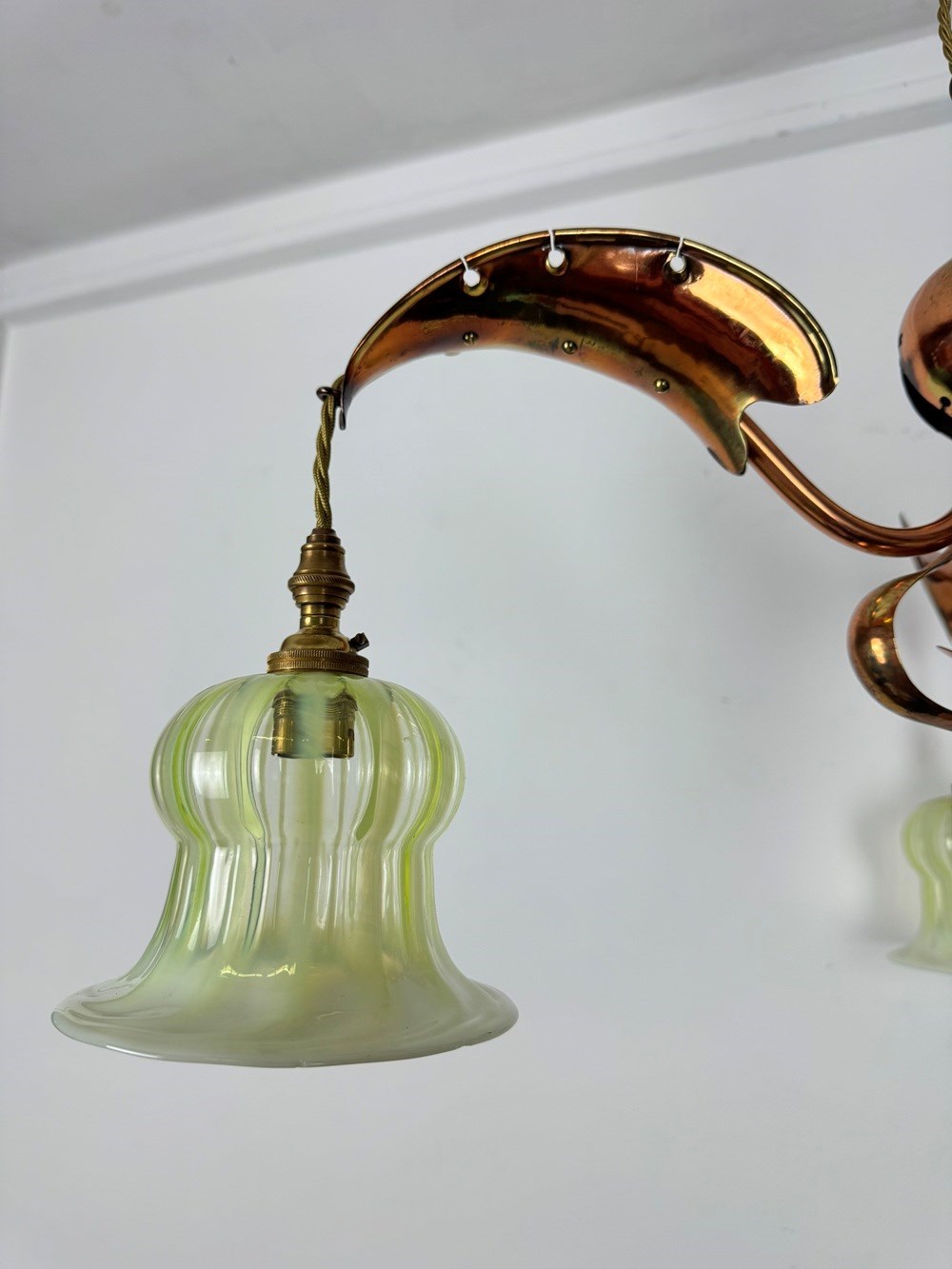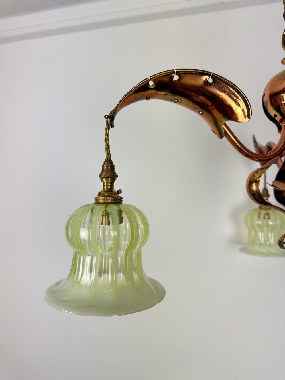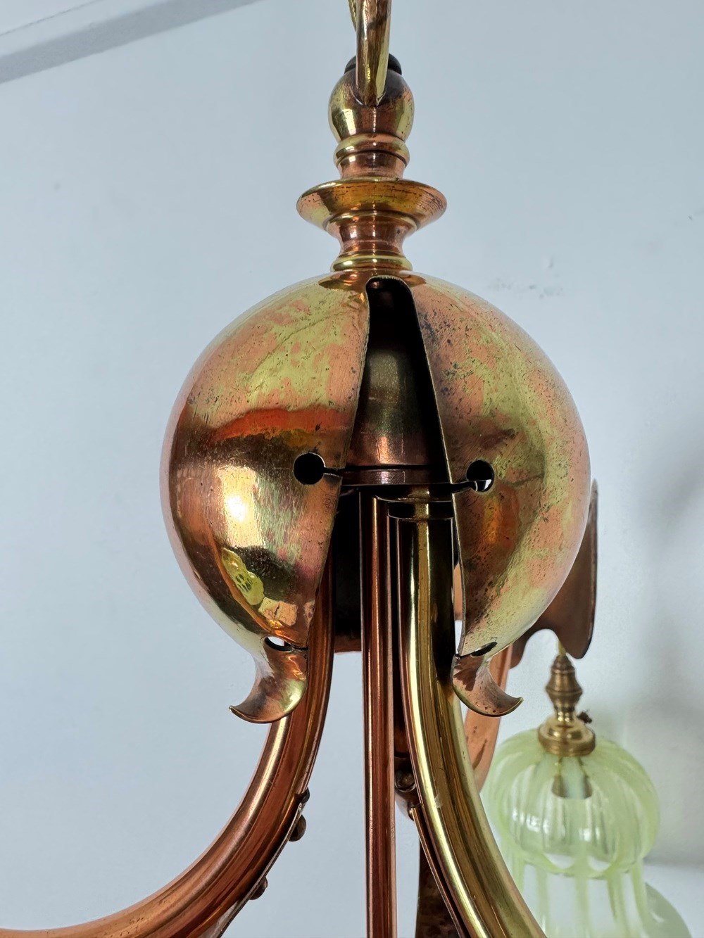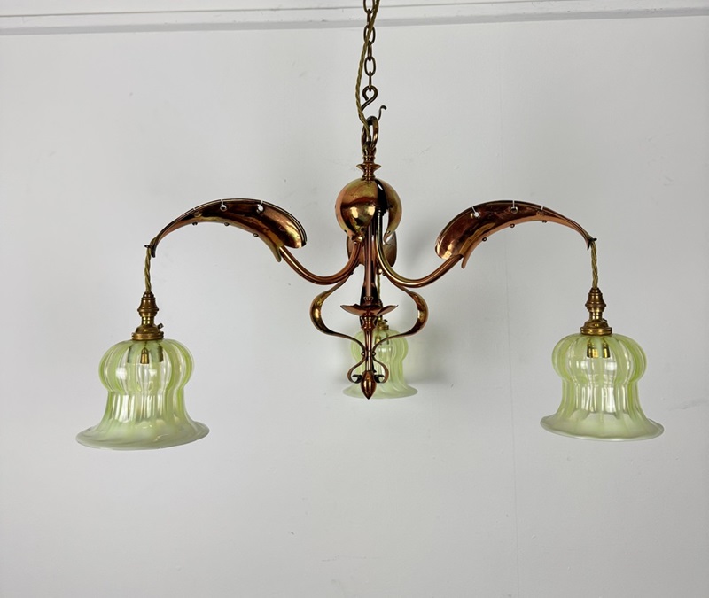 A three arm chandelier in distinctive arts and crafts style. Framework is made of brass with an oxidised copper finish.