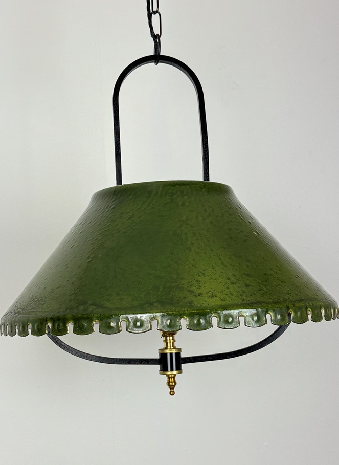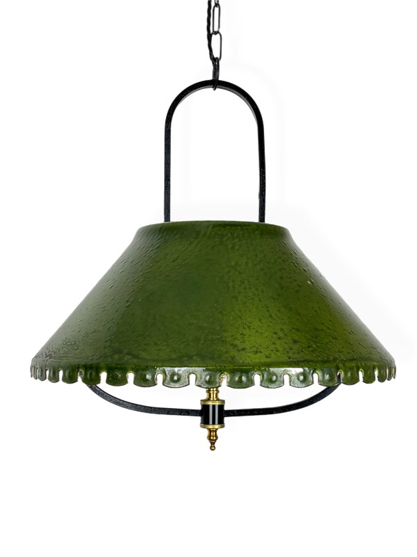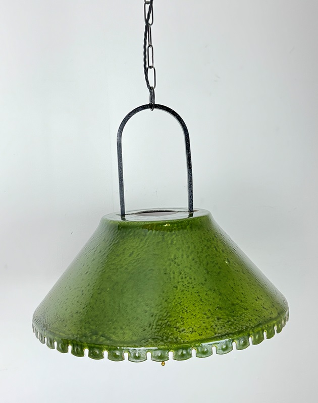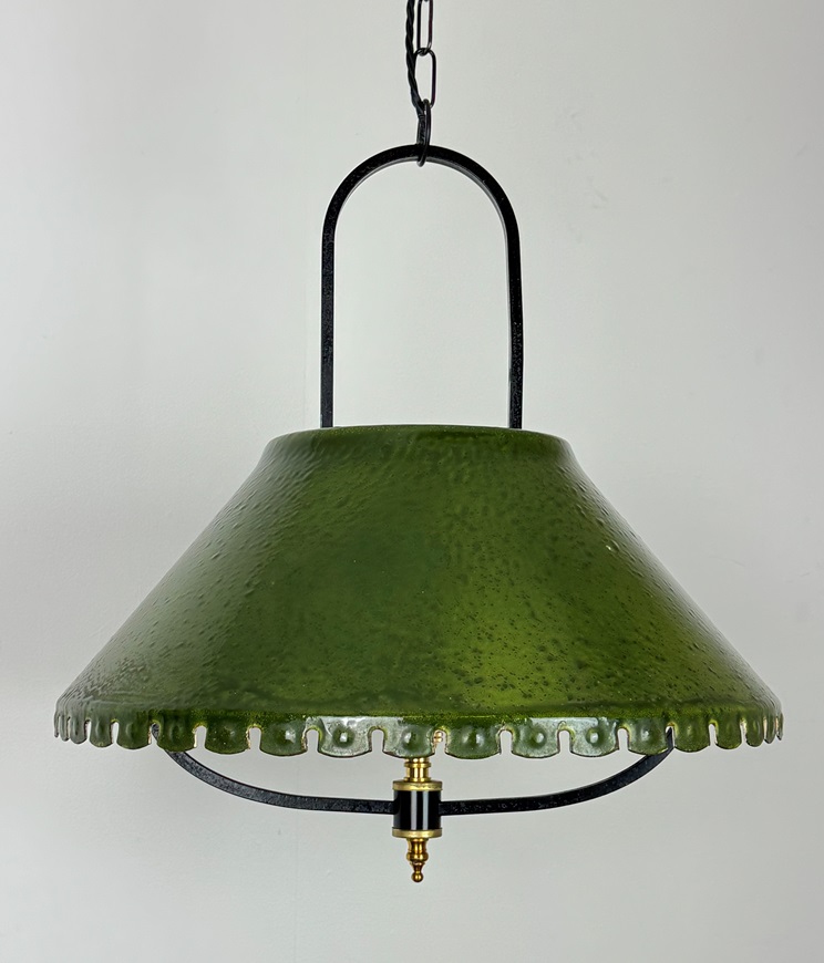 An unusual pendant light in a striking dark green. A bold design in textured enamelled metal with cut out detail to the lower rim and contrasting black hanging hoop and framework.