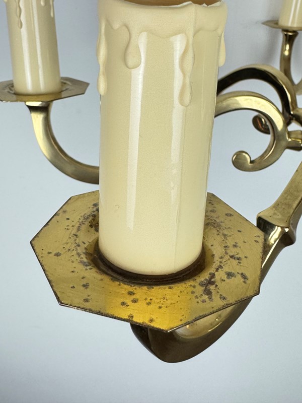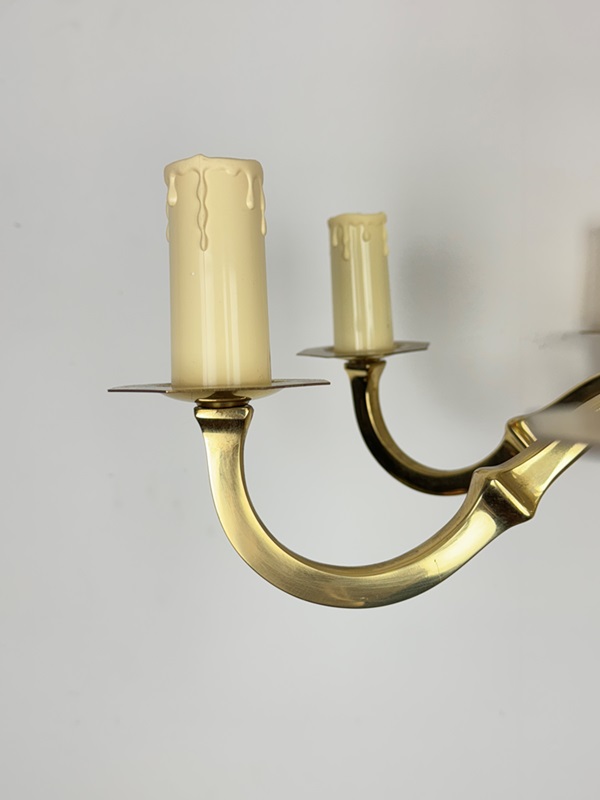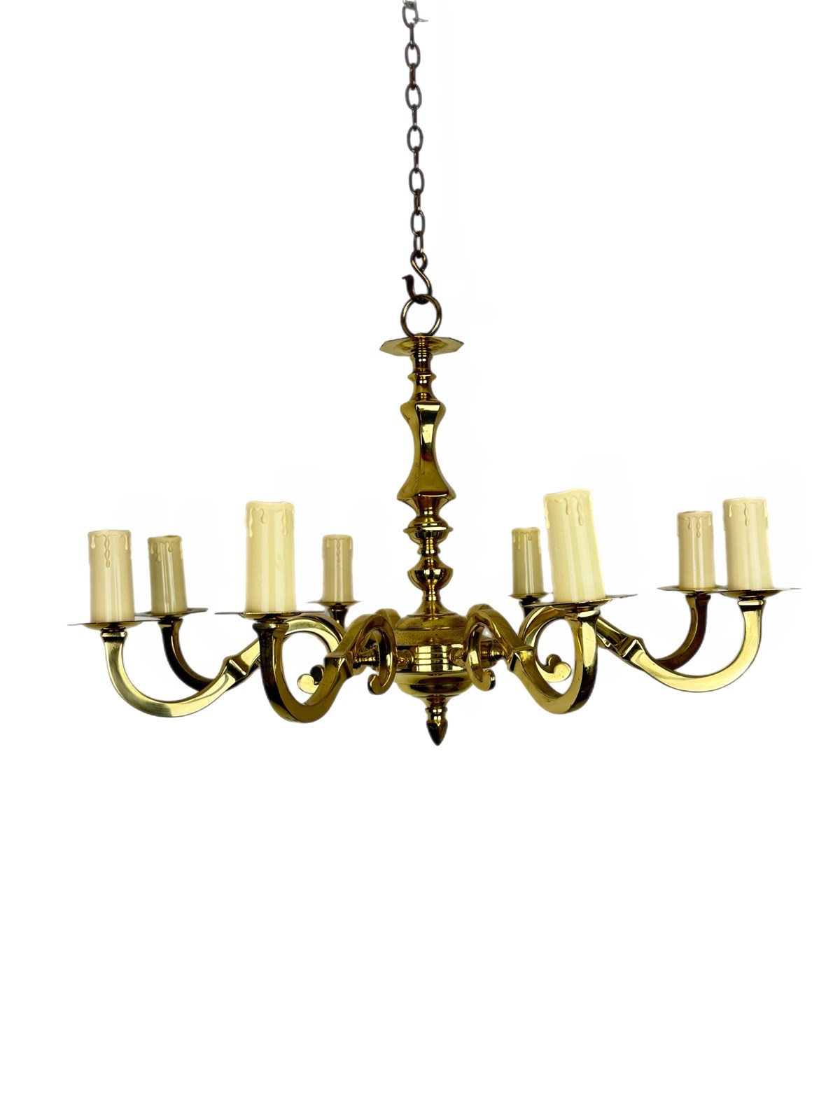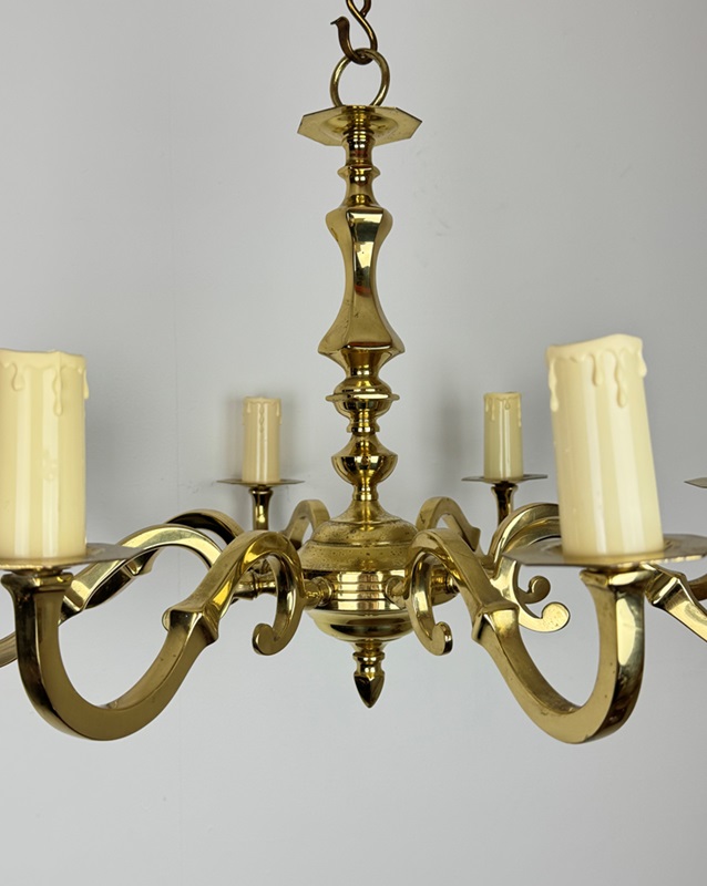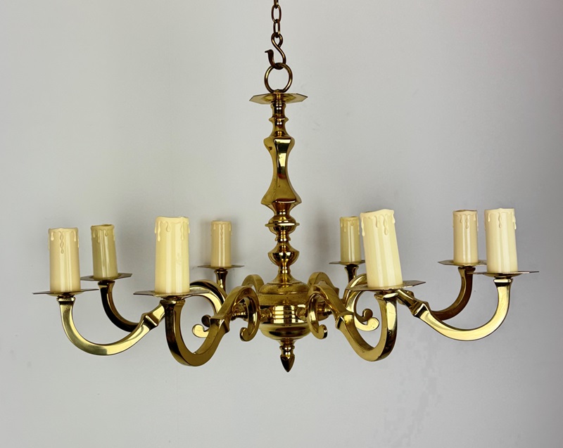 Please note that antique lighting may have some light age-related scratches and marks or slight manufacturing flaws. This chandelier shows some small marks and blemishes to brass finish.