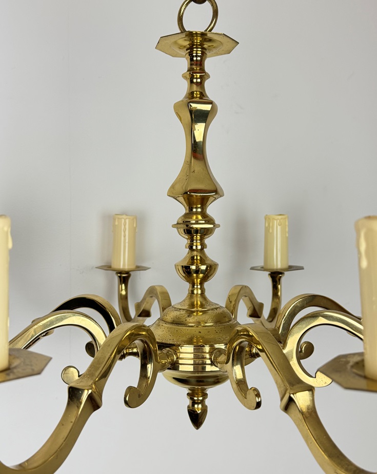 Displaying traditional styling, this solid brass chandelier has gently scrolled arms and a tall central column. Featuring hexagonal detail to the stem and the candle cups.