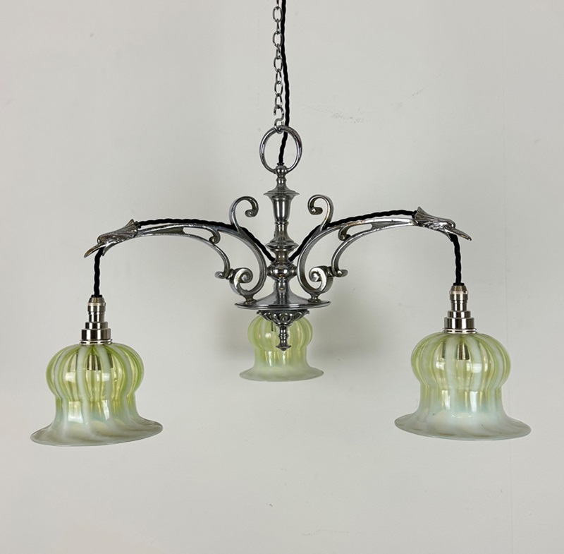 Fitted with striped opalescent glass shades. Hand made for us by a UK based glass blower.