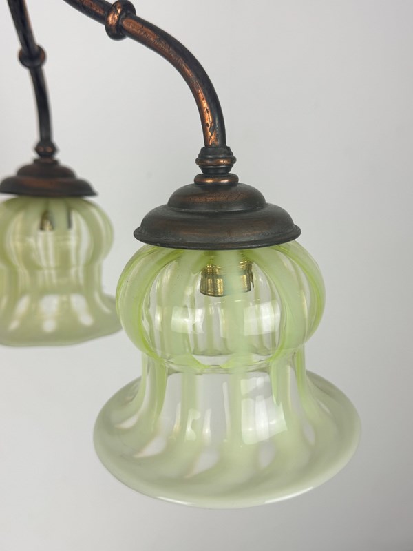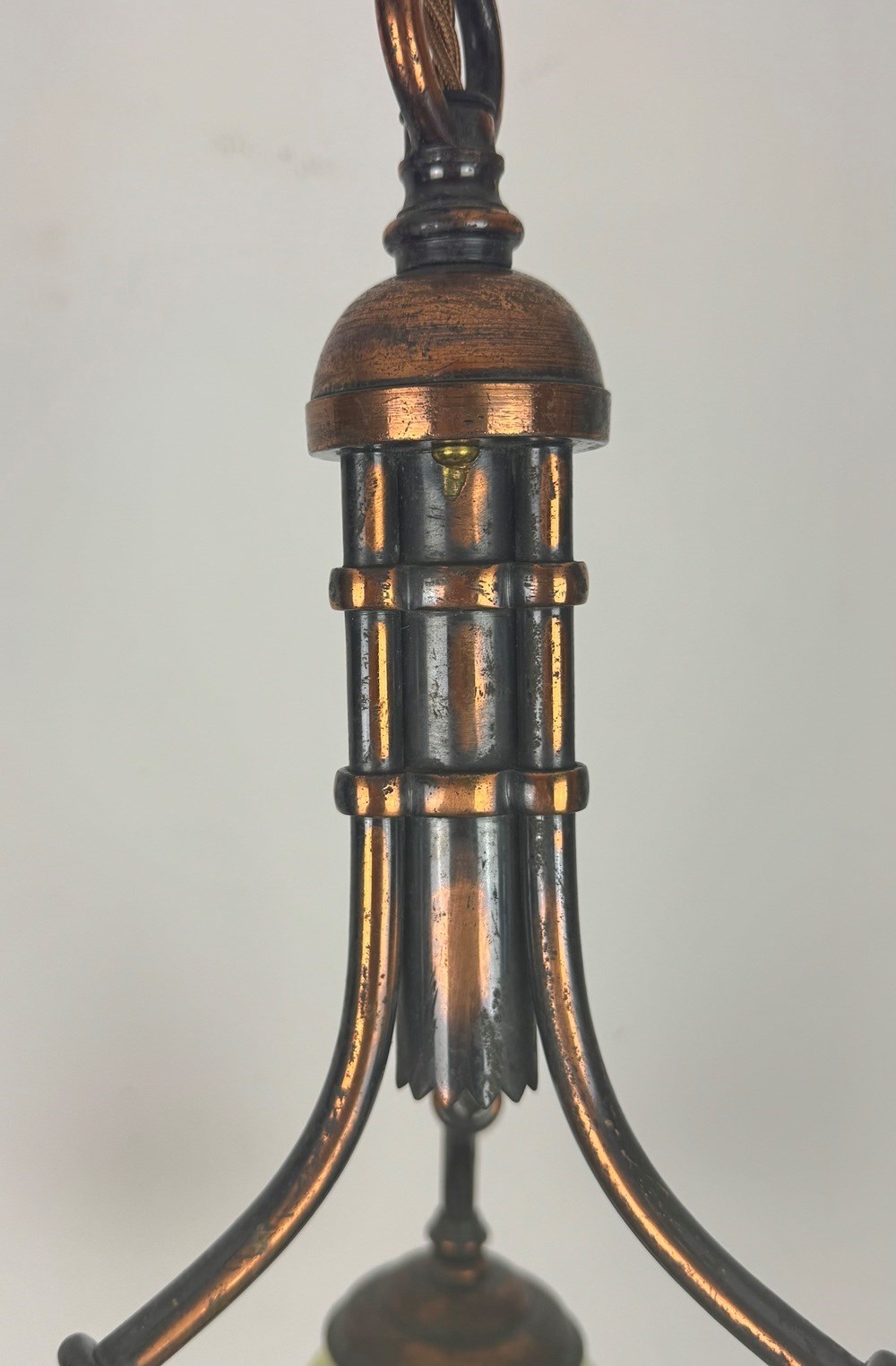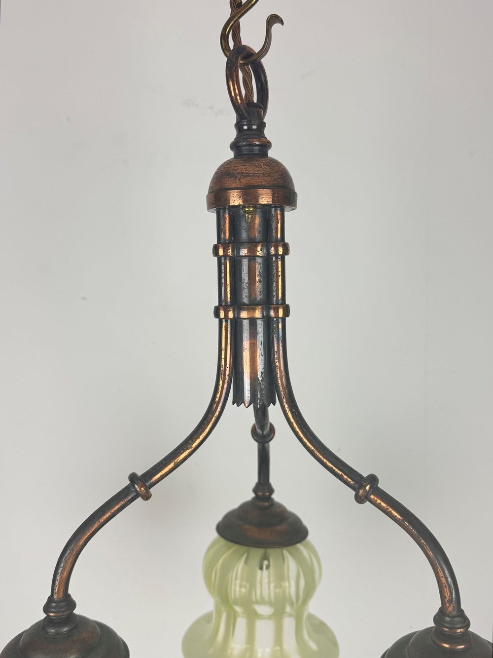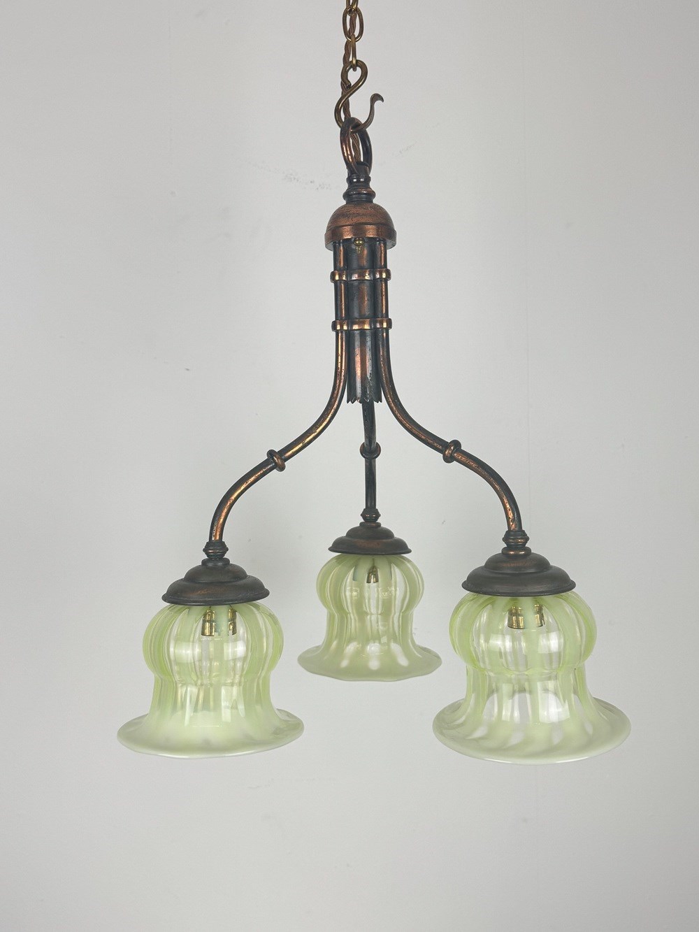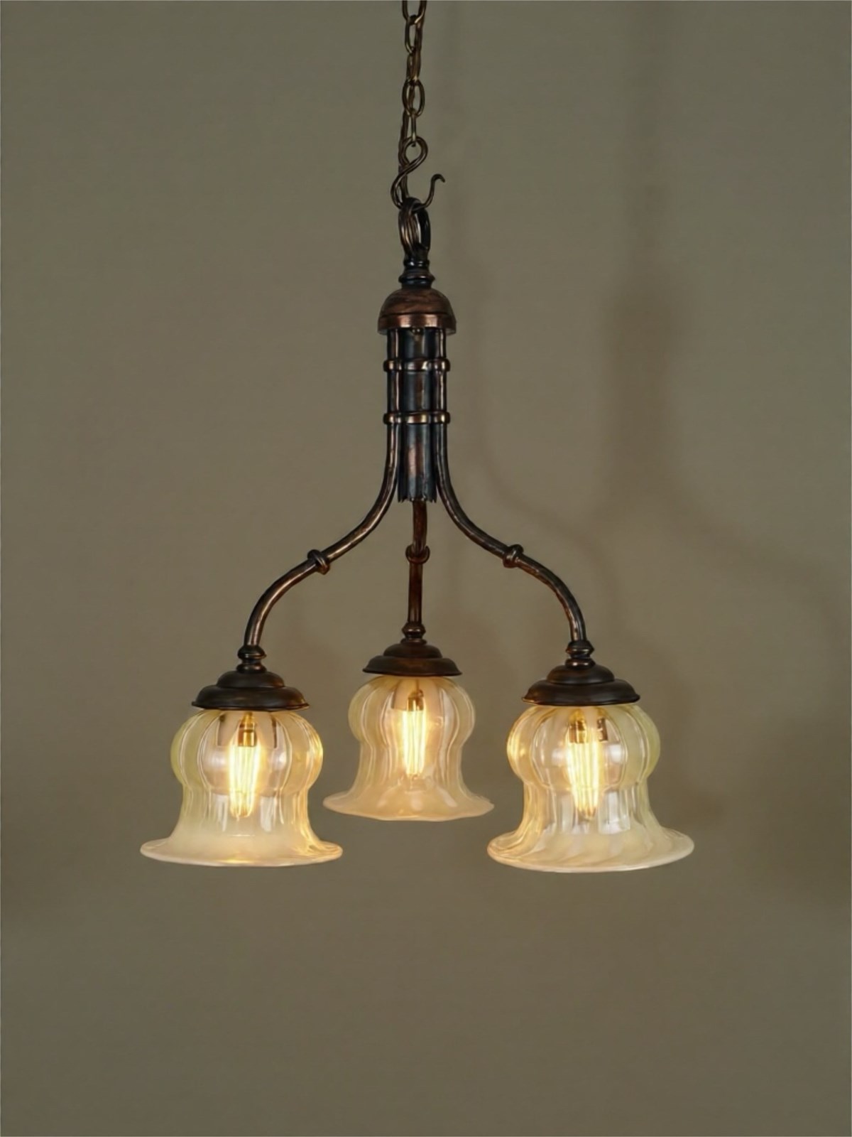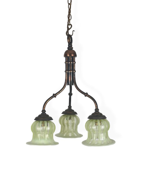 A small and delicate chandelier. The copper framework has a dark oxidized finish. The three arms are attractively bound to form the central stem.