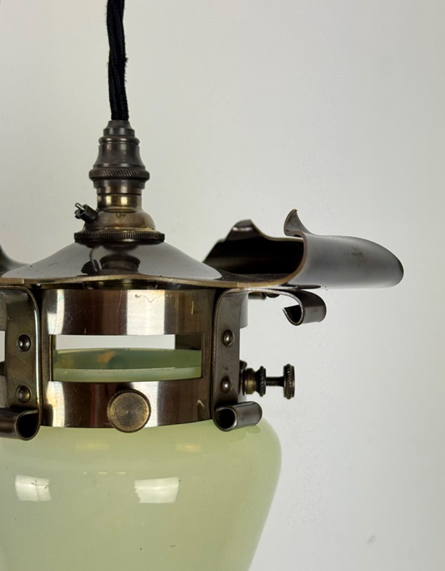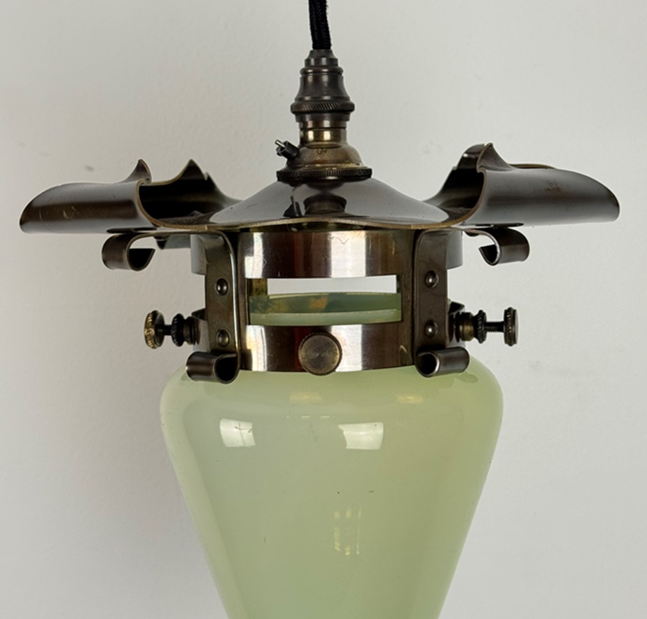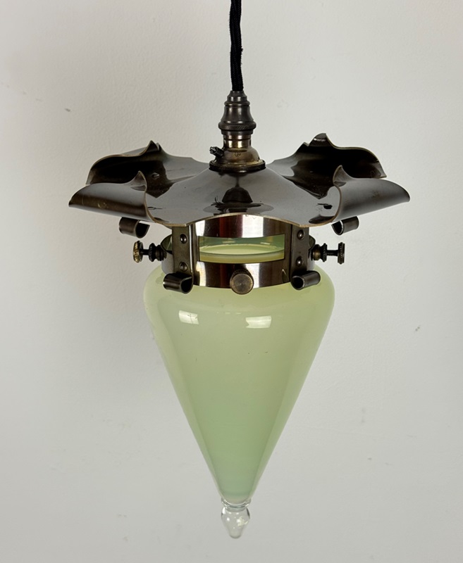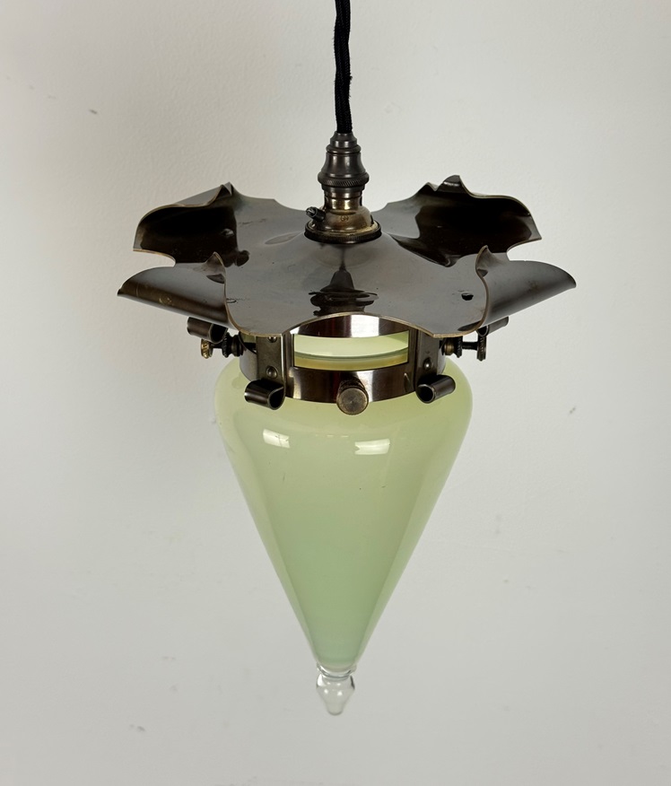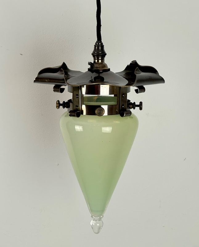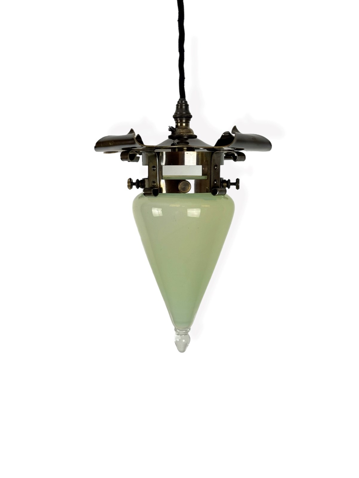 Cone shaped opalescent glass shade has been hand made for us by an English artisan glass blower.
