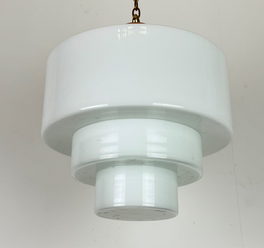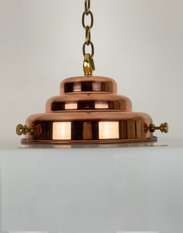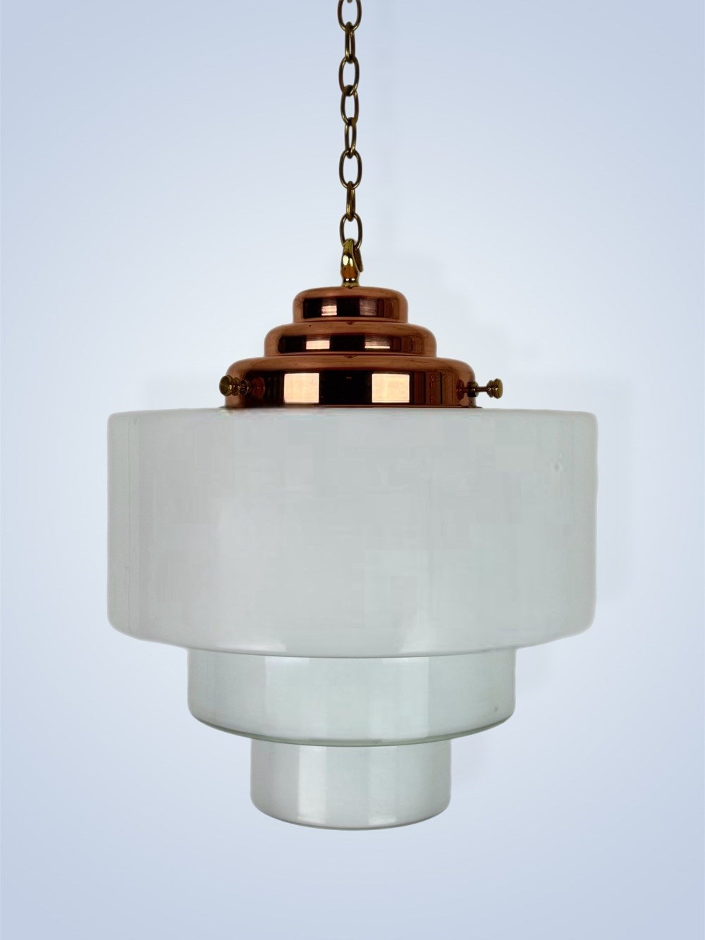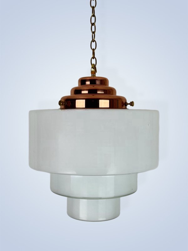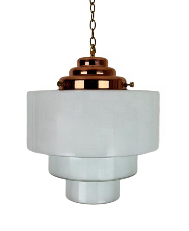 ‘Theo’ Large Stepped Opaline Pendant Light A bold, Art Deco style white glass shade featuring deep steps a deep steps in a geometric style greatly featured in the Art Deco period. Fitted with a polished copper gallery. Gallery is handmade in our South Derbyshire workshop. Also available in an antiqued copper finish. Please enquire prior to purchase. To help us distinguish between the huge variety of white Opaline glass lighting we stock, we have personalised each variation with it’s own name. This light has been named THEO. Size – 30cm diameter. 40cm high (from bottom of shade to top of gallery hook) Weight 3.9 kg Light will be wired to customer specifications. Price includes wiring with 1 metre of havana brown braided triple flex. There is a wide choice of colours available if you wished to discuss alternatives. Additional length of cable available at a small extra cost. Price includes chain and hooked ceiling plate. Lights are rewired using a new B22 bulb holder and will be independently PAT tested prior to dispatch. Bulb not supplied. We recommend an LED bulb. Please allow 7 working days for dispatch. Please note that vintage lighting may have some light age-related scratches and marks or slight manufacturing flaws. If you live outside of the United Kingdom and are interested in buying this item, please email us and we will be happy to obtain a postage estimate for you.