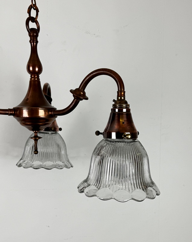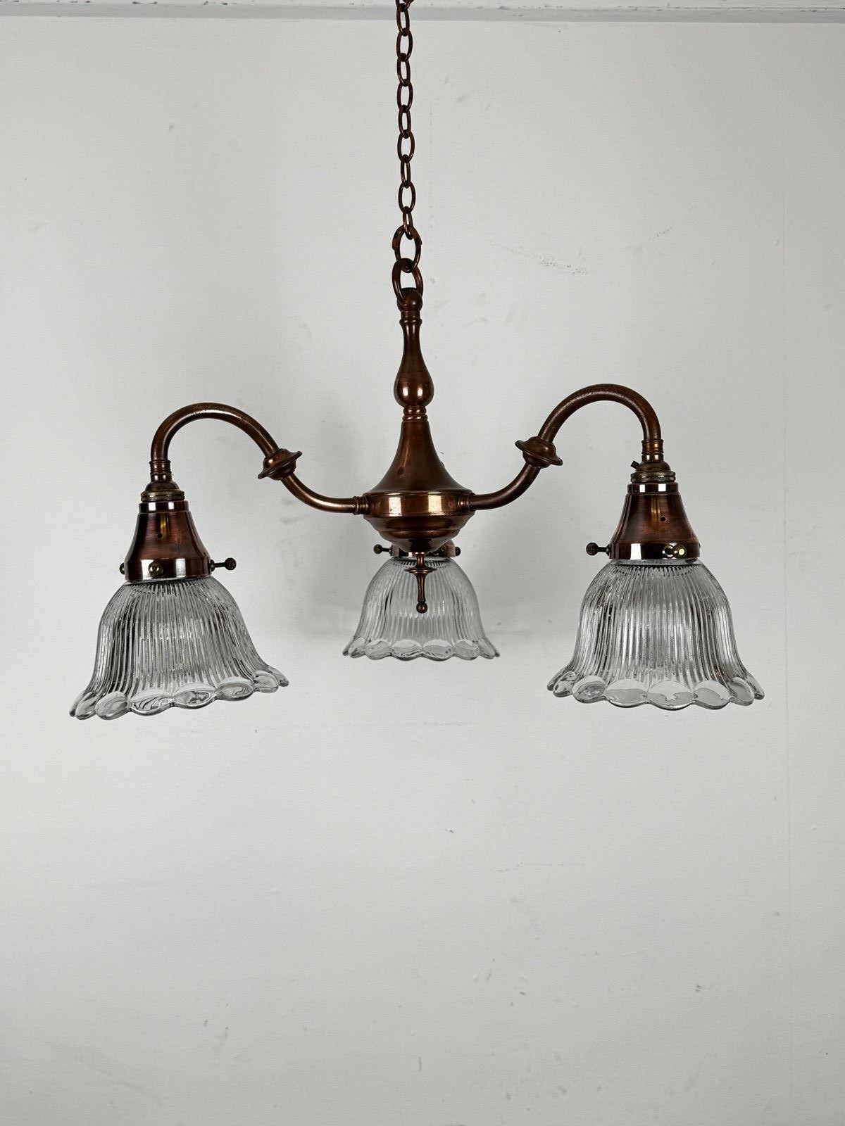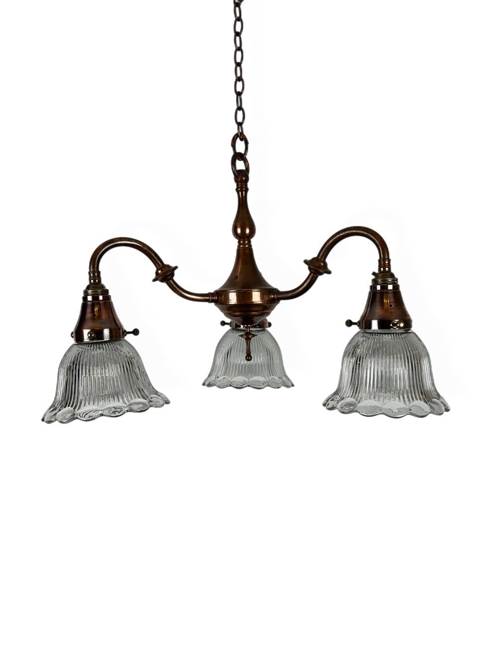 An early 20th century copper chandelier with a dark antiqued finish. Fitted with antique Holophane glass shades with frilled and patterned edge.