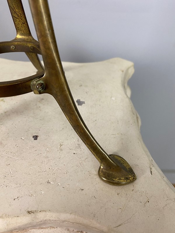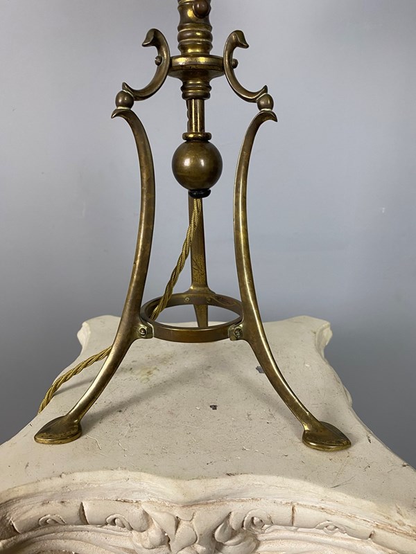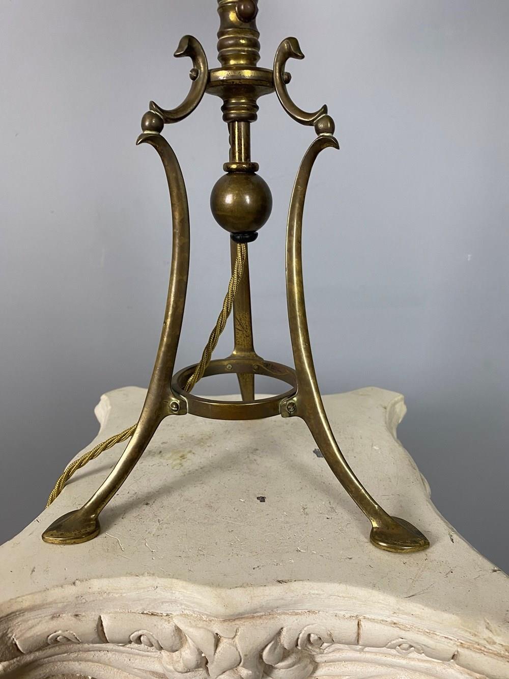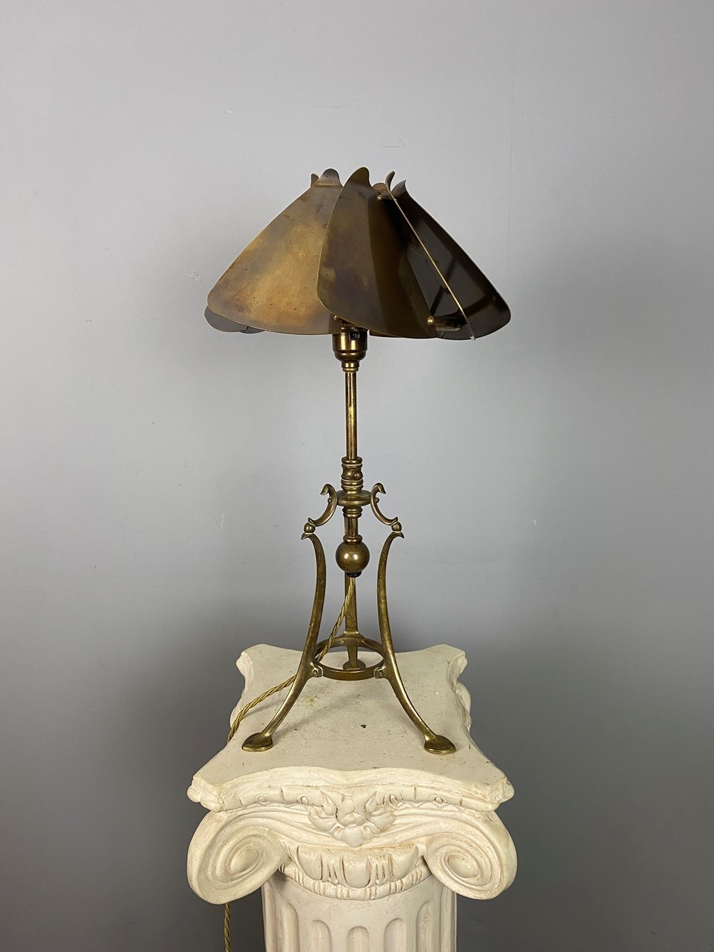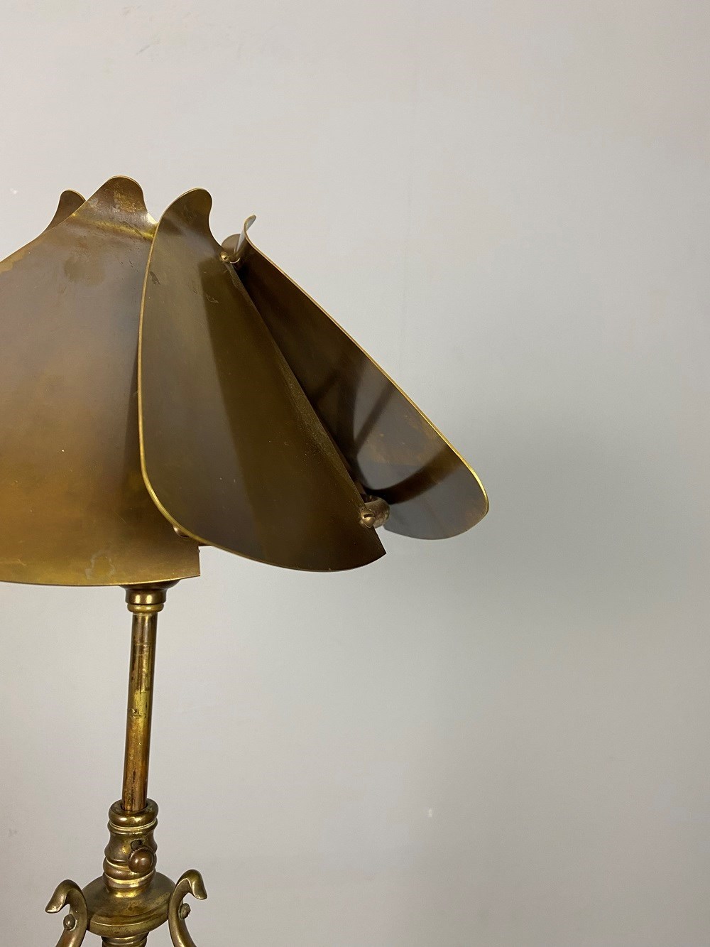 Manufactured from brass with a dark antique finish, the lamp base is simply designed with a tripod base bearing the classic Benson leaf foot.