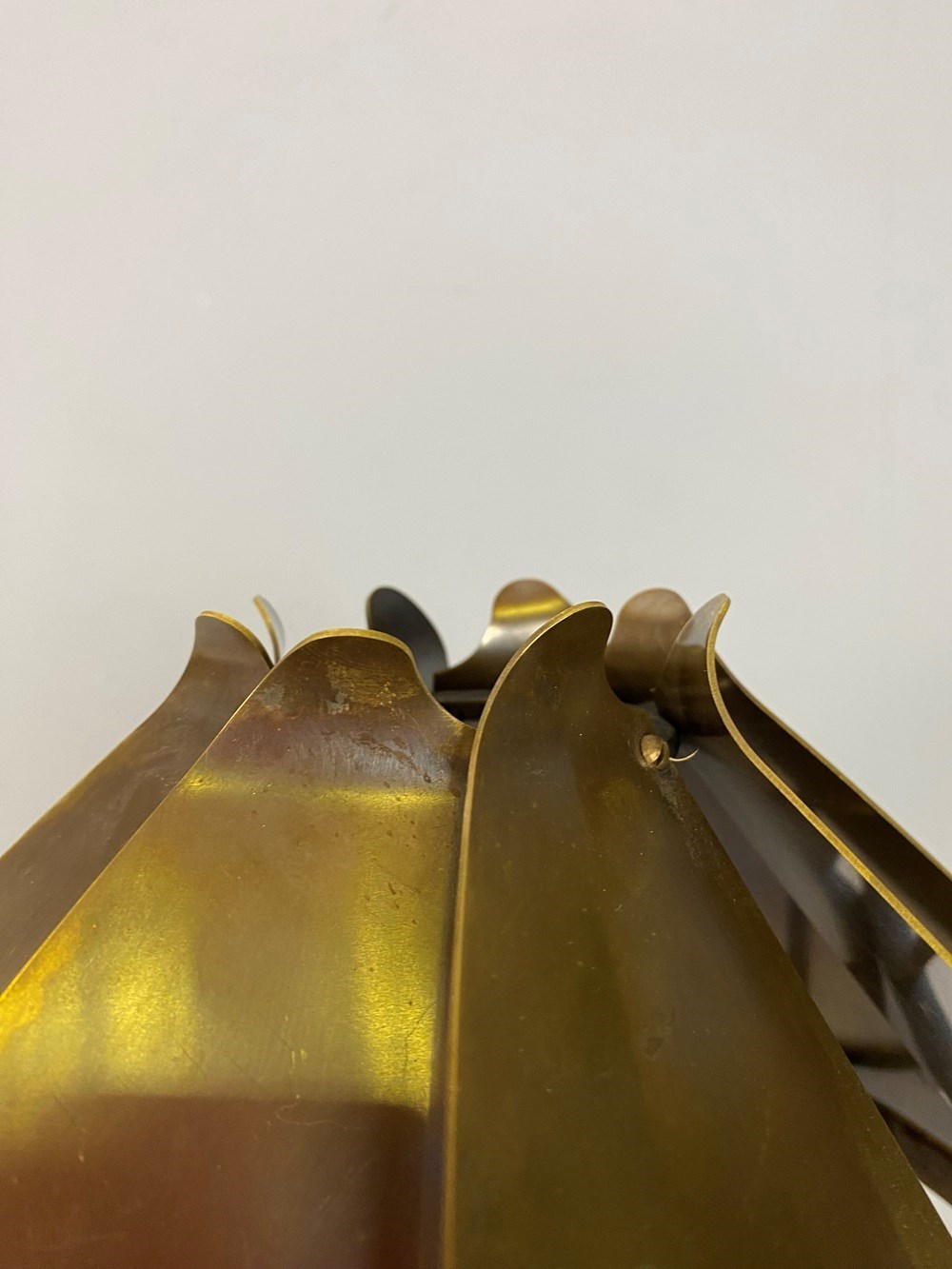 The shade has been constructed in our South Derbyshire workshop. Eight sections of brass are configured at a precise angle to form a symetrical shade. William Benson designed the original shade out of a desire to create a shade which conceal the light source yet would filter the light through