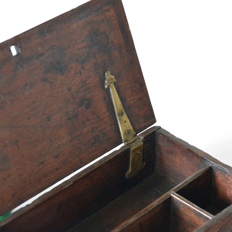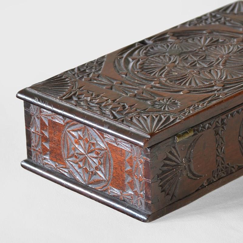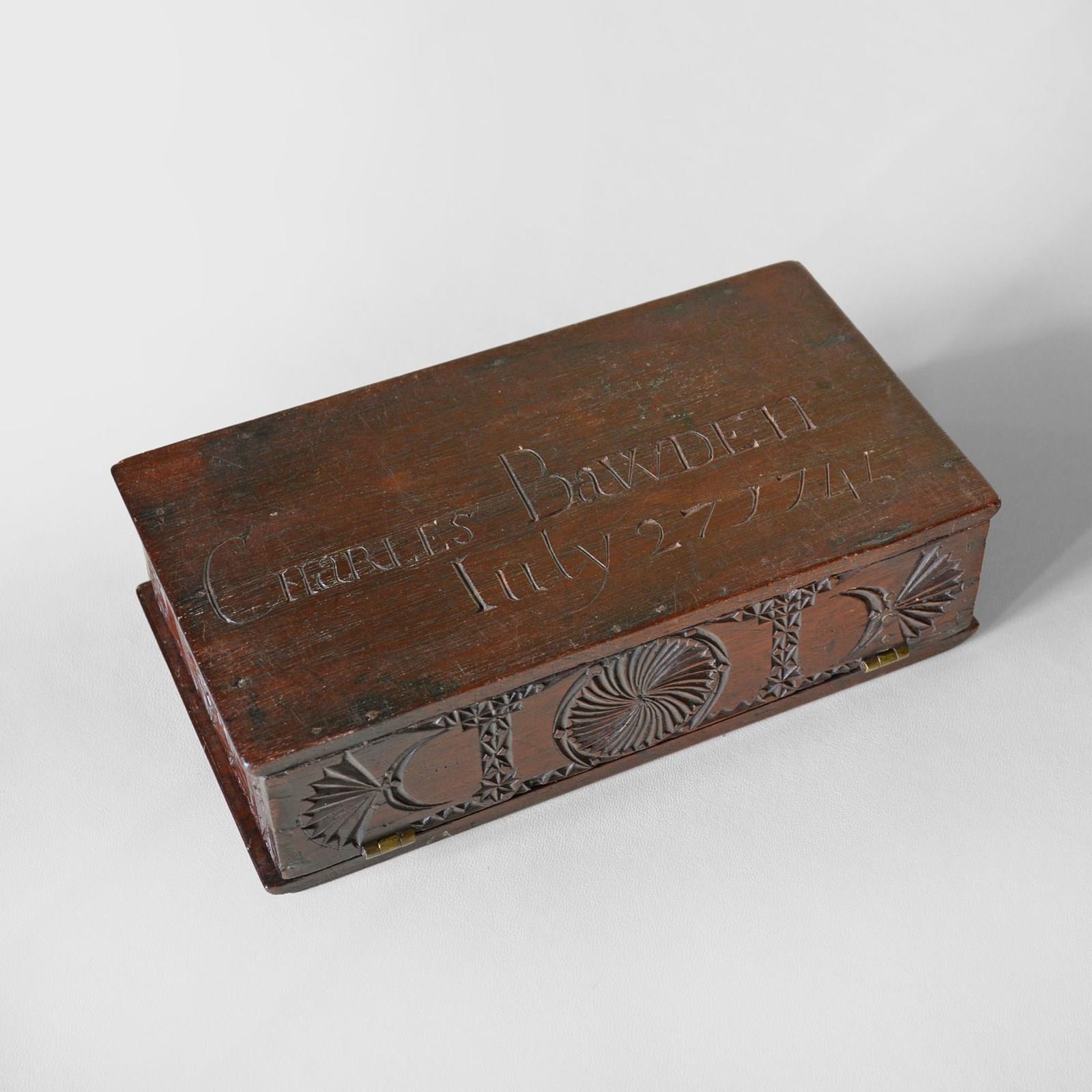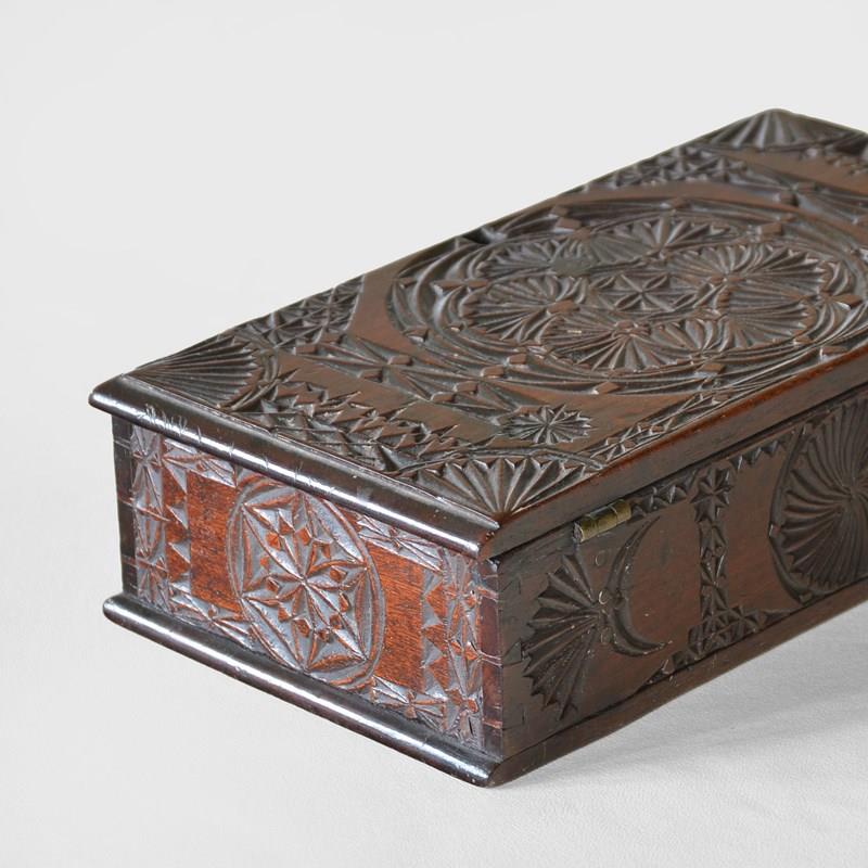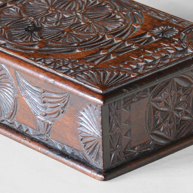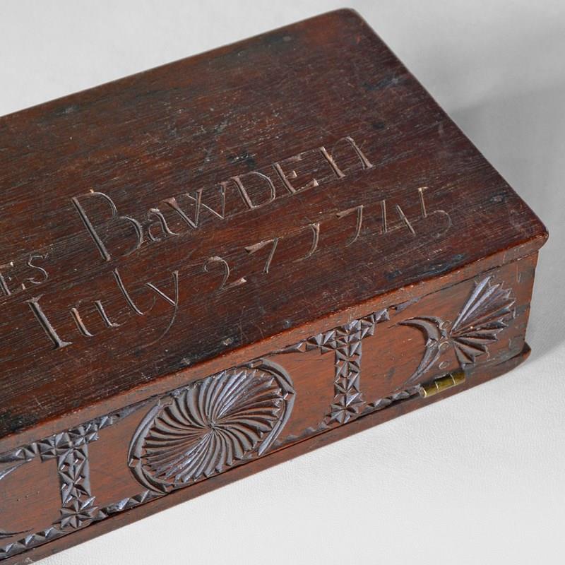 These boxes are frequently dated to the mid 17th century; however this one is inscribed to the base, 'Charles Bawden July 27 1745' one is kept wondering about the relevance of the day and the date and if it is contemporary or added at a later date. Bawden being a Celtic name that is often associated with Cornwall.