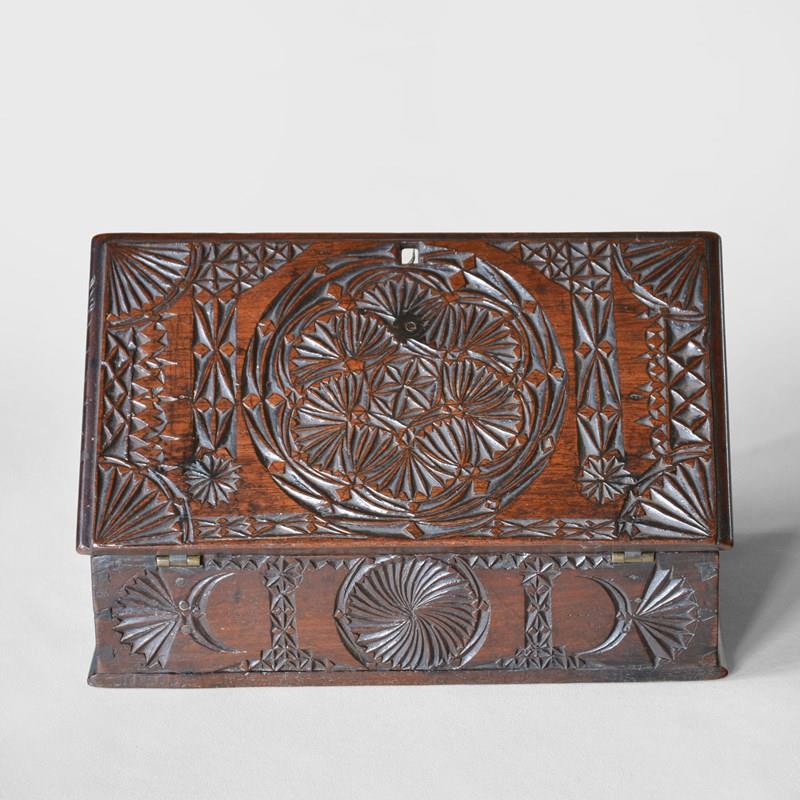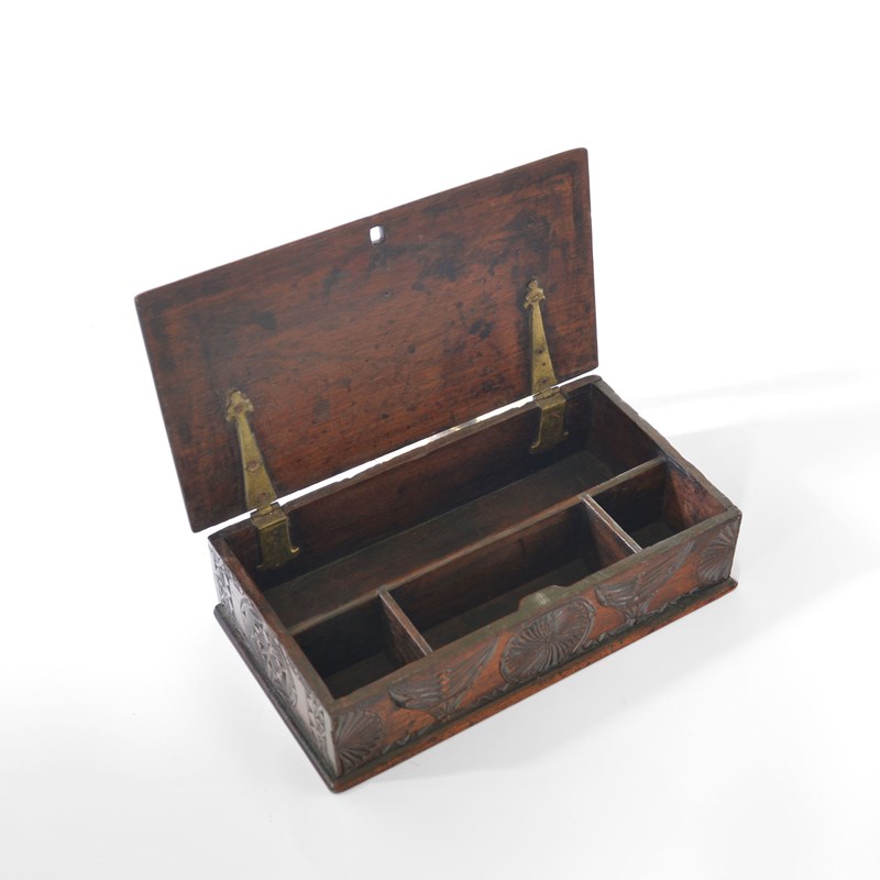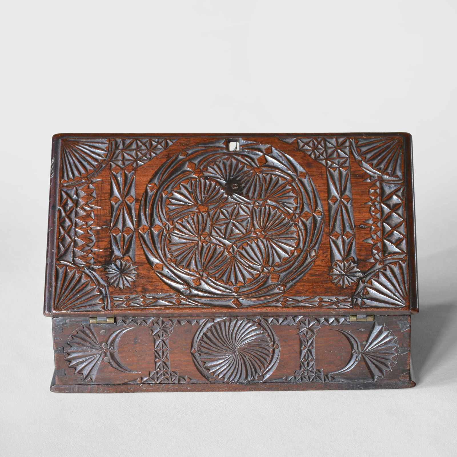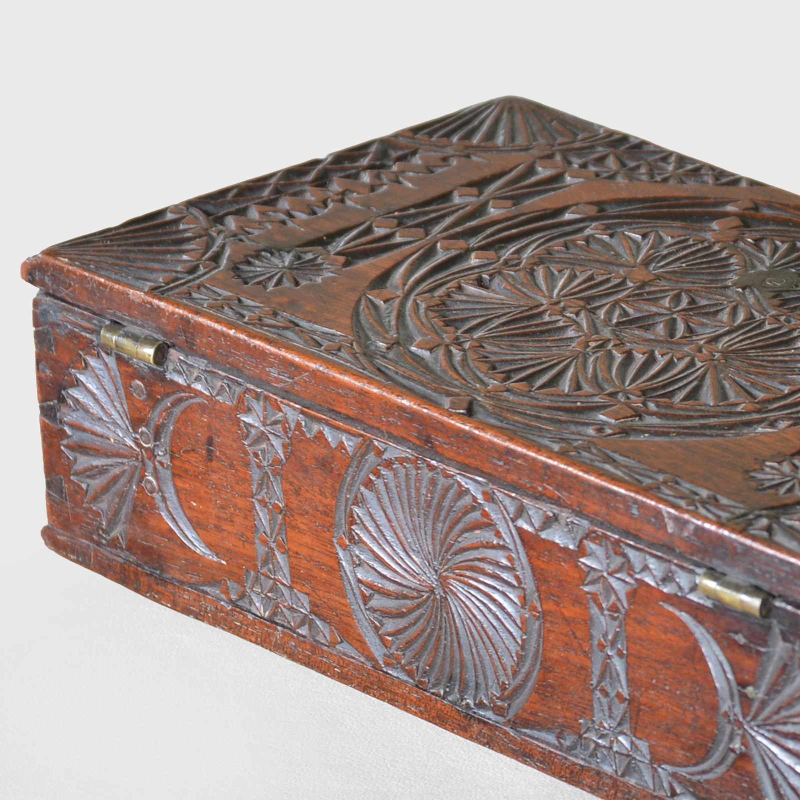 With chip carving extending over the top and to all four sides. The lid opens on a very fine pair of brass strap work hinges to an interior with divisions for writing implements, inkwell and sander. Inscribed to the base 'Charles Bawden July 27 1745'.