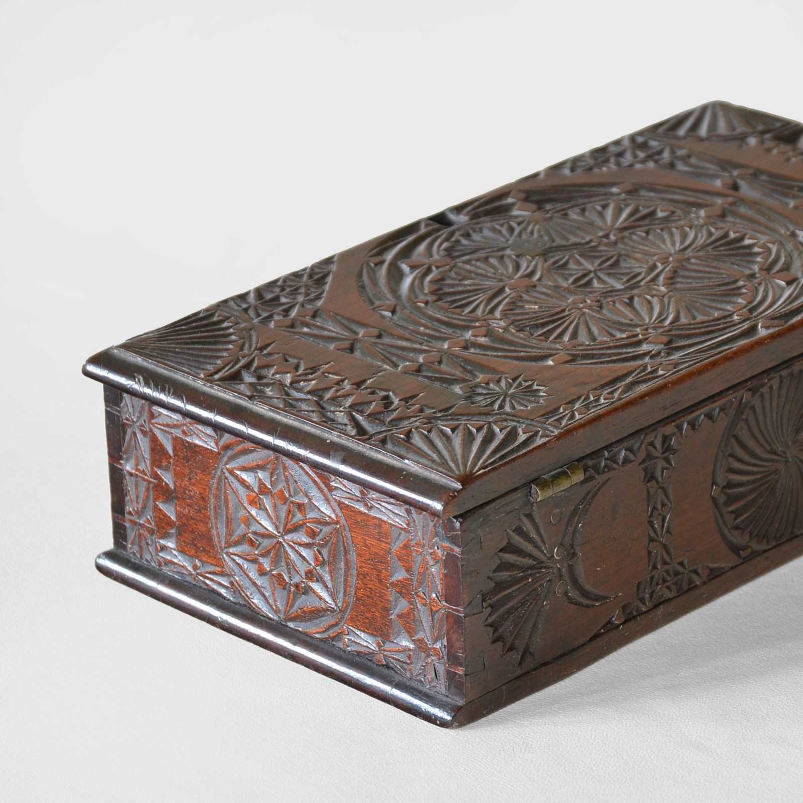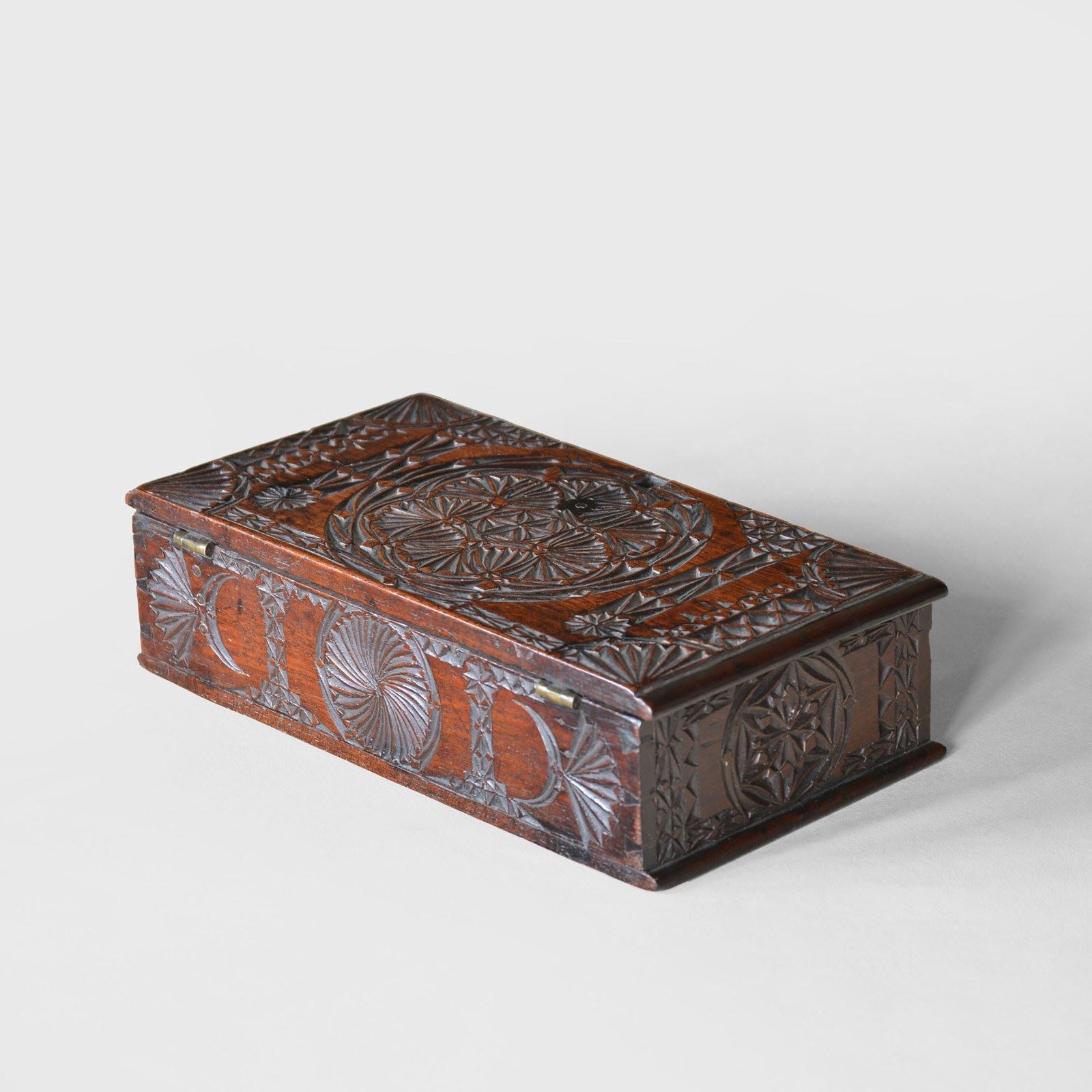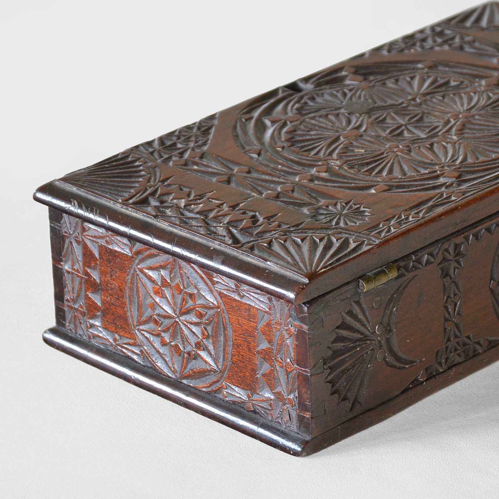 With chip carving extending over the top and to all four sides. The lid opens on a very fine pair of brass strap work hinges to an interior with divisions for writing implements, inkwell and sander. Inscribed to the base 'Charles Bawden July 27 1745'.