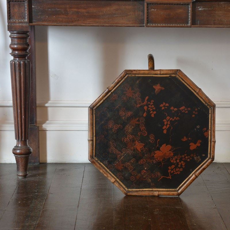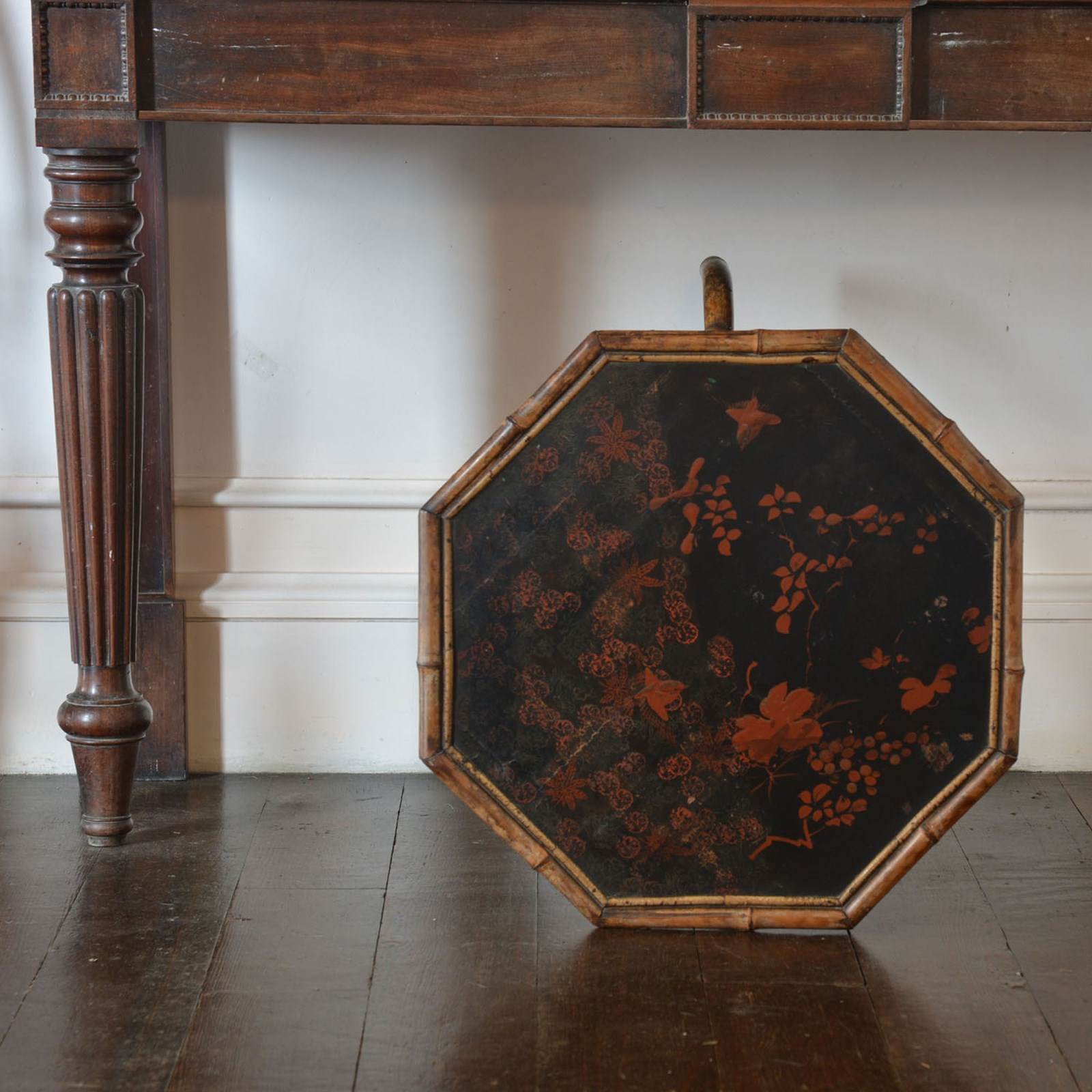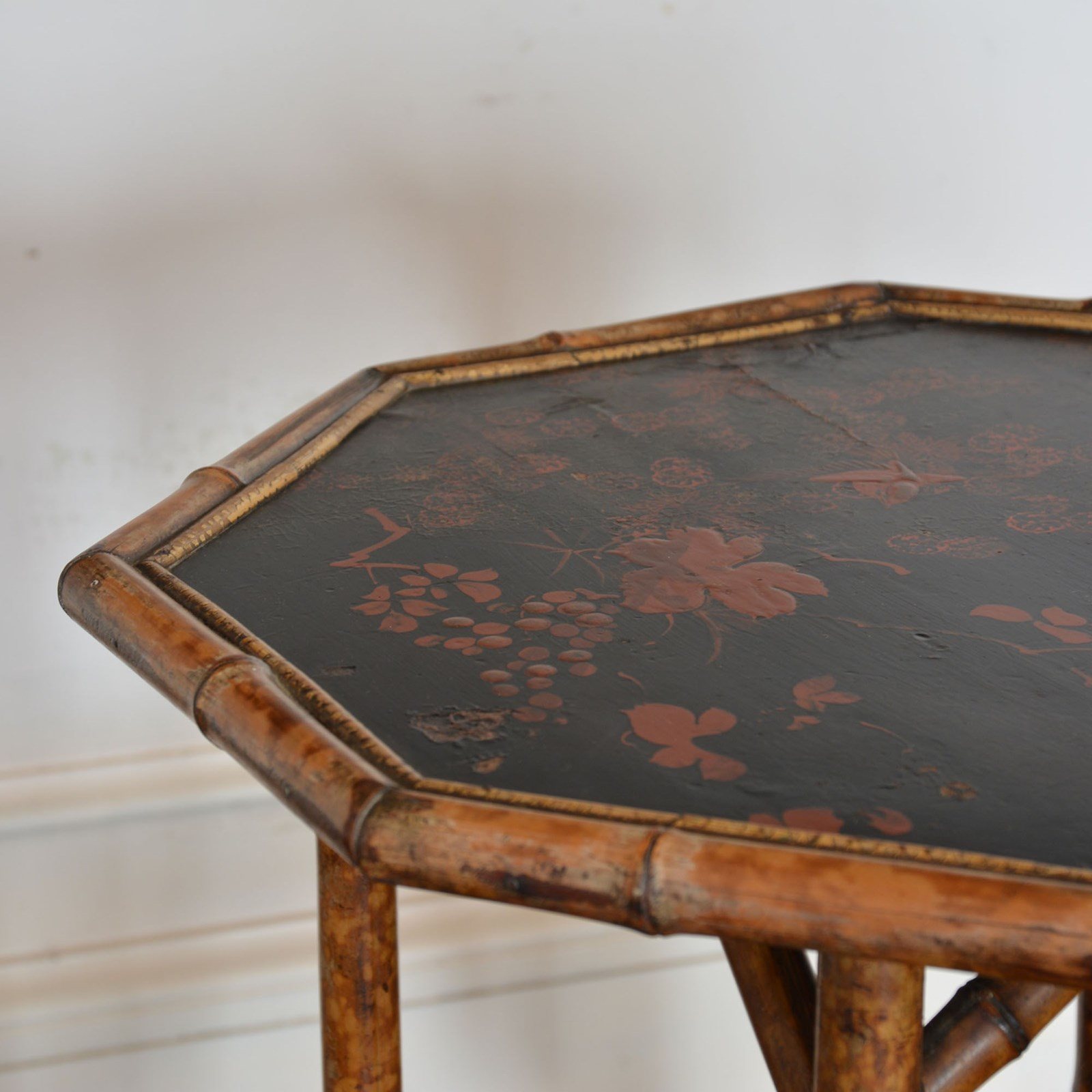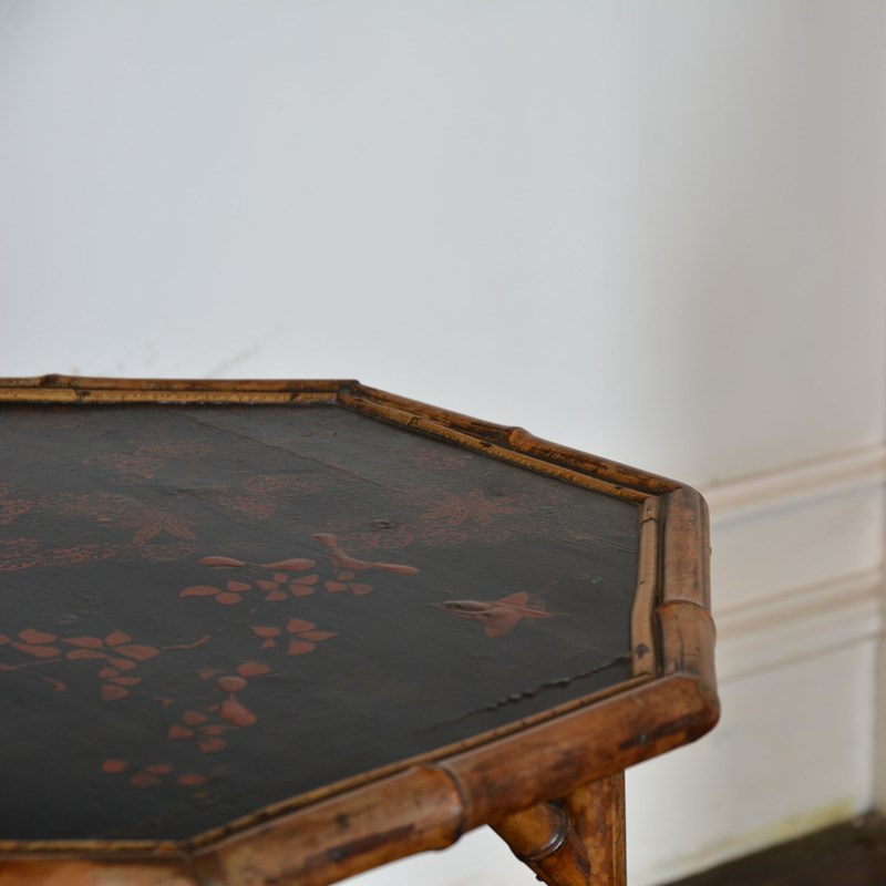 With decorated lacquer top, the swept legs united by an ebonised roundel.