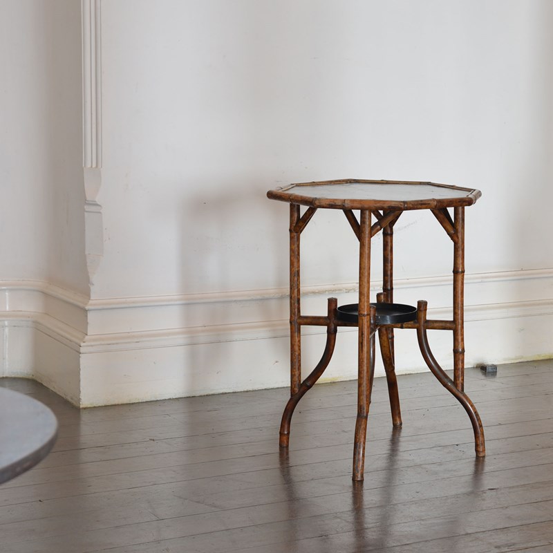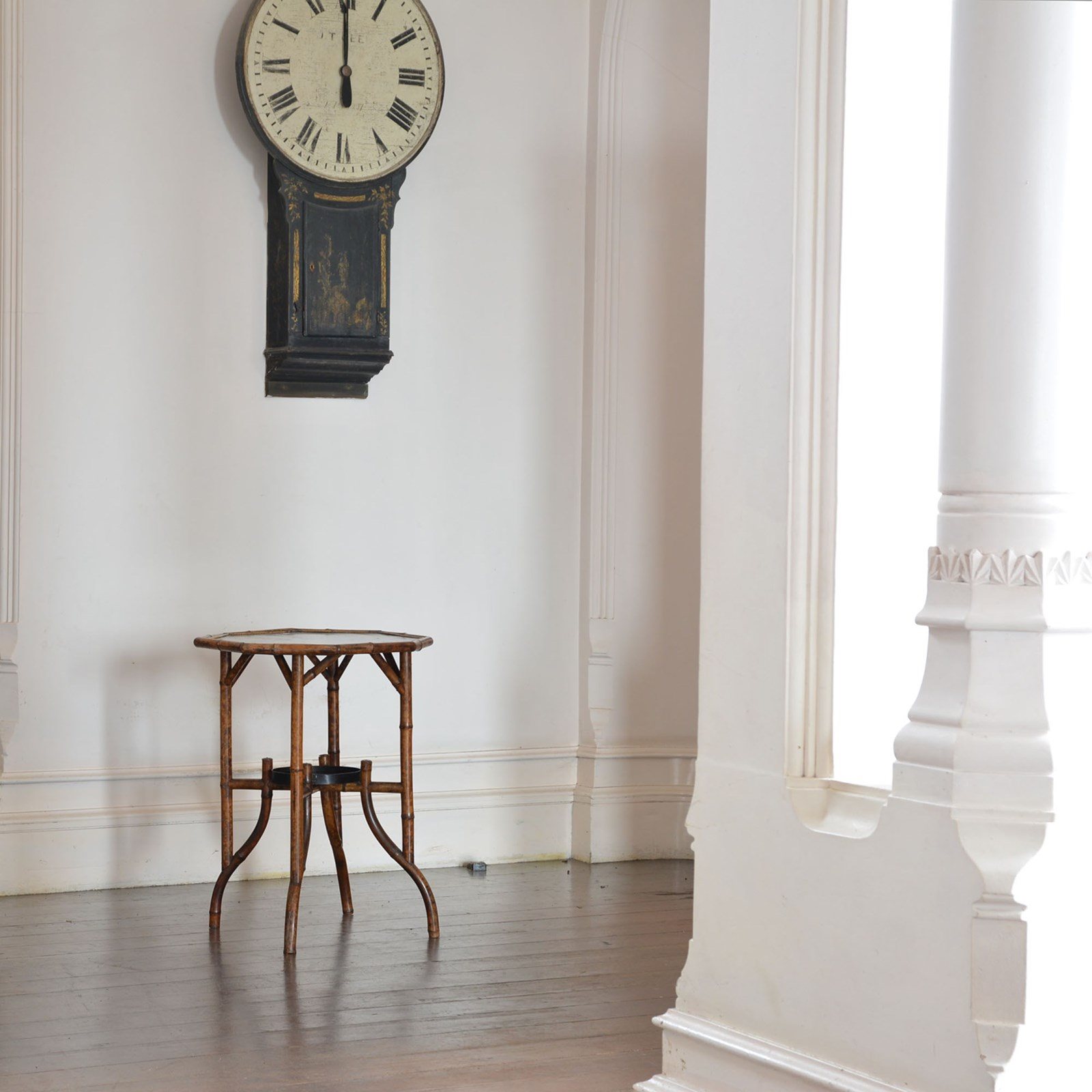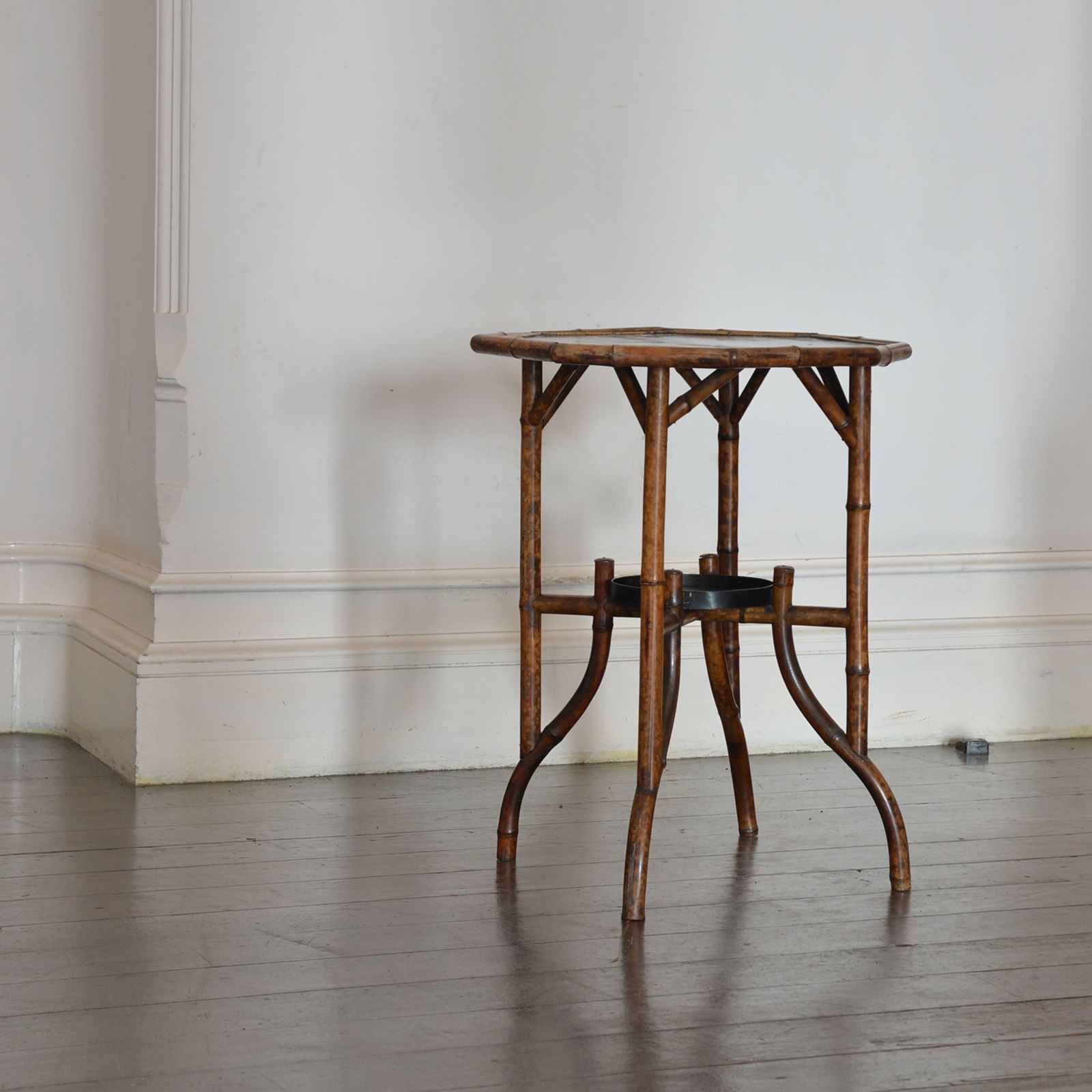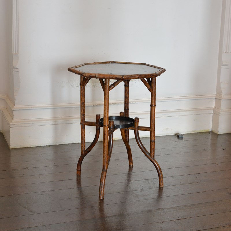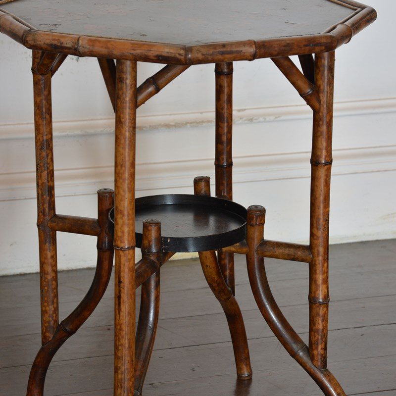 With decorated lacquer top, the swept legs united by an ebonised roundel.