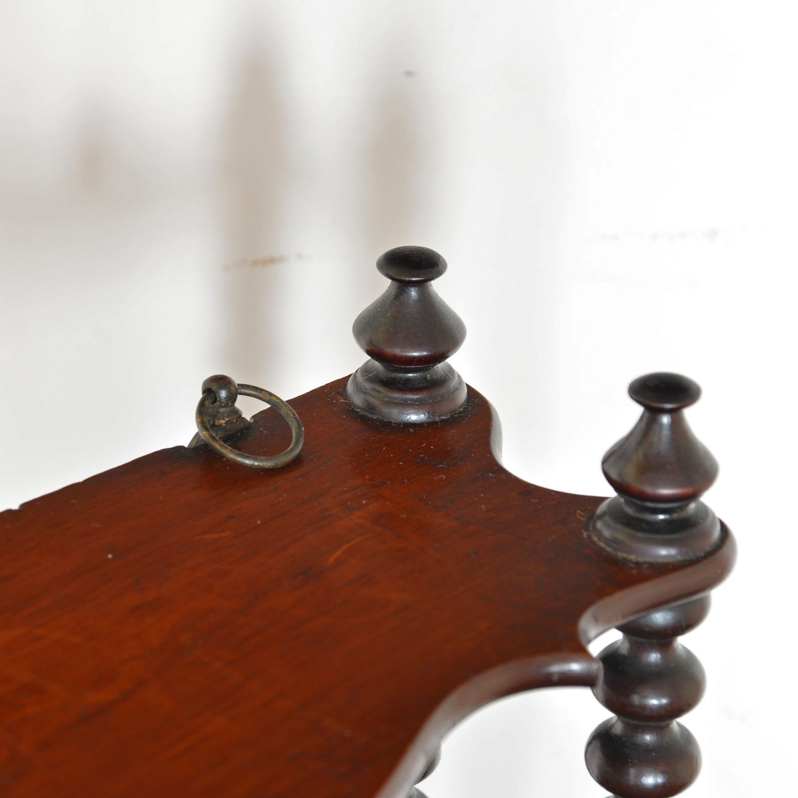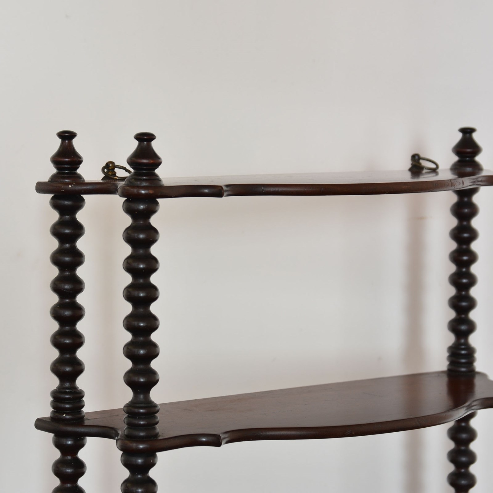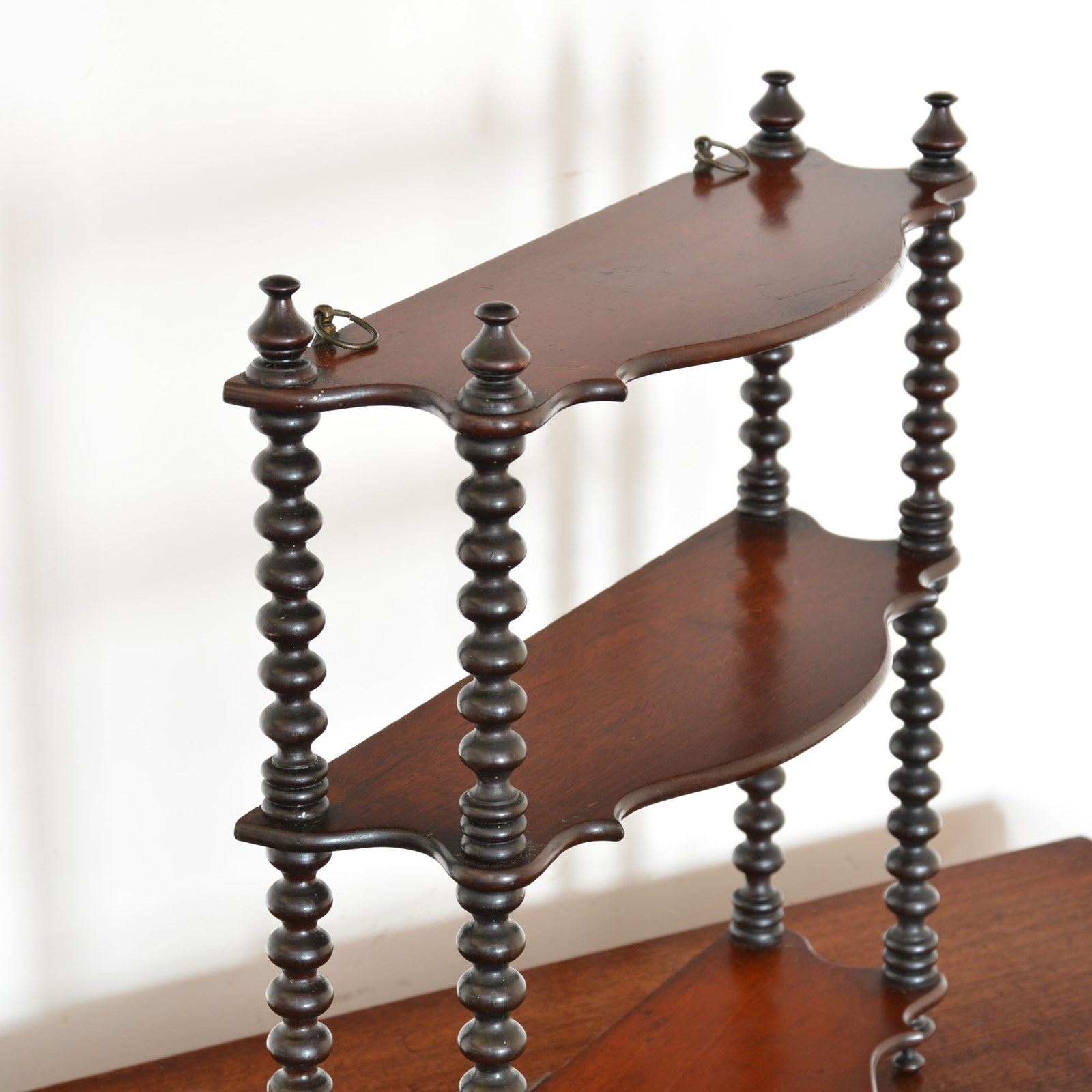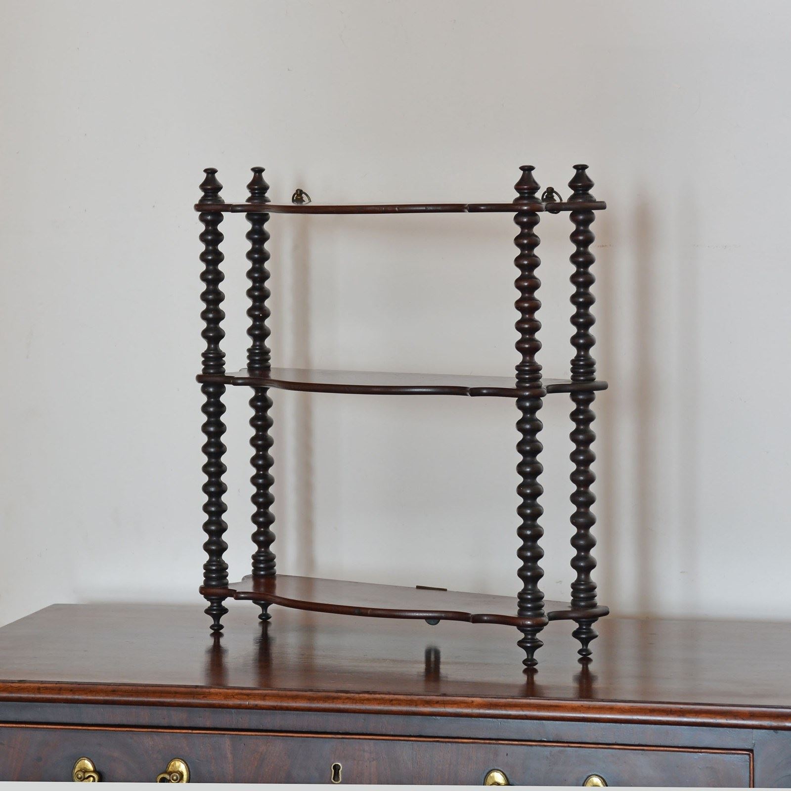 Three tier serpentine fronted hanging shelves with fine bobbin turned supports and a pair of brass hanging rings.