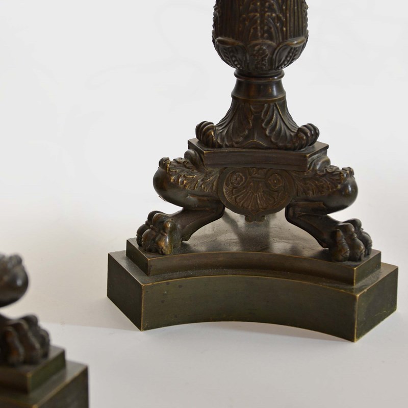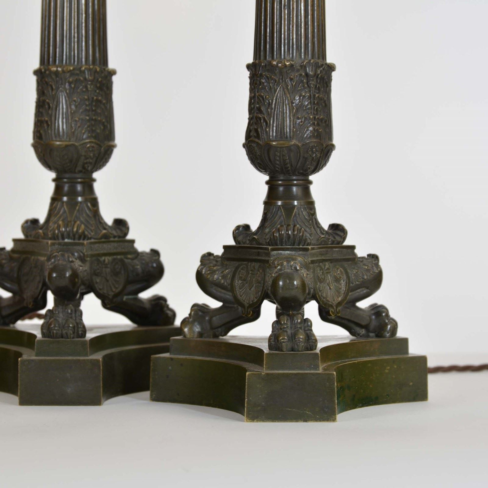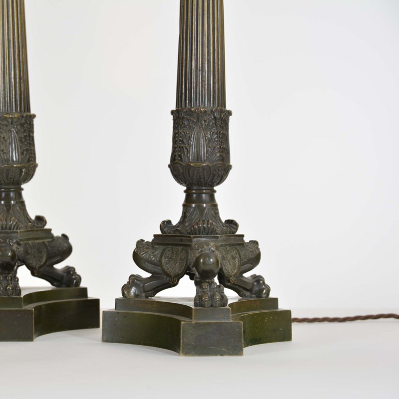 The capitols with acanthus collars over tapered fluted columns to tripartite lion's paw feet and plinth bases. Rewired with braided flex and PAT tested.