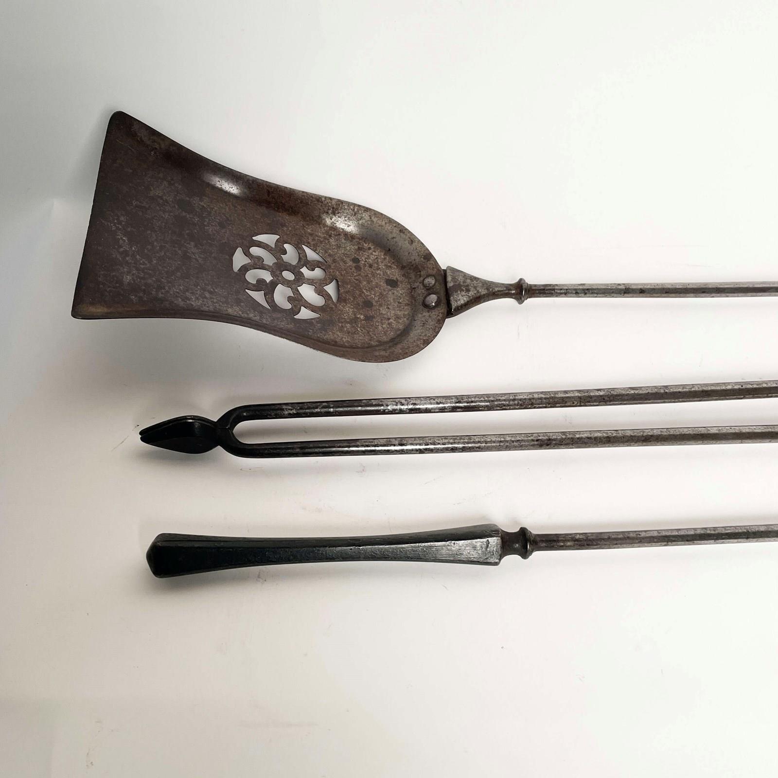 A set of 3 Georgian steel and gilt brass fire irons, comprising tongs, poker and shovel, all with gilt brass handles, the shovel has a pierced brass blade. All of good colour and patination.