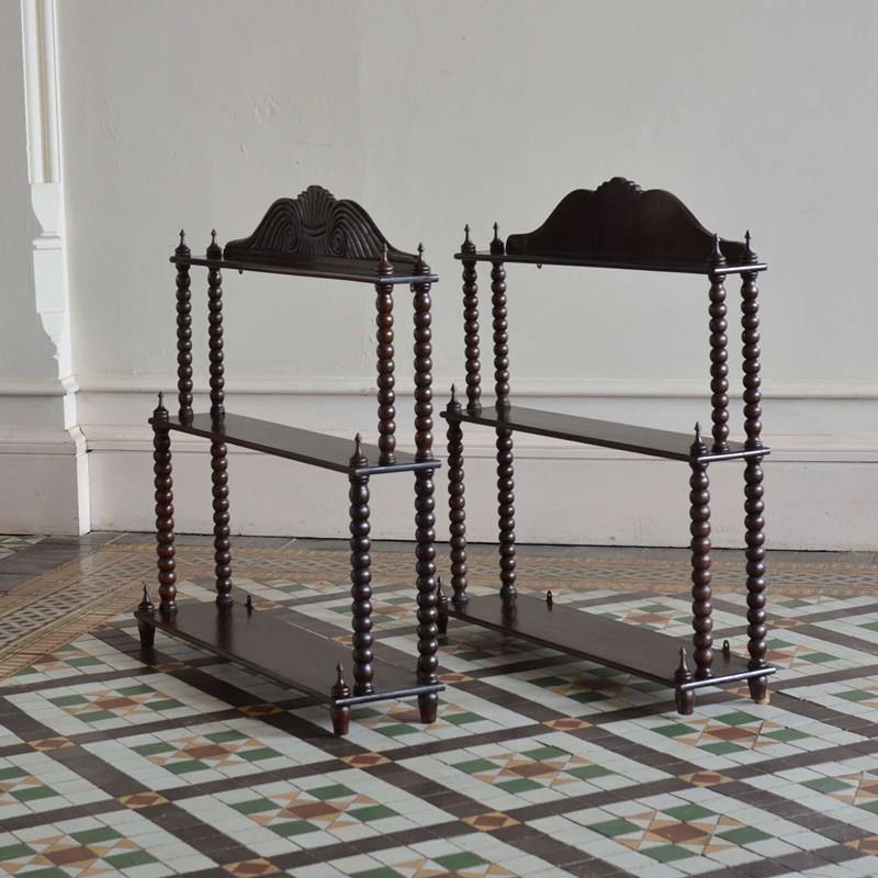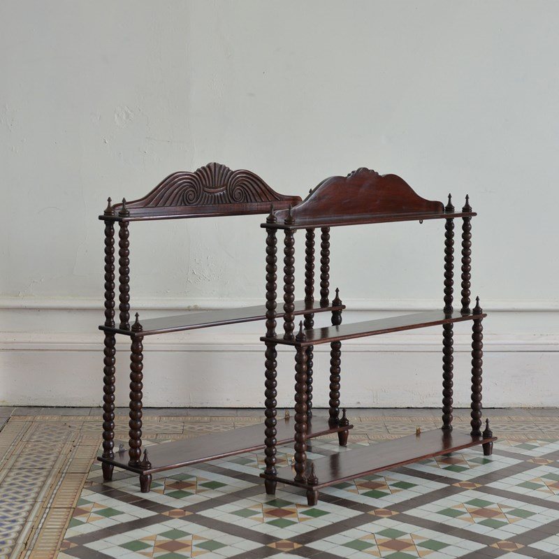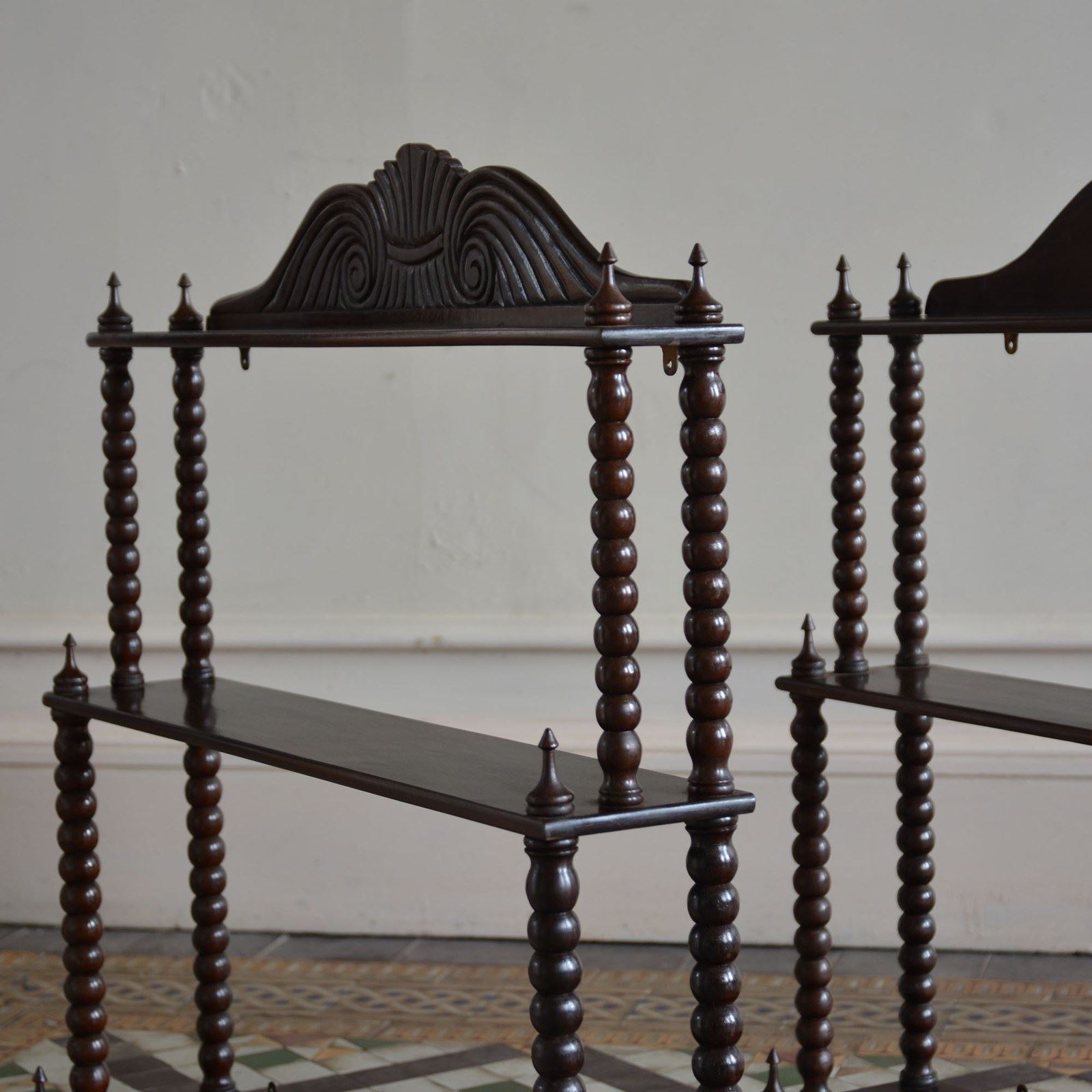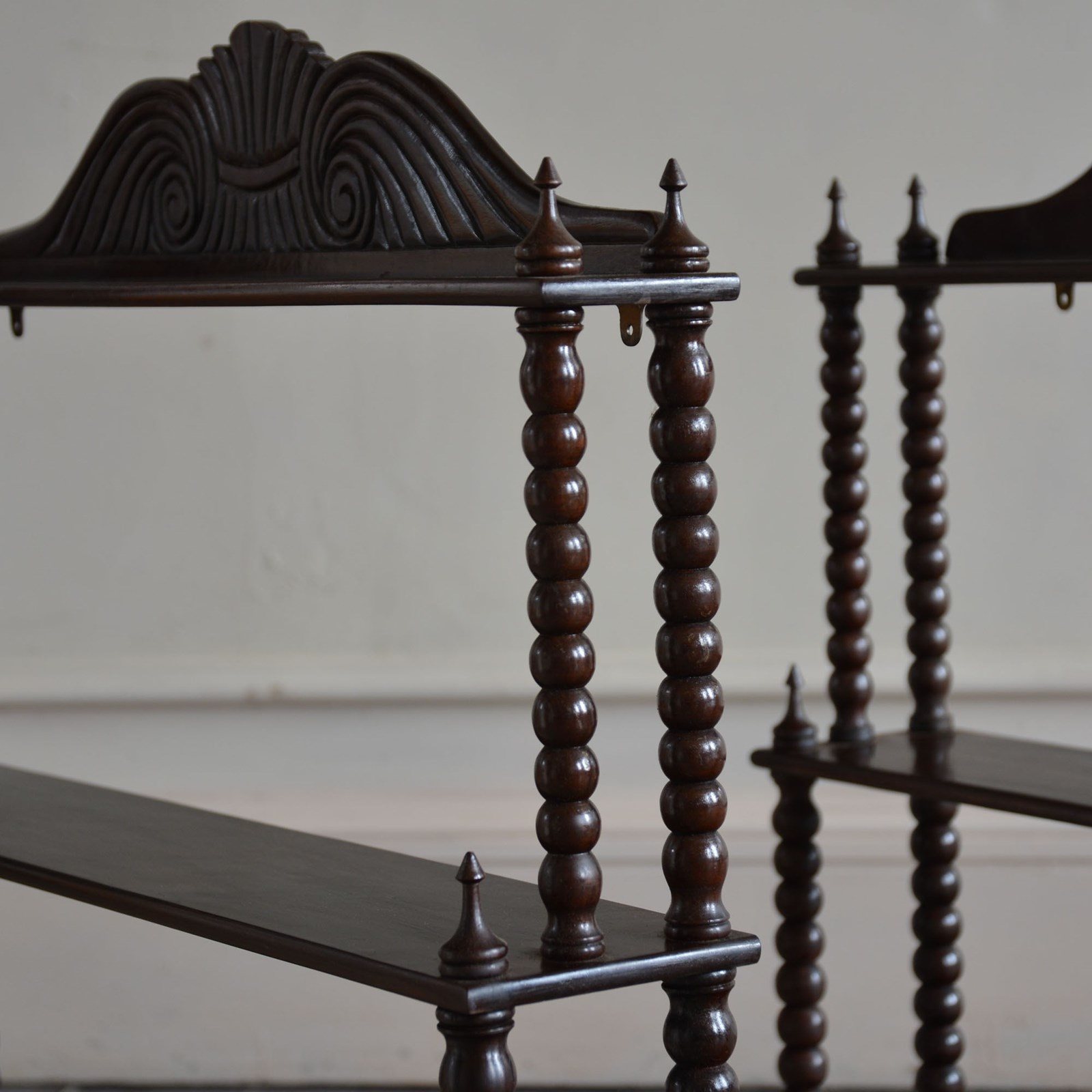 Two similar sets of bobbin shelves.Three tier pot waterfall shelves with bobbin turned spindles, both with an arched cresting rail,one carved, both stand on turned feet and the brass hanging brackets.