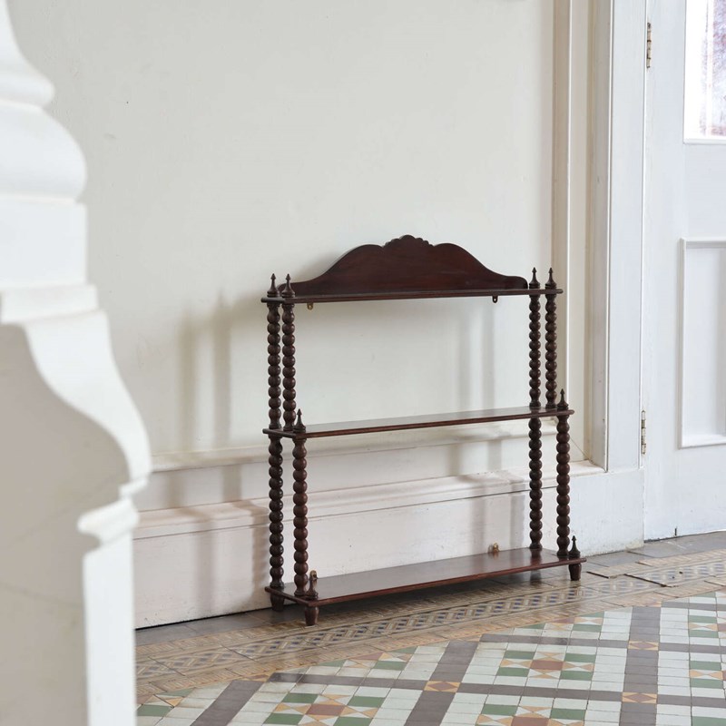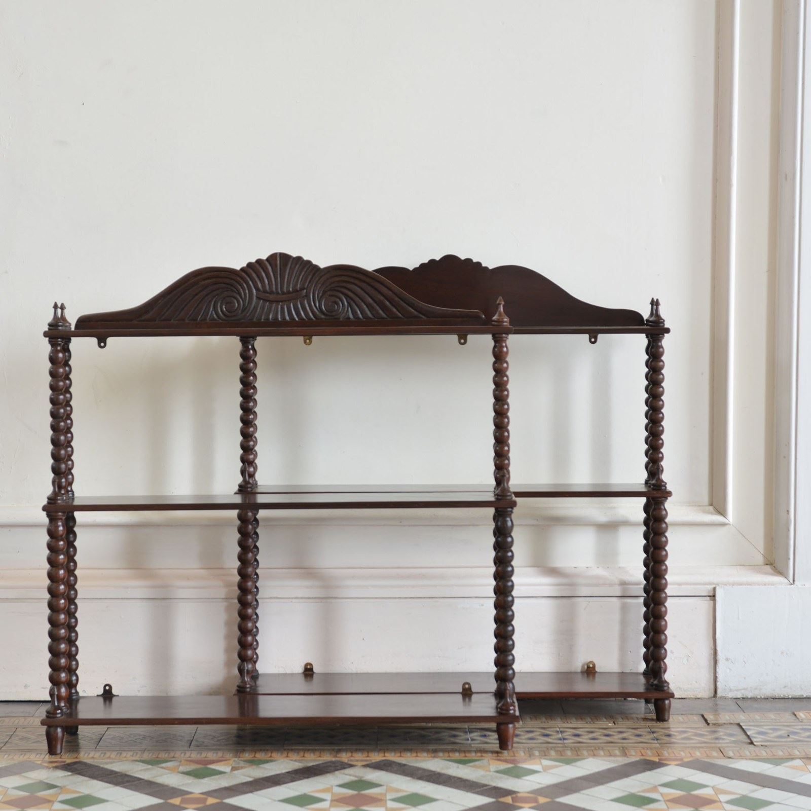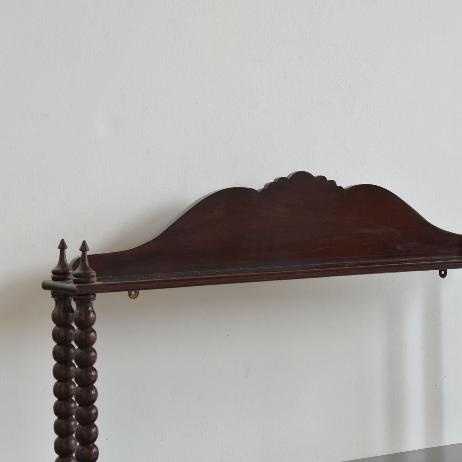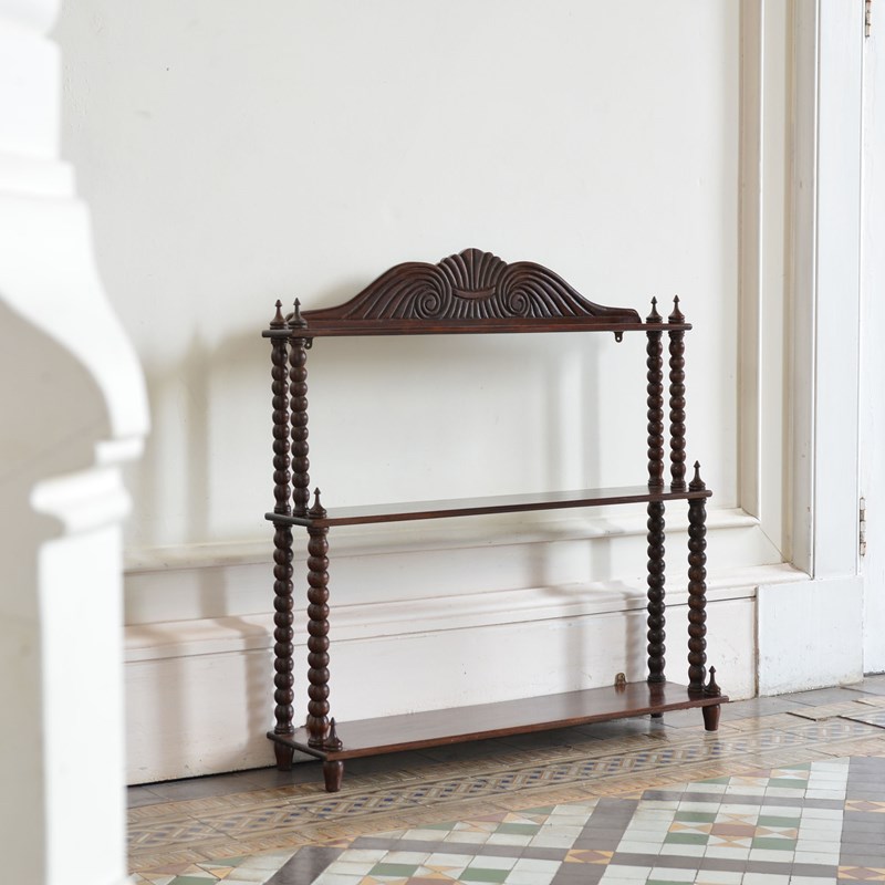 Two similar sets of bobbin shelves.Three tier pot waterfall shelves with bobbin turned spindles, both with an arched cresting rail,one carved, both stand on turned feet and the brass hanging brackets.