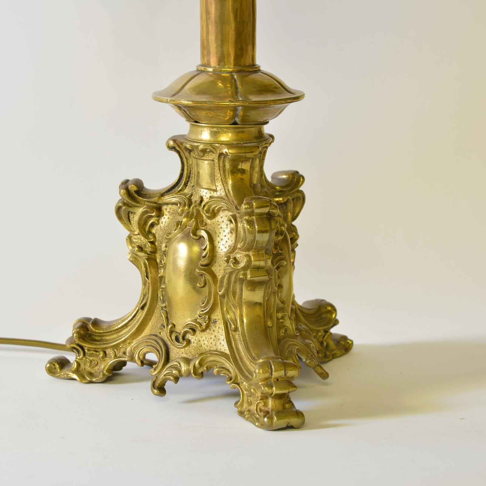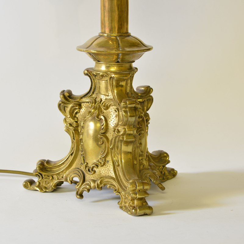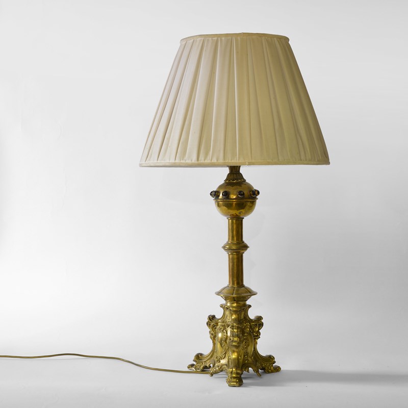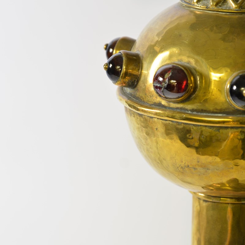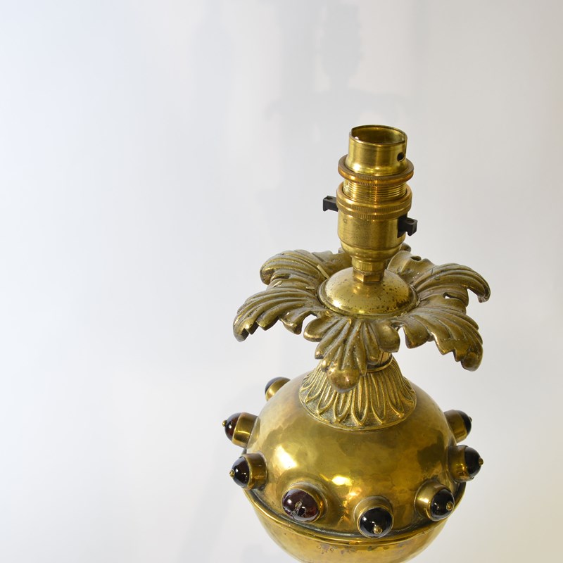 Hammered brass orb mounted with ruby glass, over knopped stem to trefoil foliate tripod base. Now wired with gold flex, bayonet cap bulb holder and PAT tested.