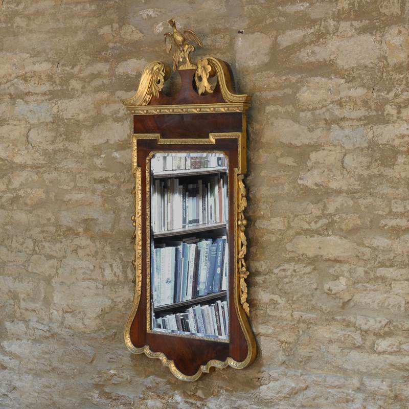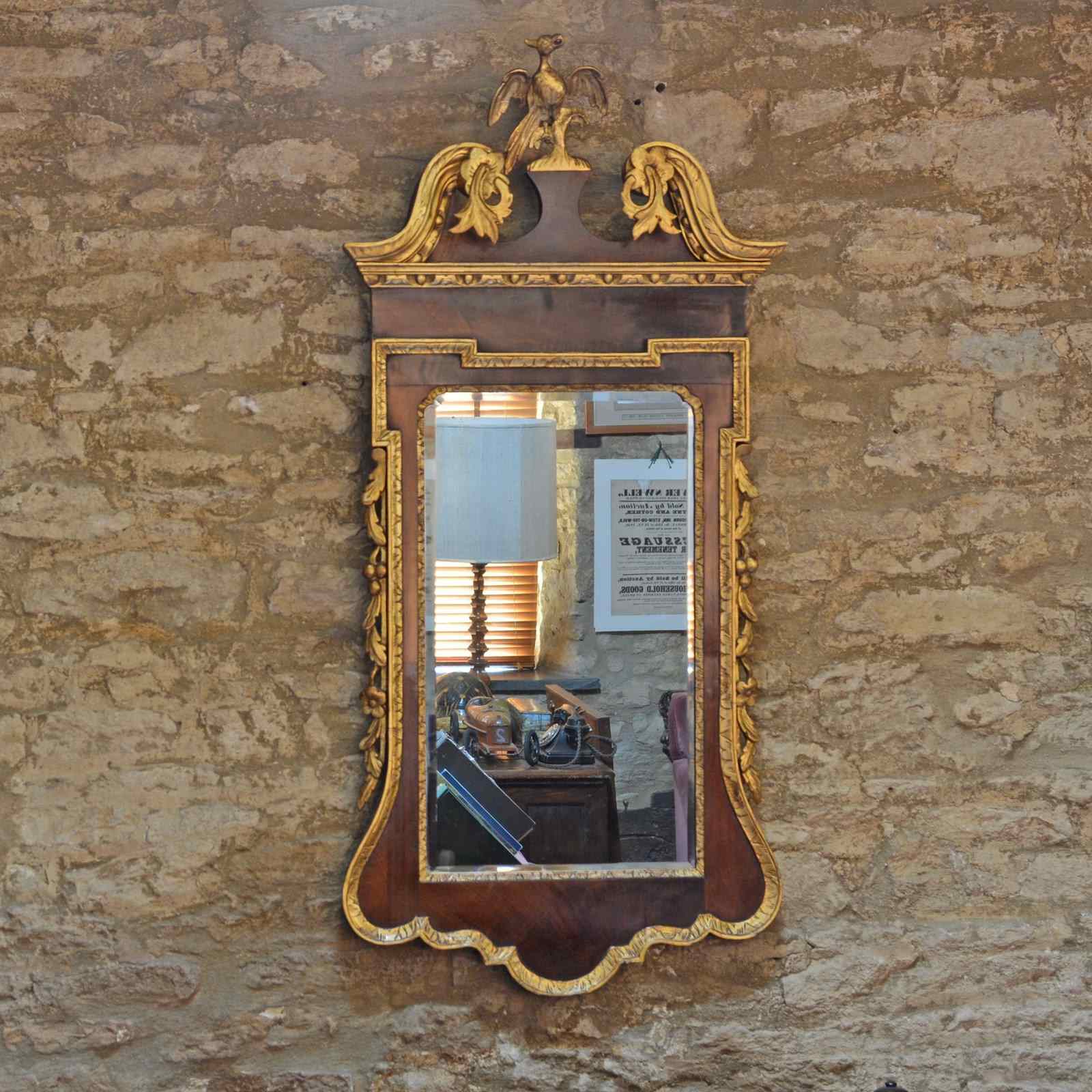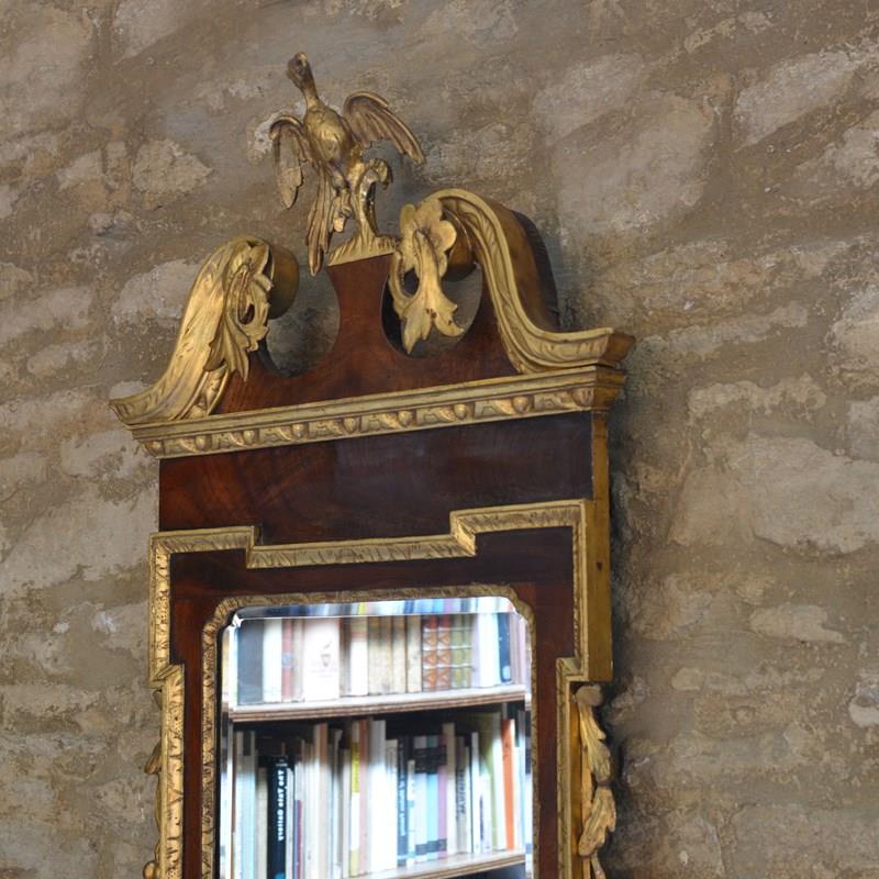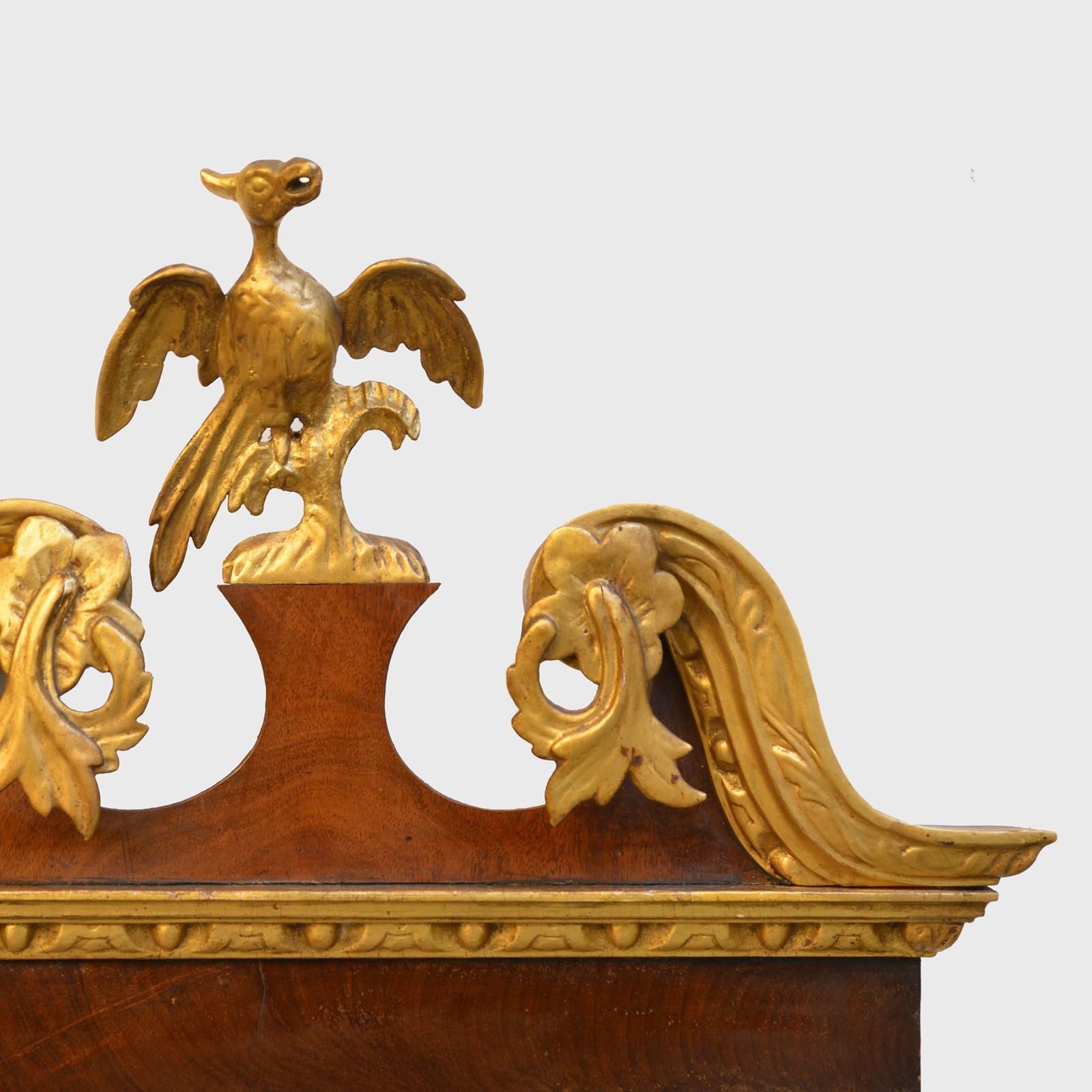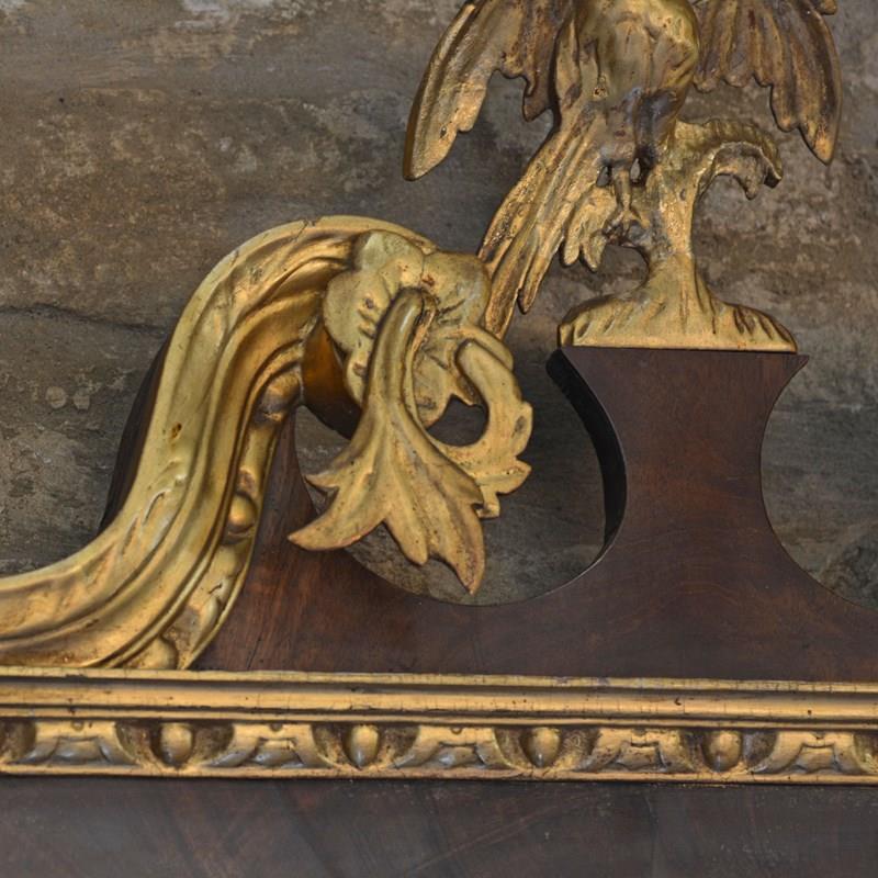 The veneered mahogany frame with broken arched swan neck pediment surmounted by a Ho-ho bird, over a gilded egg and dart frieze, the sides with acanthus leaves and fruit. The bevelled mirror plate with indented upper corners, the plate of later date and is clean and bright, framed with rococco carved giltwood slip.