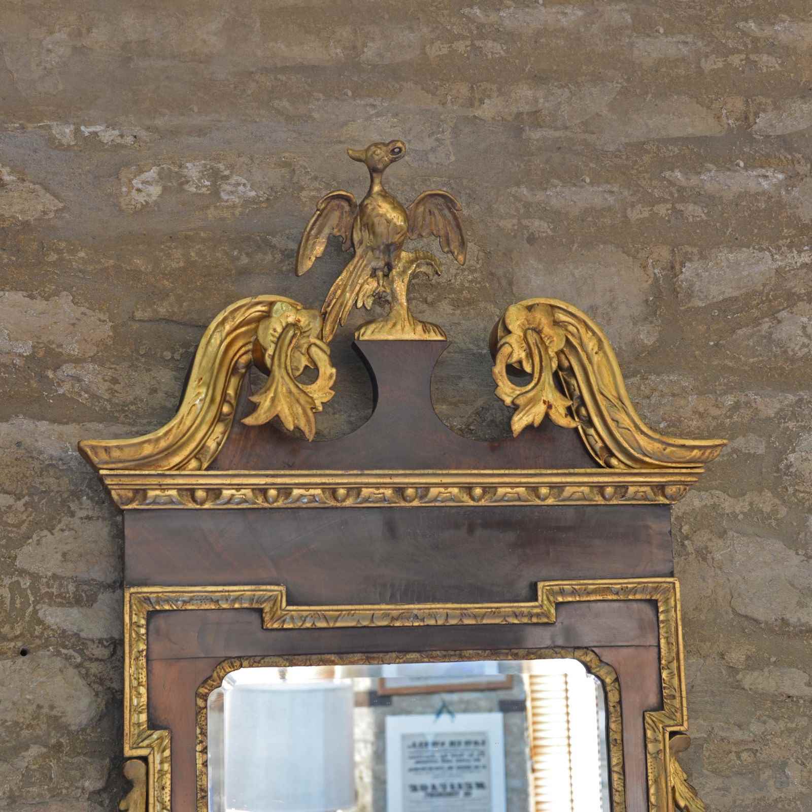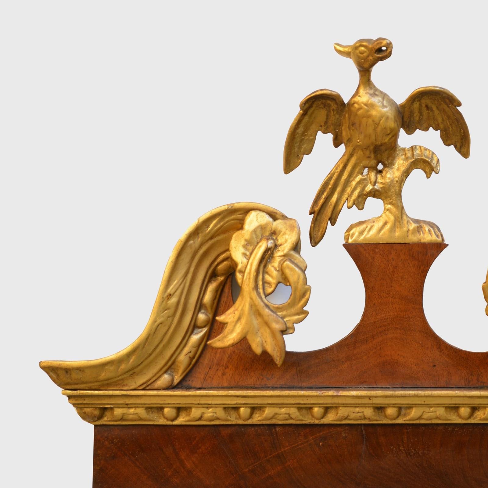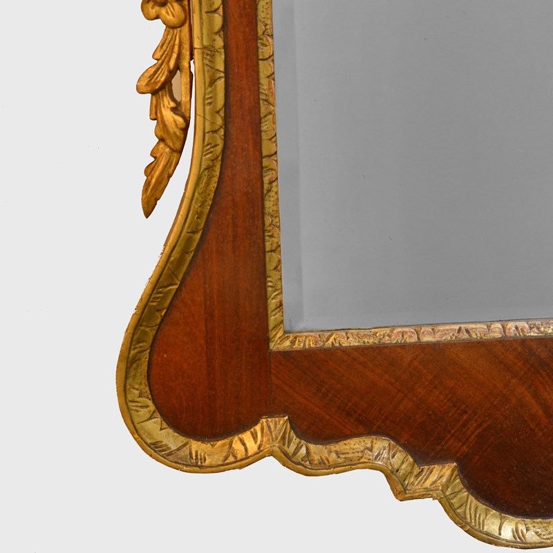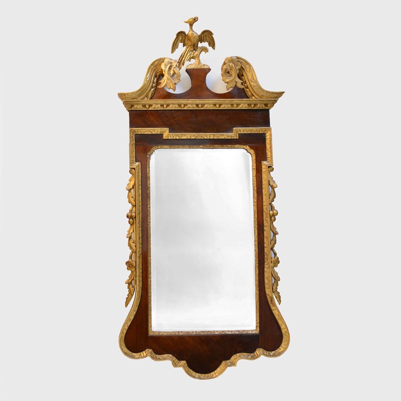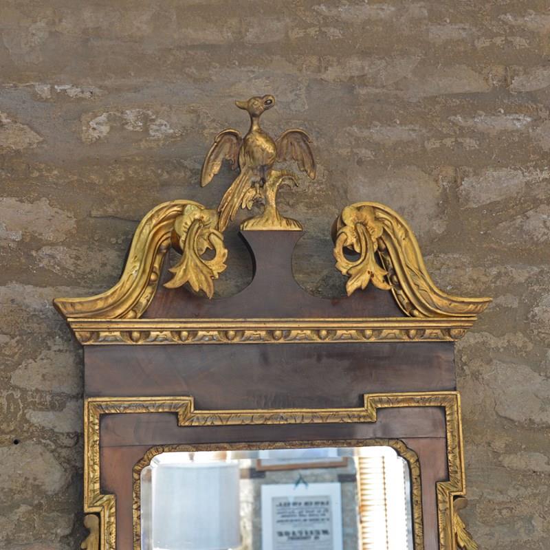 The veneered mahogany frame with broken arched swan neck pediment surmounted by a Ho-ho bird, over a gilded egg and dart frieze, the sides with acanthus leaves and fruit. The bevelled mirror plate with indented upper corners, the plate of later date and is clean and bright, framed with rococco carved giltwood slip.