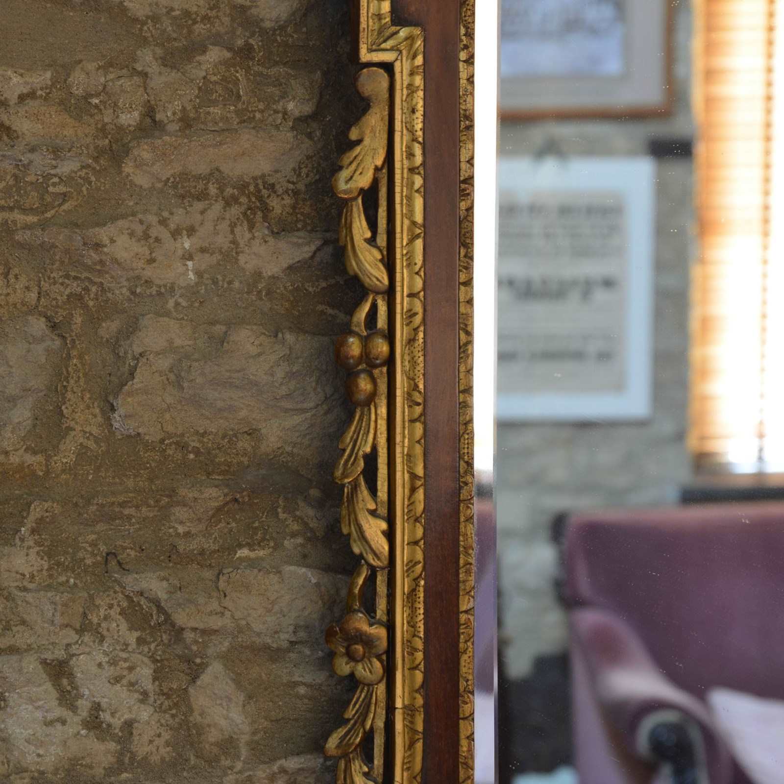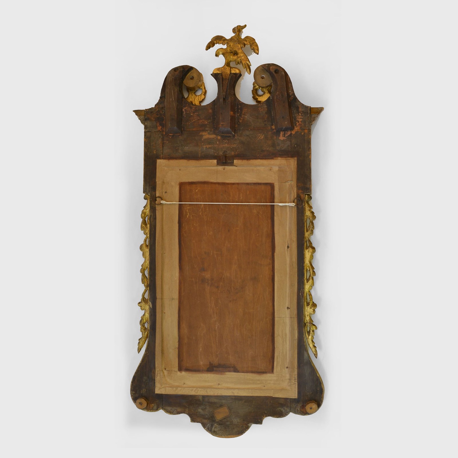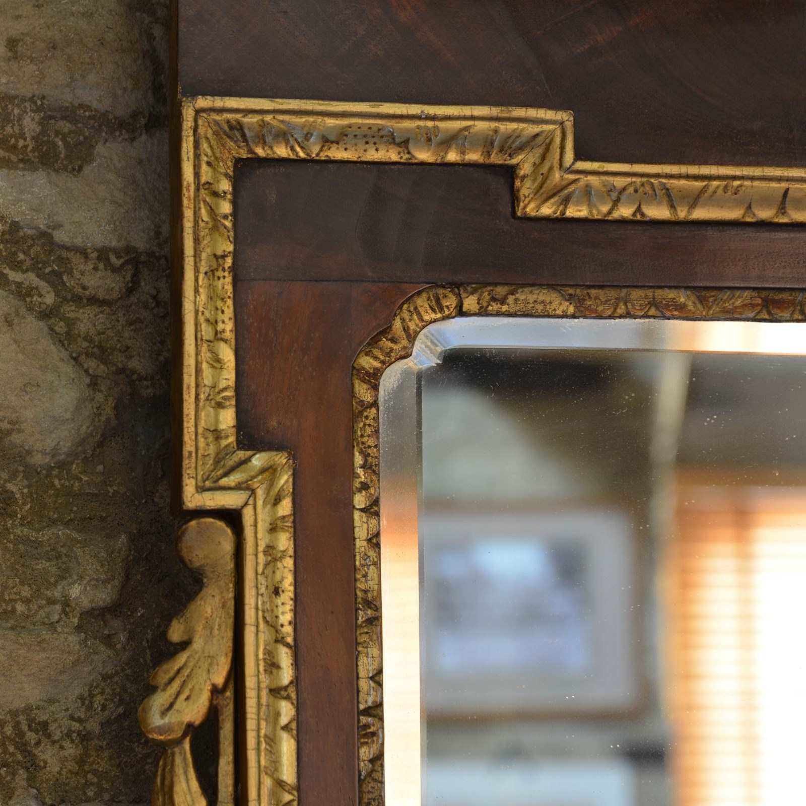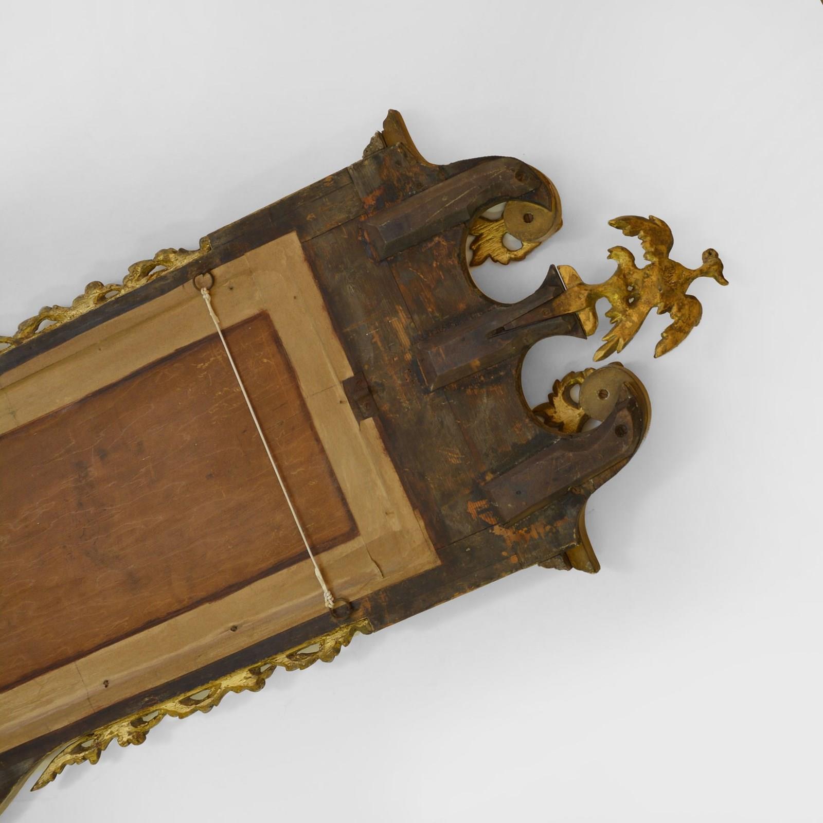 The veneered mahogany frame with broken arched swan neck pediment surmounted by a Ho-ho bird, over a gilded egg and dart frieze, the sides with acanthus leaves and fruit. The bevelled mirror plate with indented upper corners, the plate of later date and is clean and bright, framed with rococco carved giltwood slip.