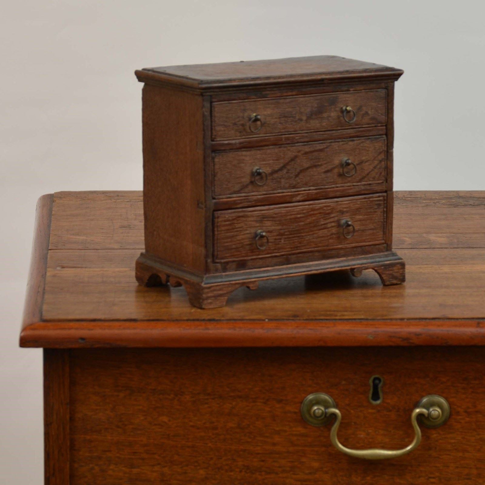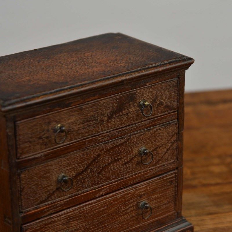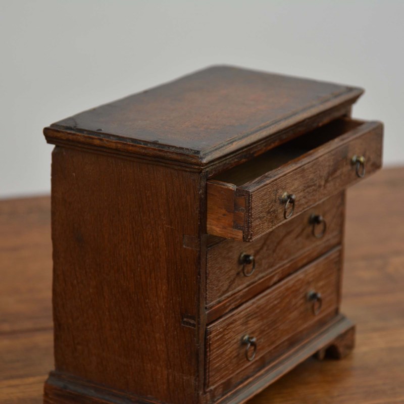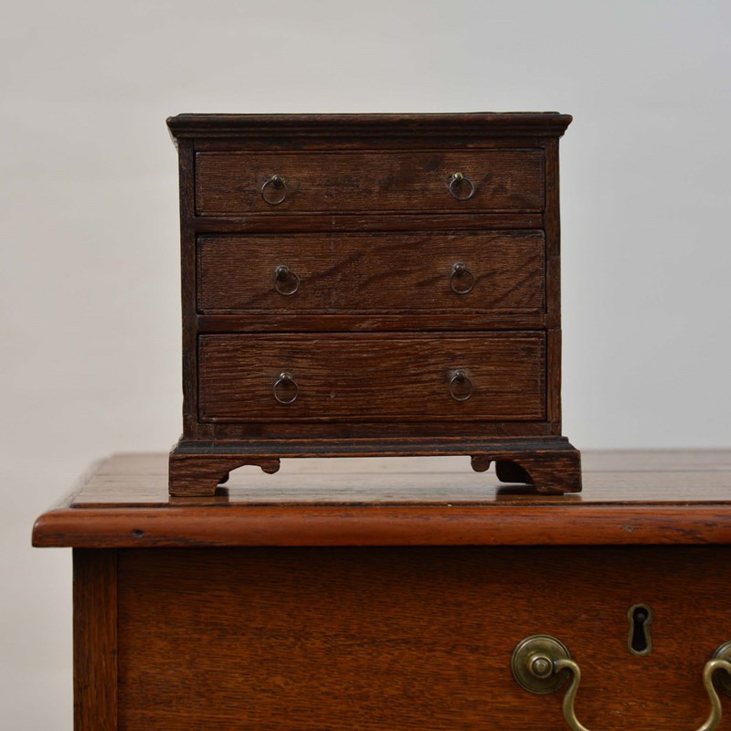 Polished rectangular top with moulded edge to three graduated drawers over stepped base with bracket feet. Lovely detail considering it is miniature, bracket feet with blocks and drawers with dovetails.