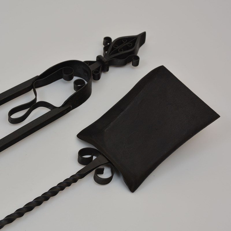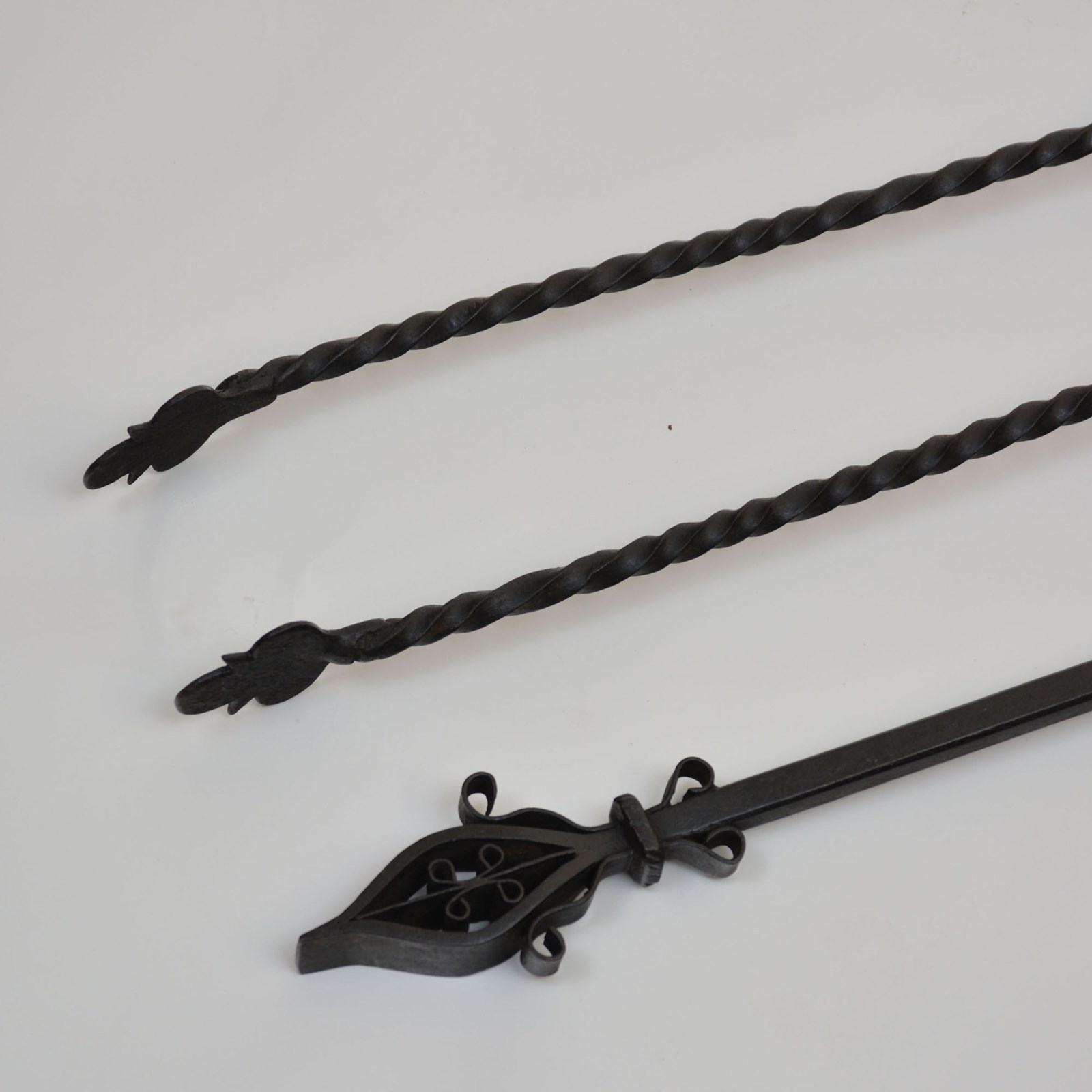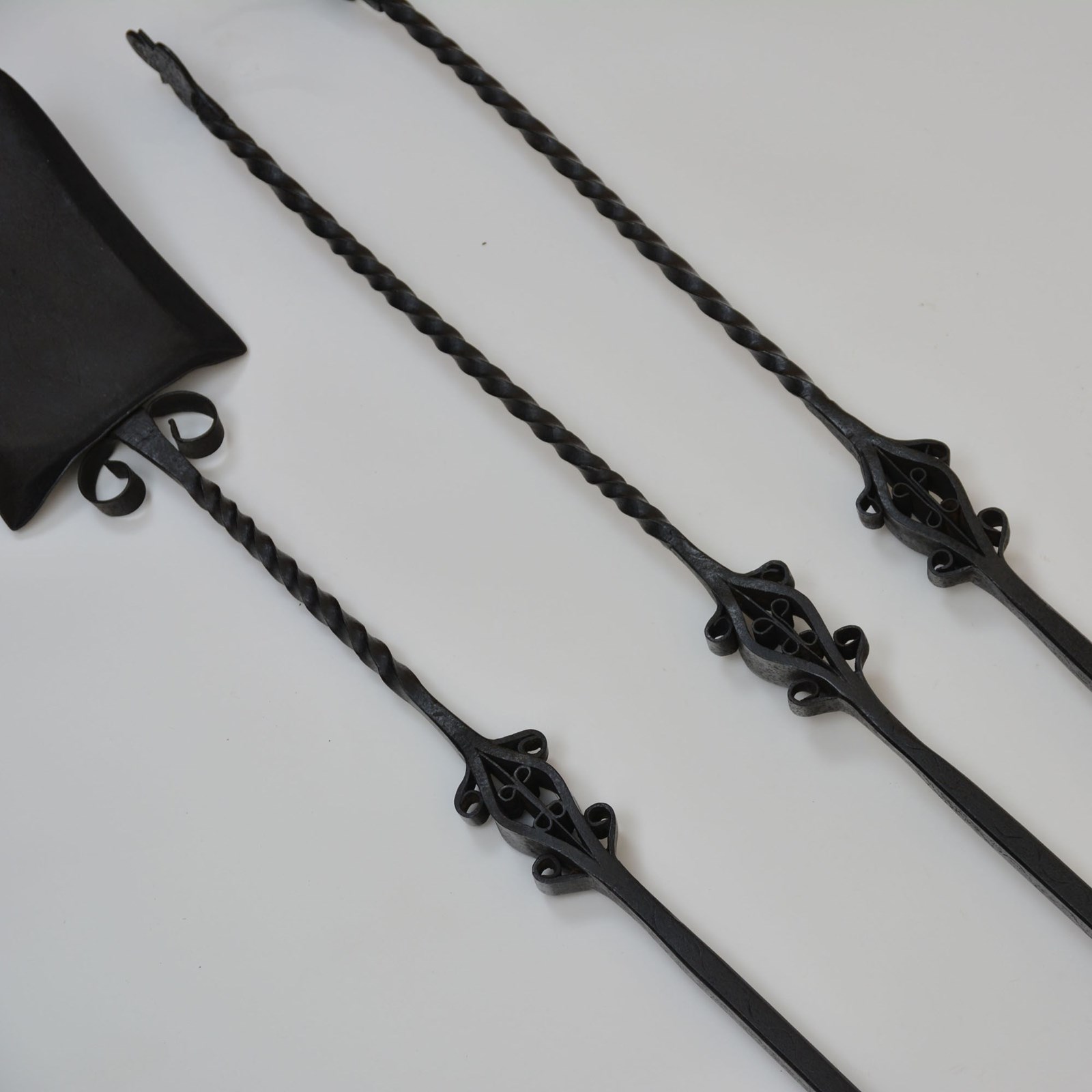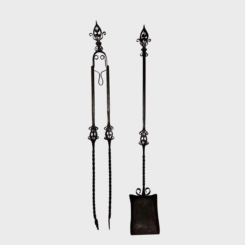 Both the tongs and the shovel exhibit very ornate wrought ironwork with knops, scrolls and barley-sugar twists to the shafts.