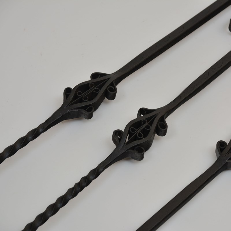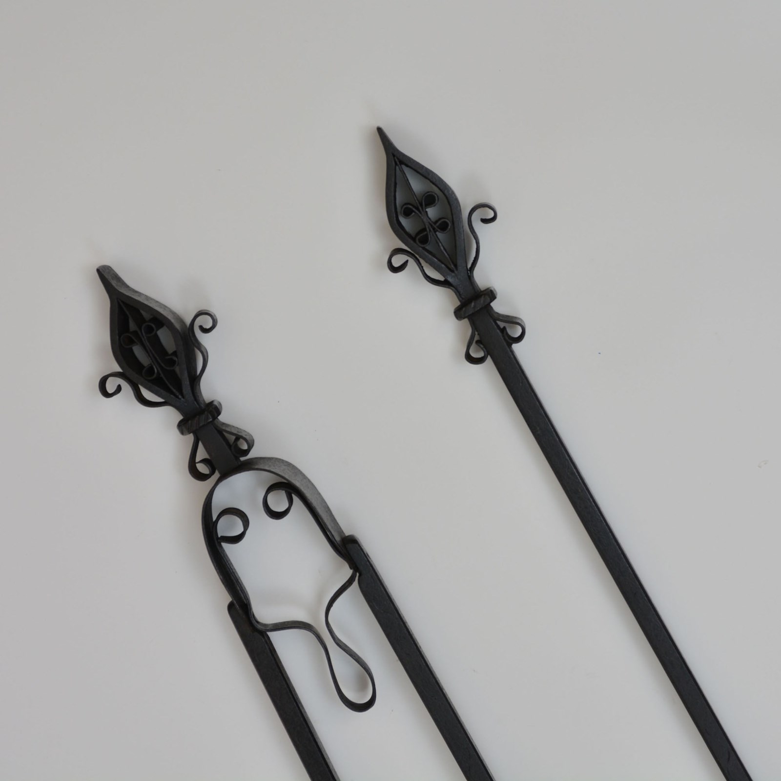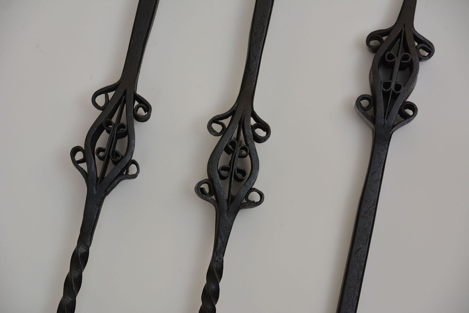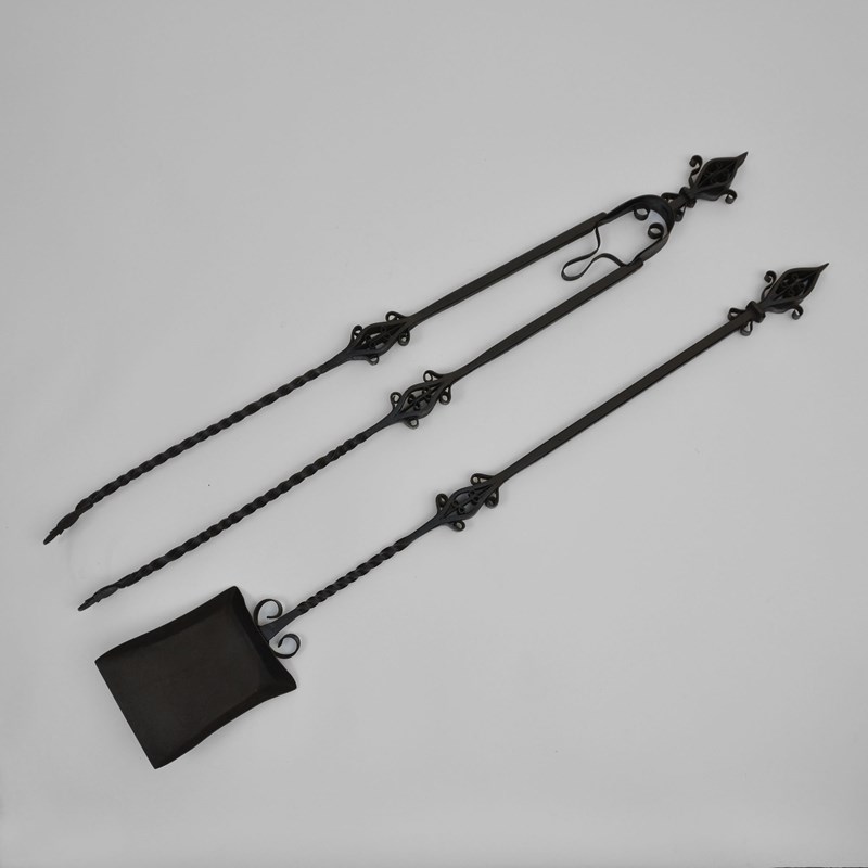 Both the tongs and the shovel exhibit very ornate wrought ironwork with knops, scrolls and barley-sugar twists to the shafts.