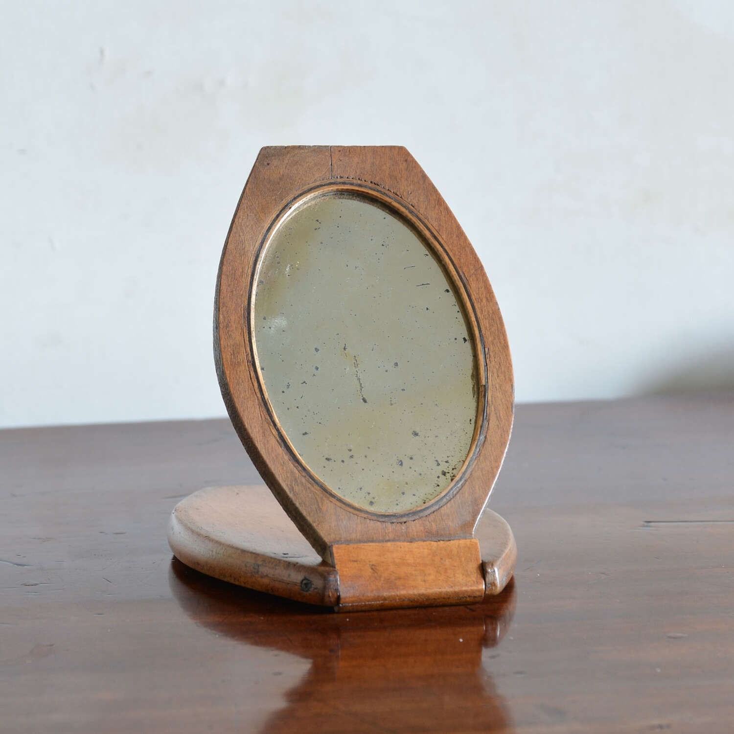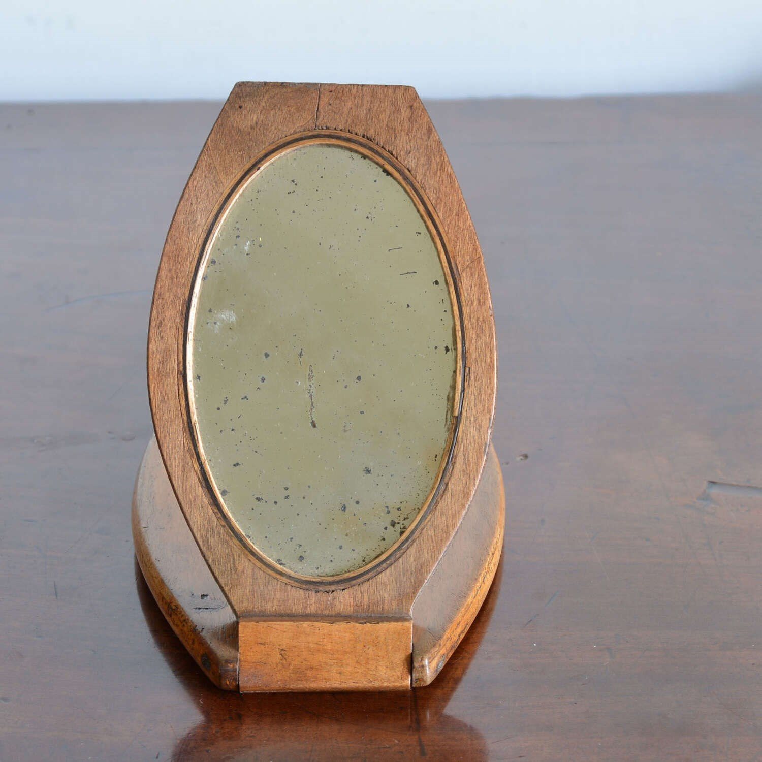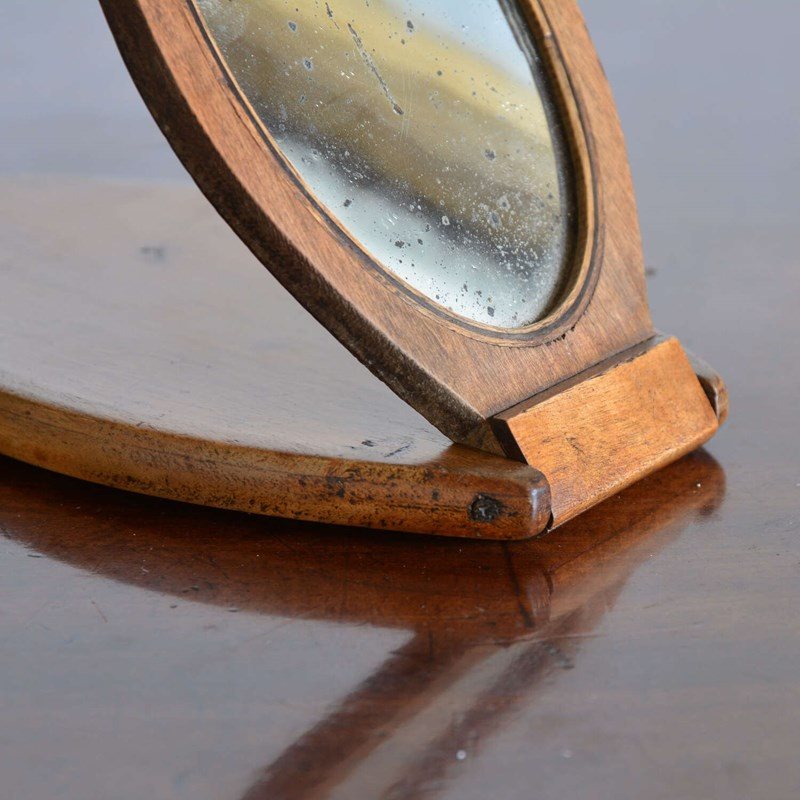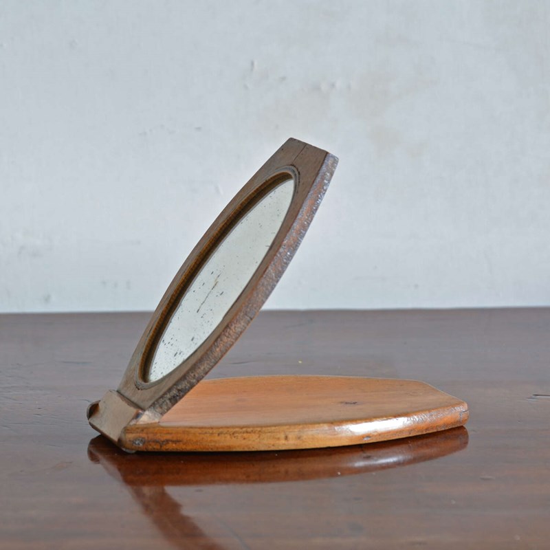 A walnut case campaign kit shaving mirror. The shaped case opens to an oval shaving mirror with ebony stringing. The frame folding out to form an easel and closes to protect the looking glass. Can also be hung from the loop to the back.