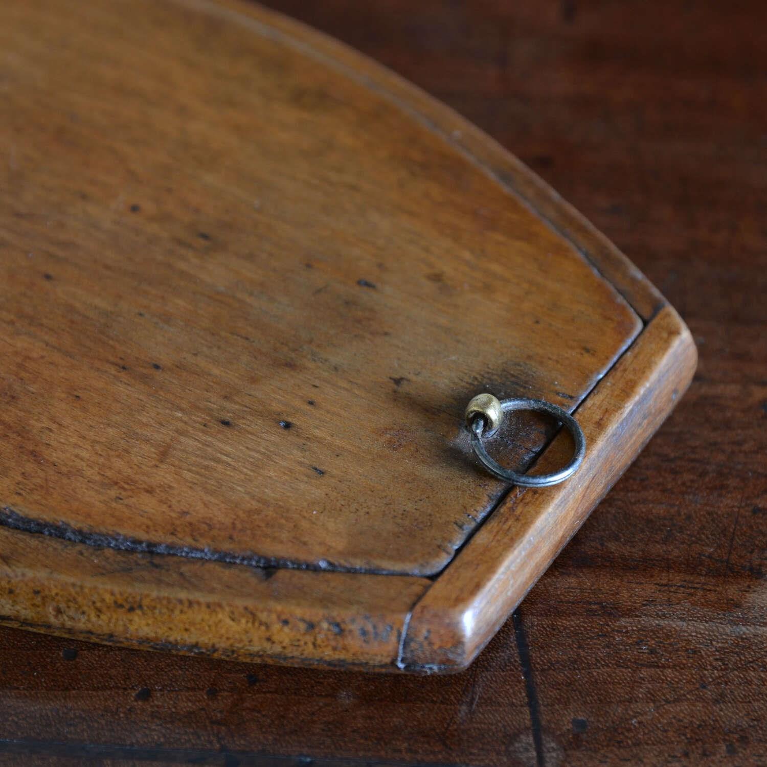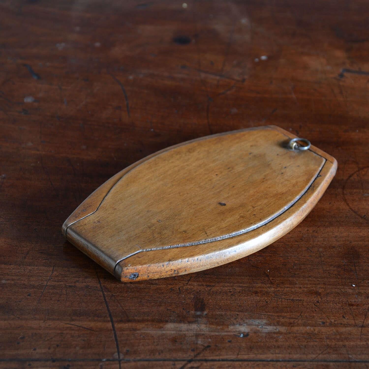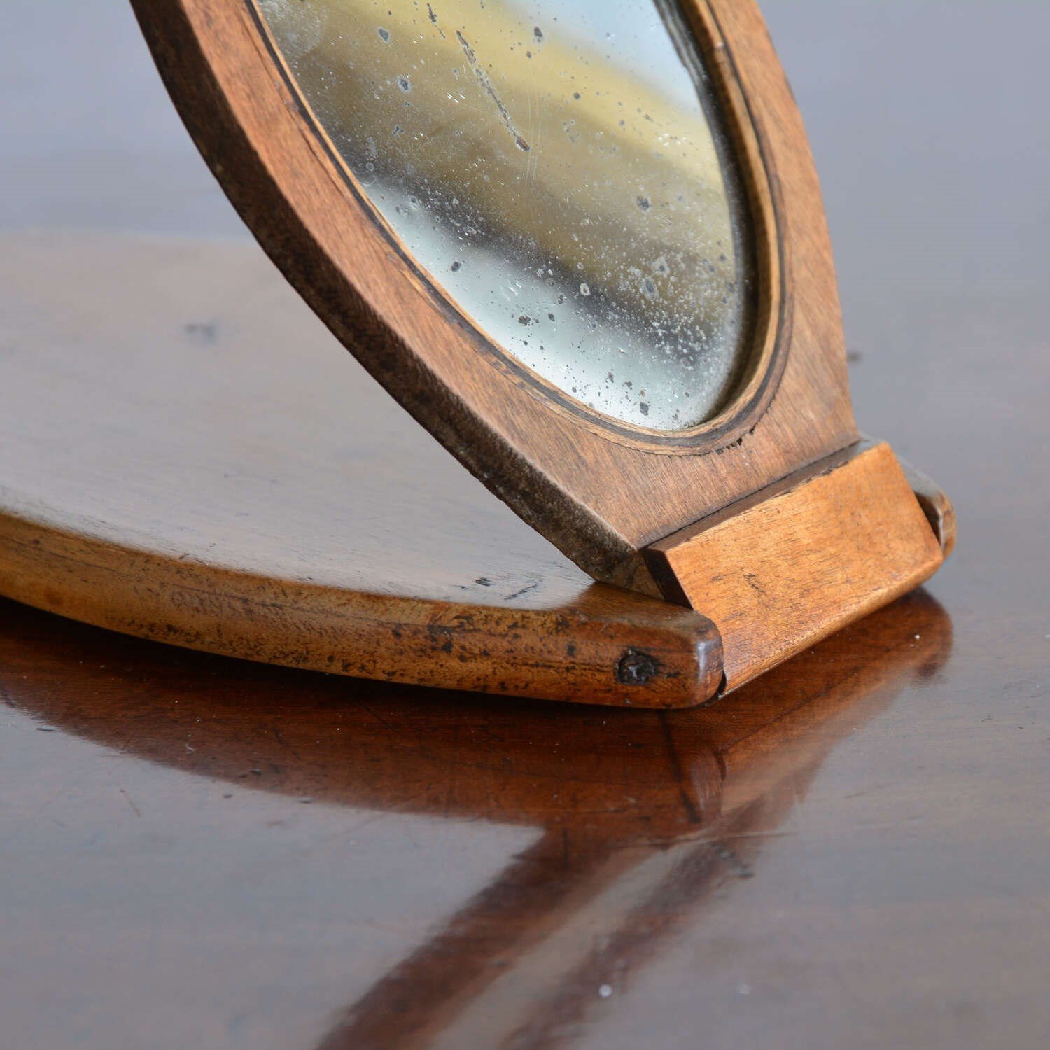 A walnut case campaign kit shaving mirror. The shaped case opens to an oval shaving mirror with ebony stringing. The frame folding out to form an easel and closes to protect the looking glass. Can also be hung from the loop to the back.