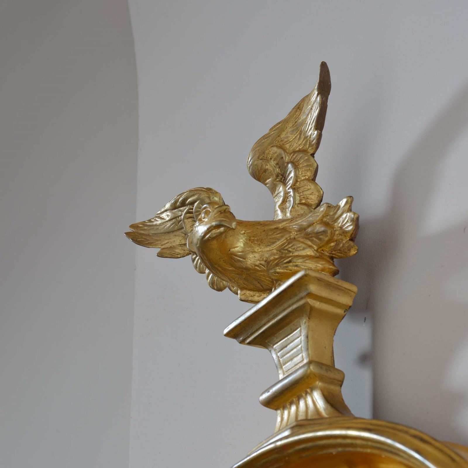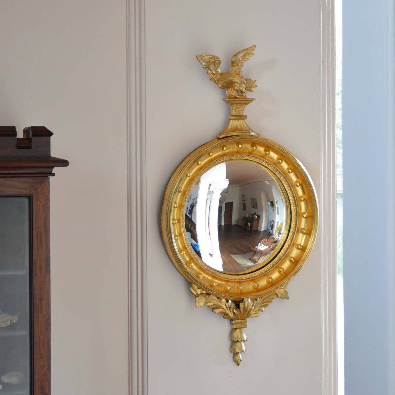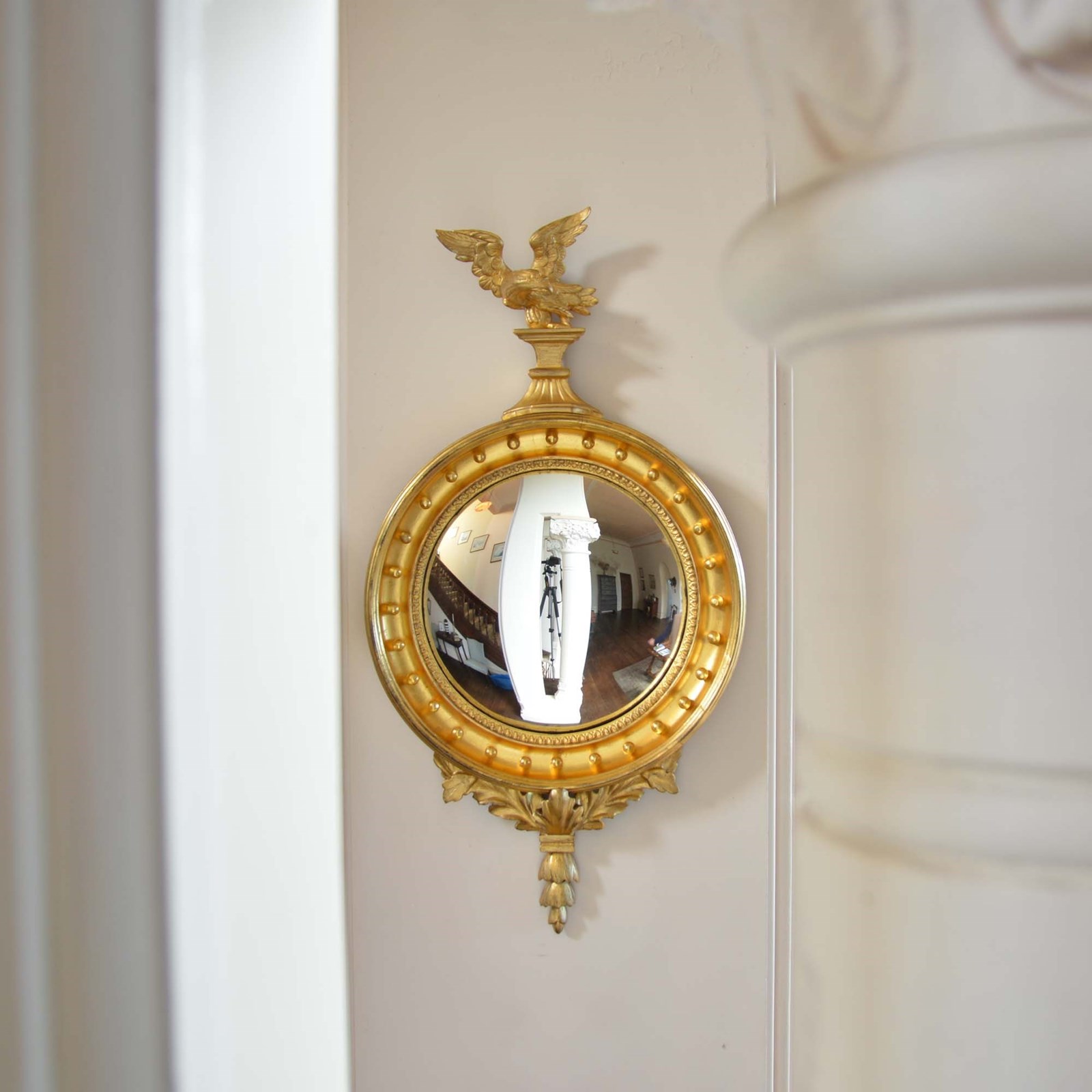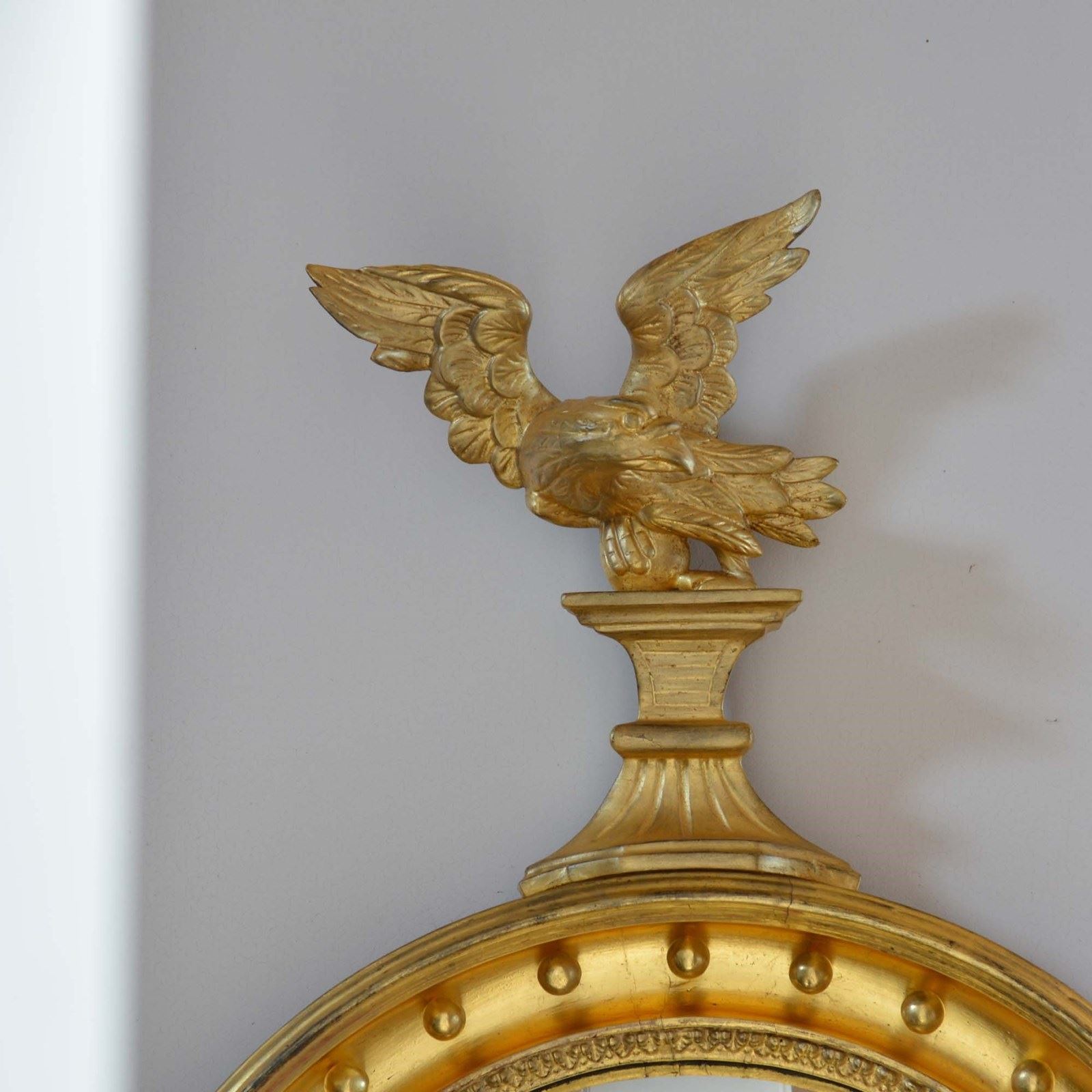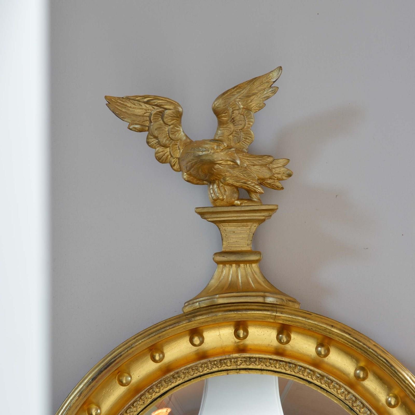 A circular giltwood frame mounted with gilded balls to the inner rim, with a carved wood stylised eagle to the top and acanthus leaf detail to the base. Presented in excellent condition with brightly burnished water gilding to the inner rim and balls. Framed with a convex mirror plate.