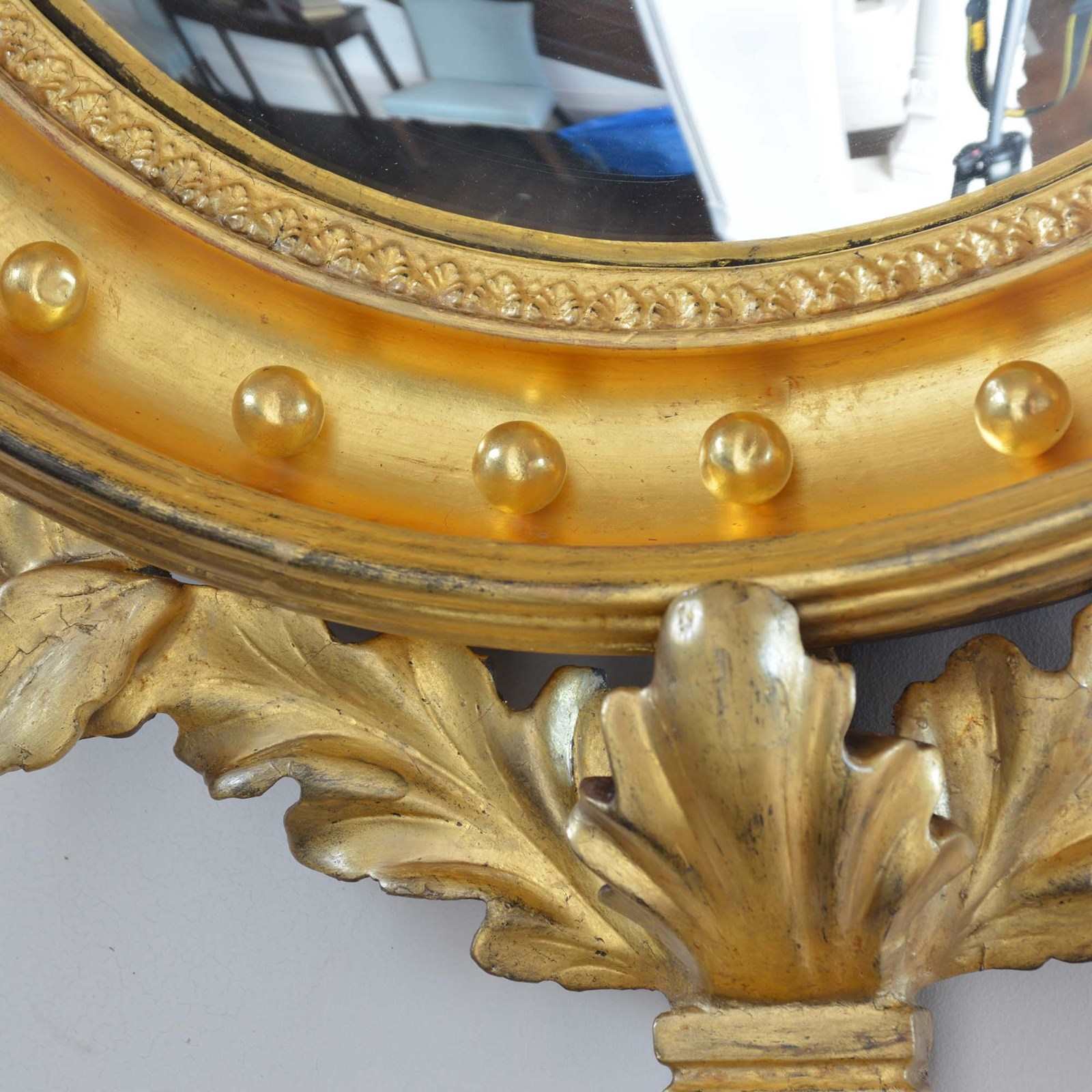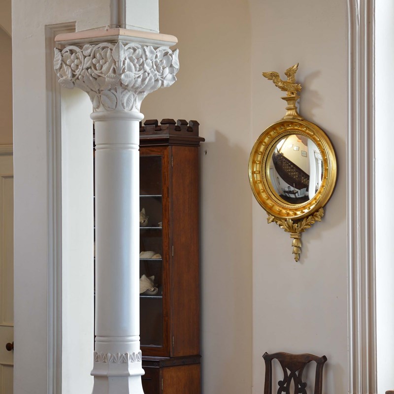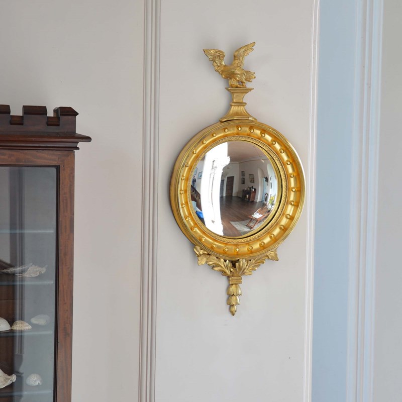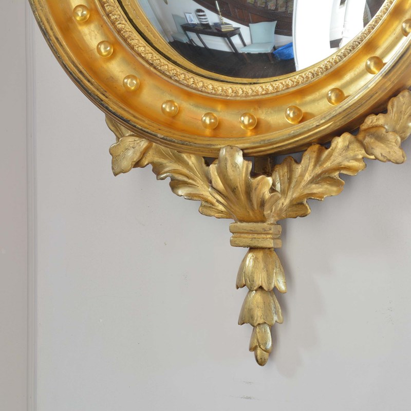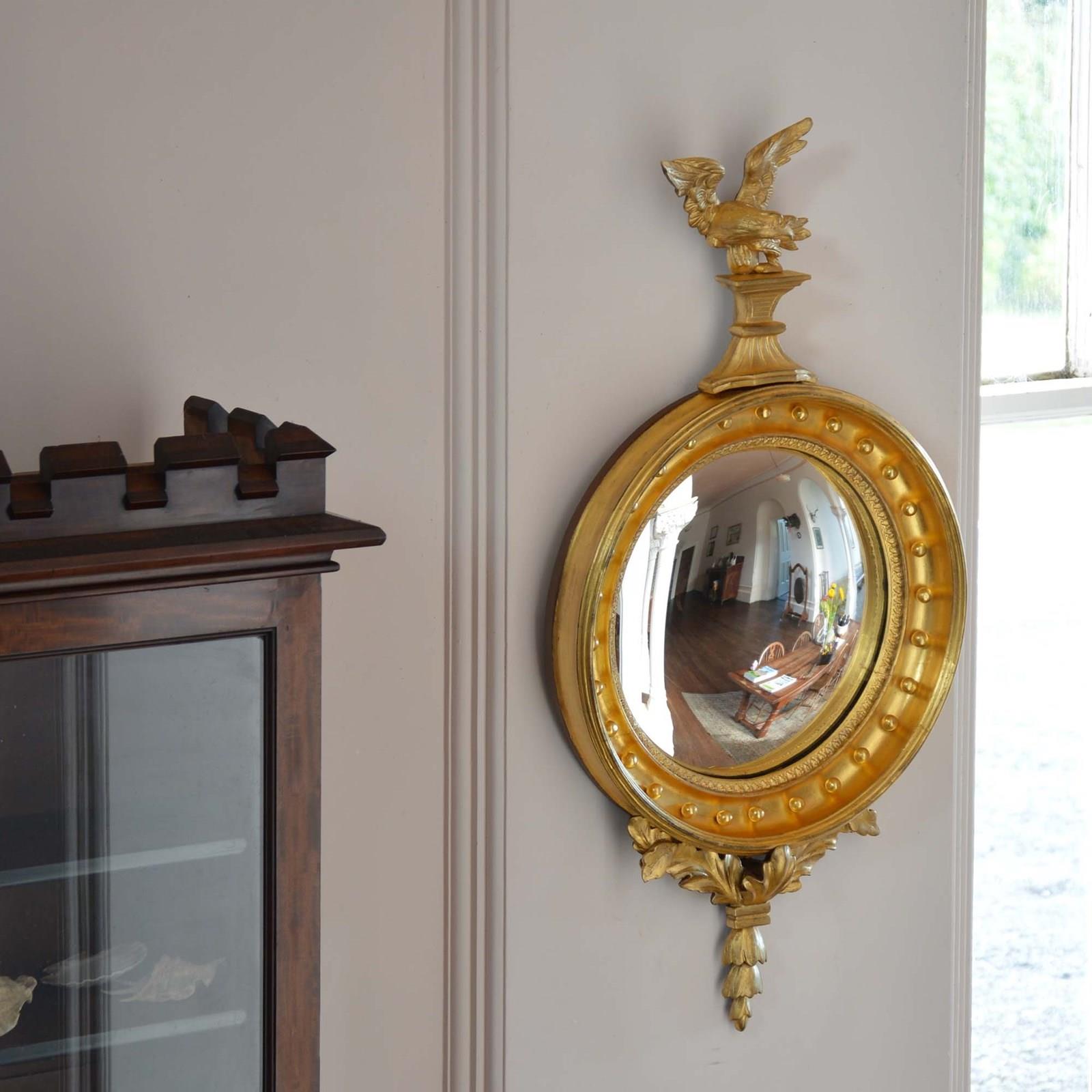 The convex mirror has been used as a design to spread light around the room and bring life to the interior by adding an additional dimension. The late Georgian a Regency periods particularly utilised the design. This is a very good example with well carved detail and presented in good order with bright gilding.