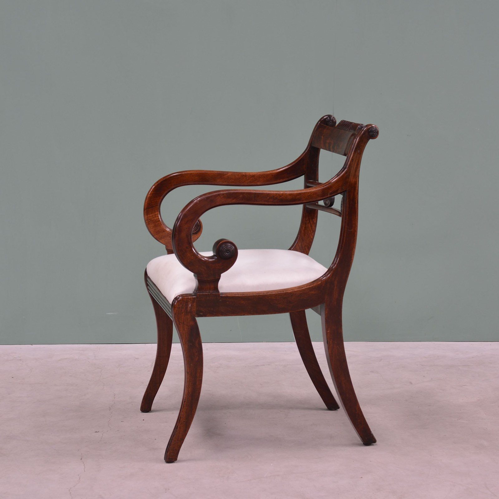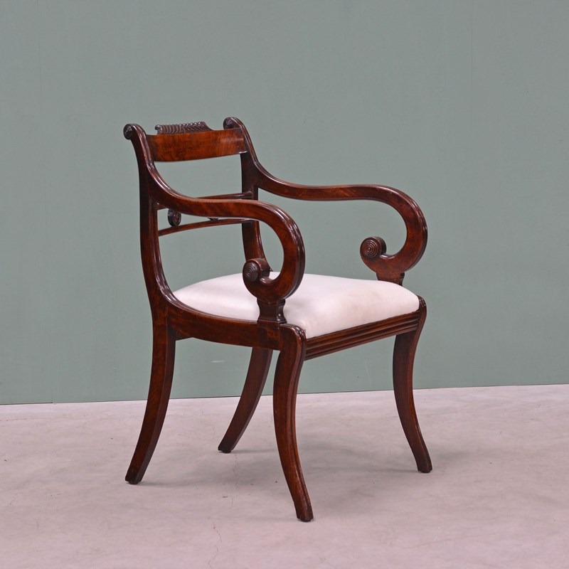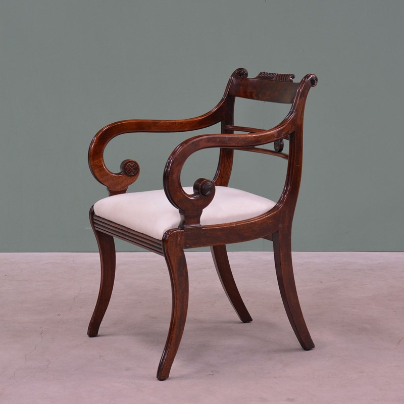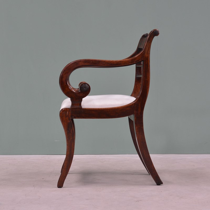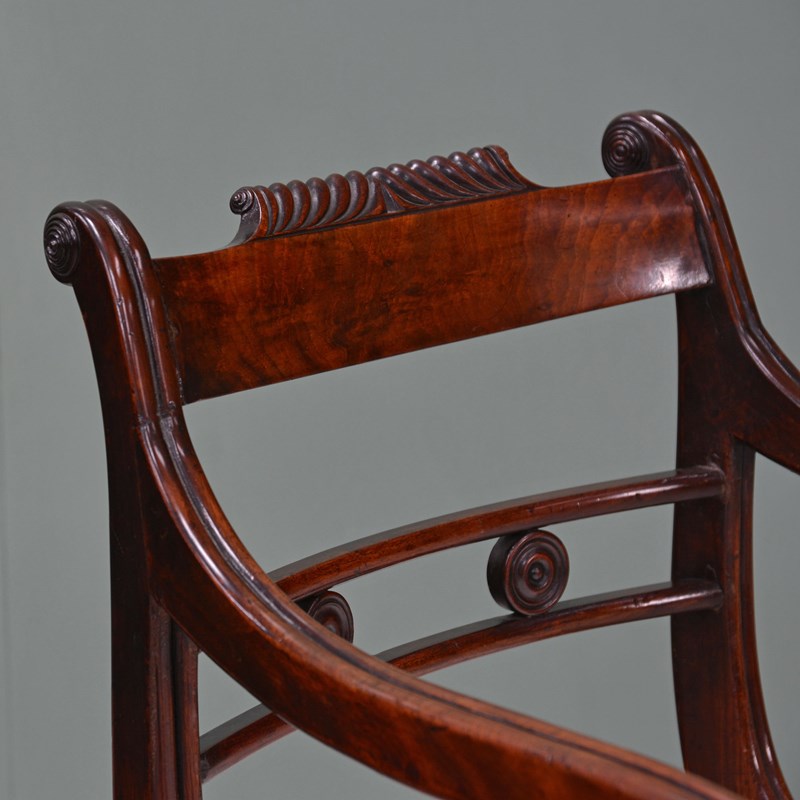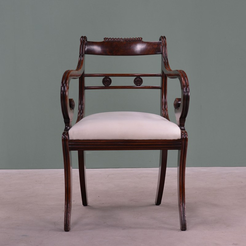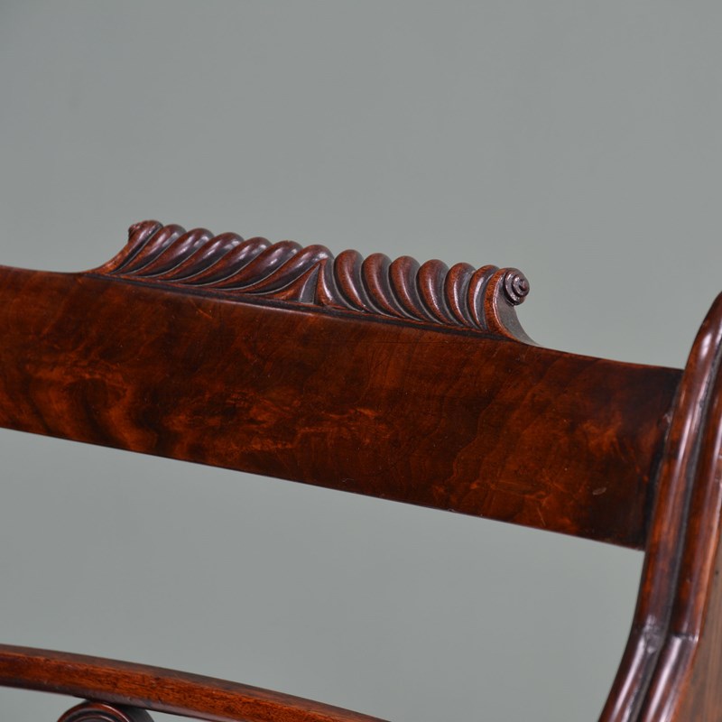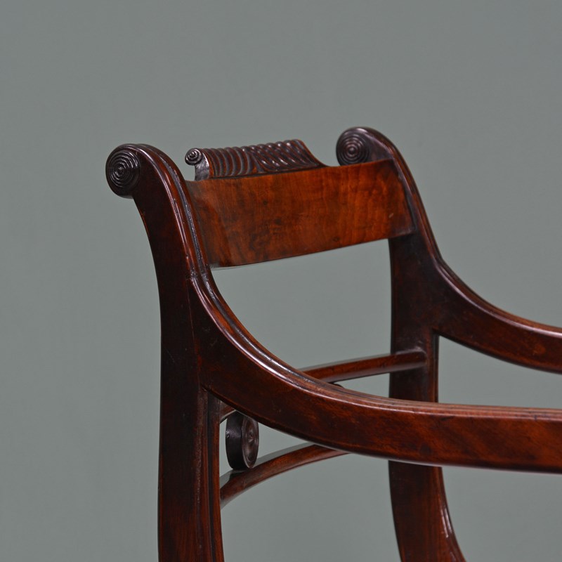 The back with concave cresting with gadroon carving above a pair of rails united by turned paterae. Carved, reeded scroll arms to seat and four sabre legs. Drop in seat, upholstered to linen ready for a top covering of your choice (we can arrange the upholstery).