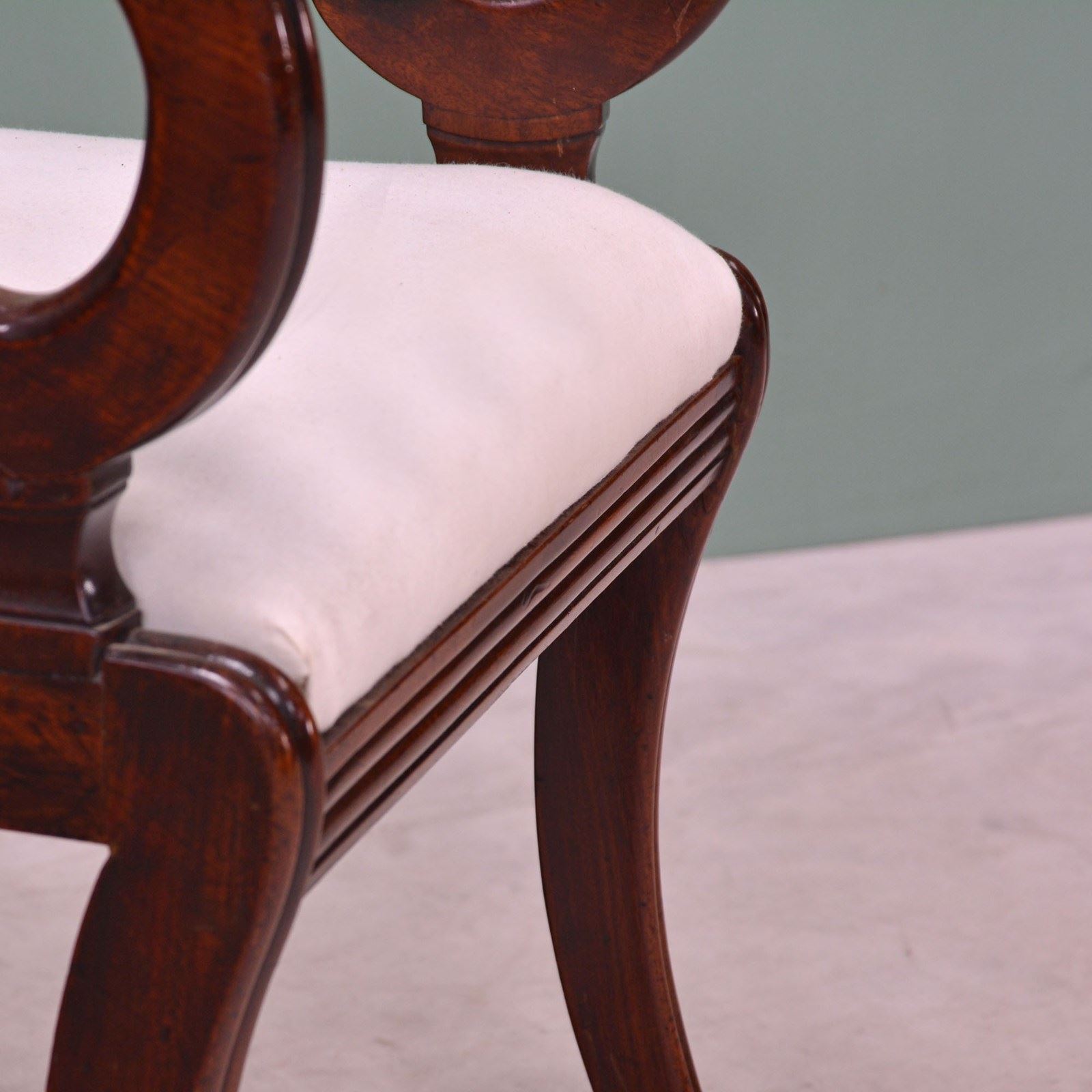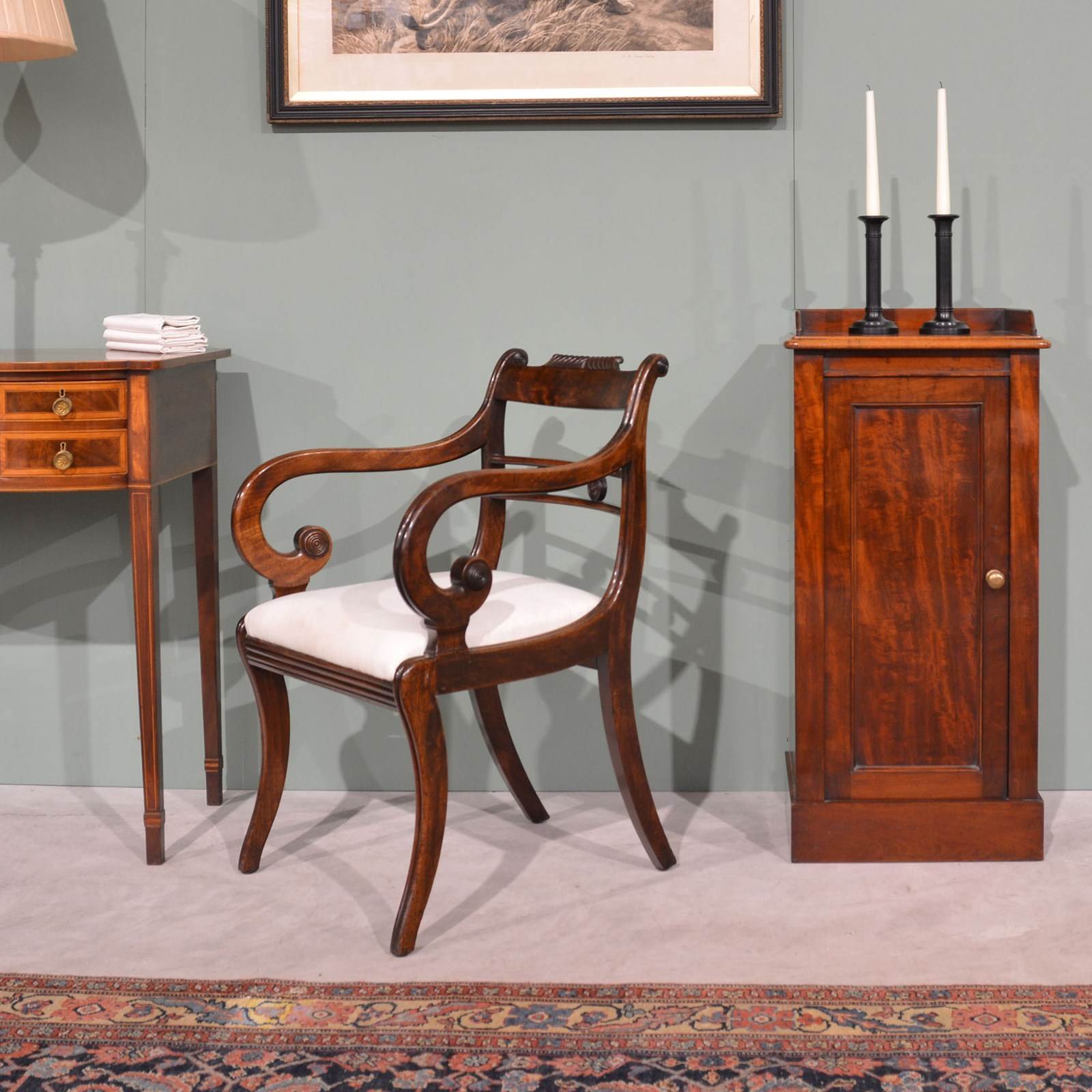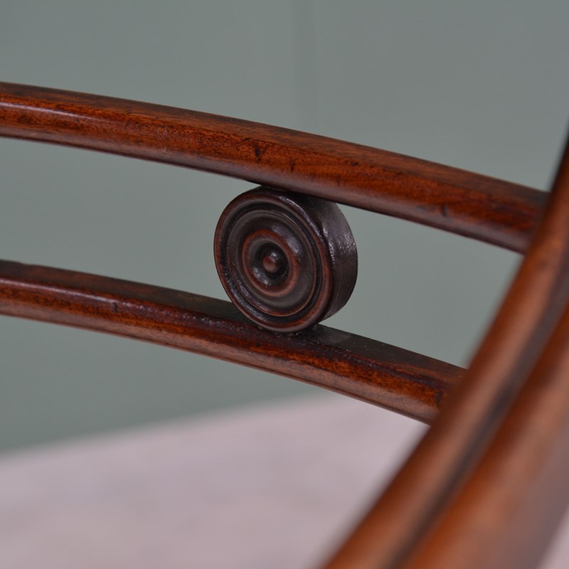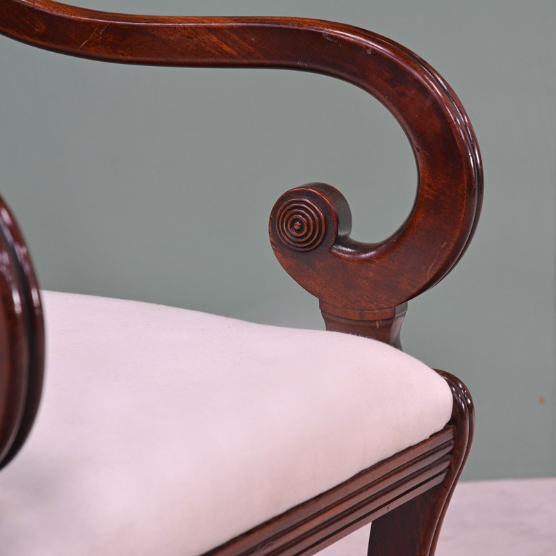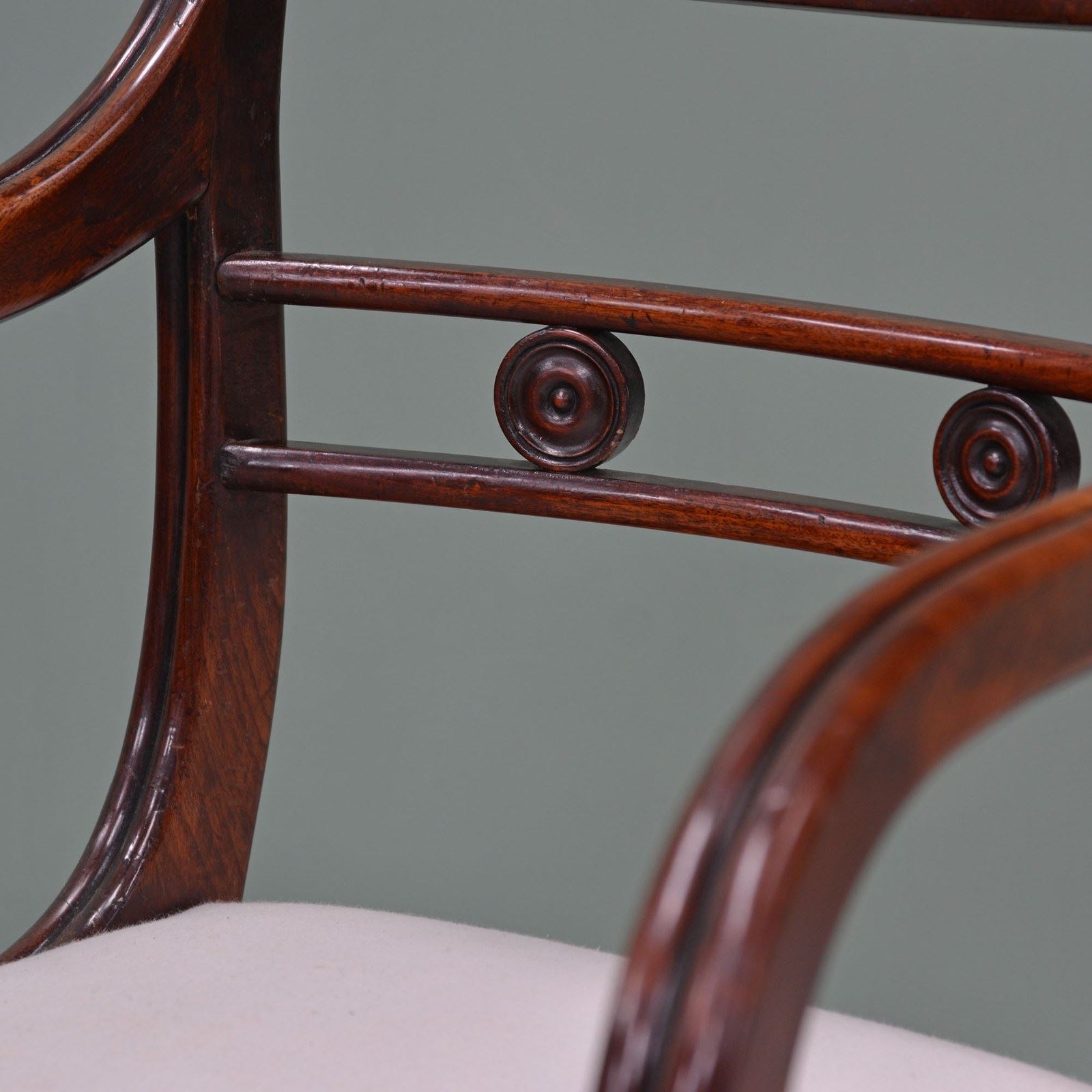 The back with concave cresting with gadroon carving above a pair of rails united by turned paterae. Carved, reeded scroll arms to seat and four sabre legs. Drop in seat, upholstered to linen ready for a top covering of your choice (we can arrange the upholstery).