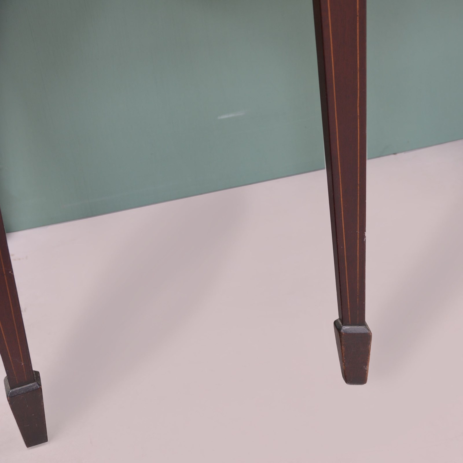 Well coloured mahogany with boxwood stringing, a central drawer flanked by a pair of cupboards, each with a single shelf, slender tapering legs with long spade feet.