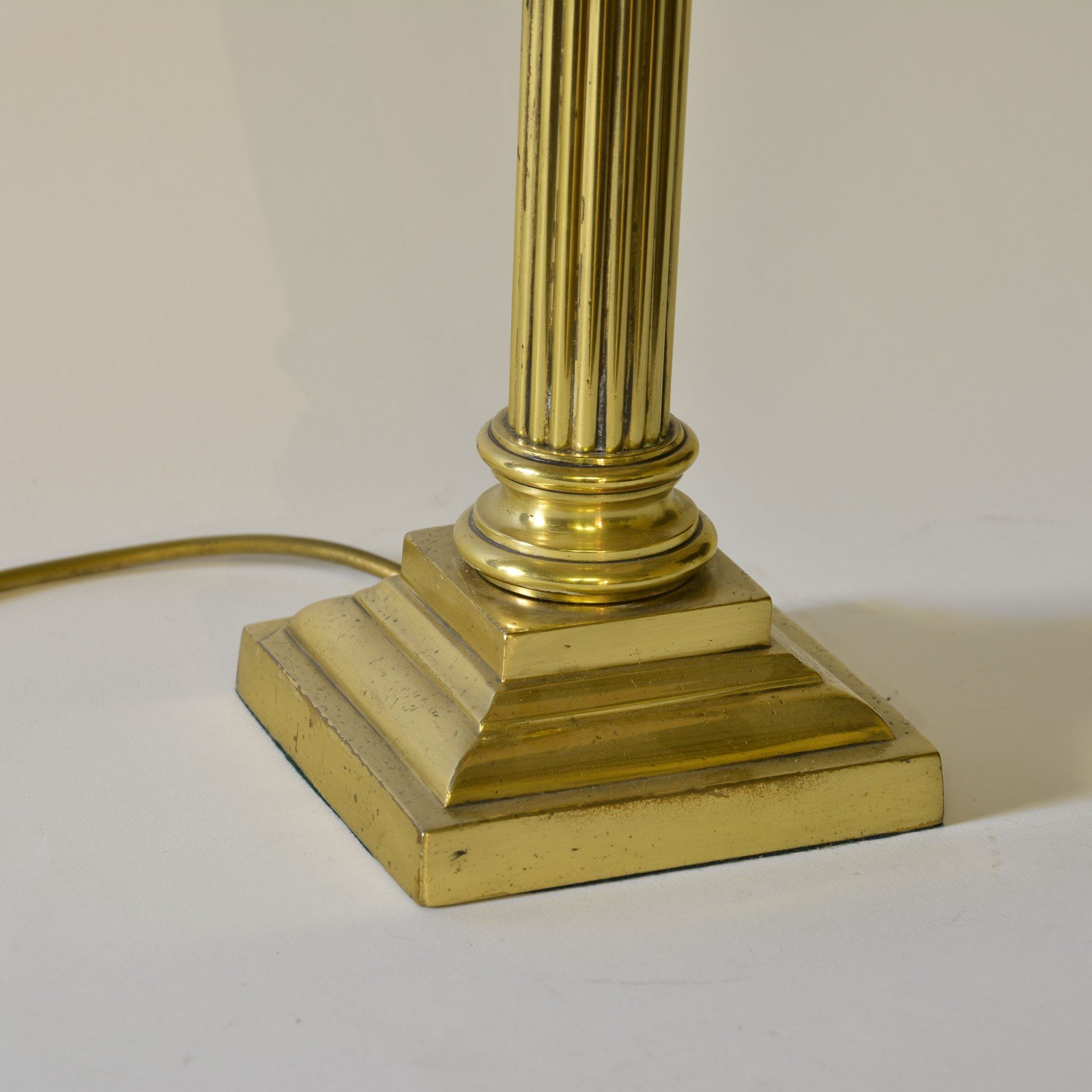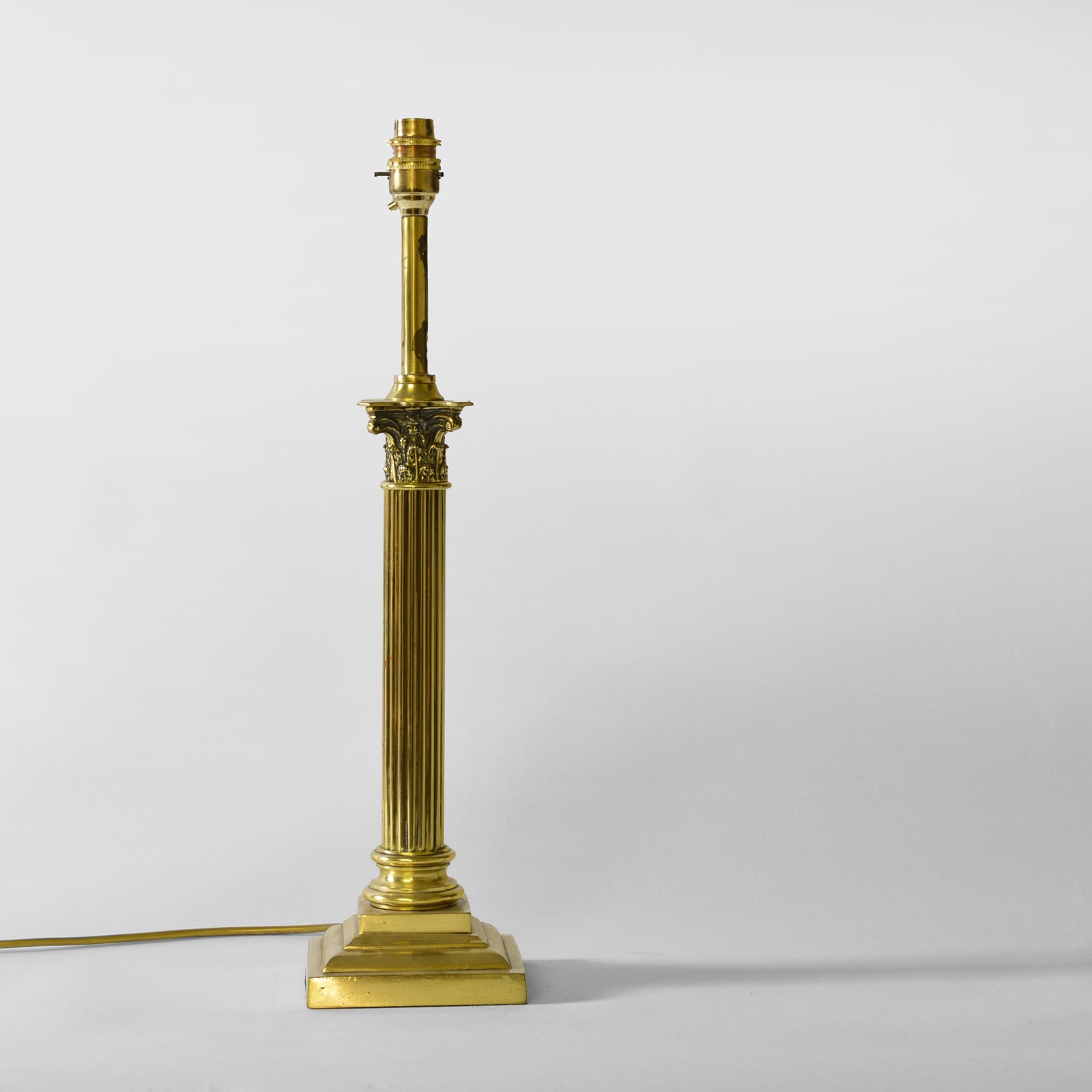 With a square stepped base to fluted column with corinthian capitol, cast brass capitol and base. Now wired with gold flex, bayonet cap bulb holder and PAT tested.