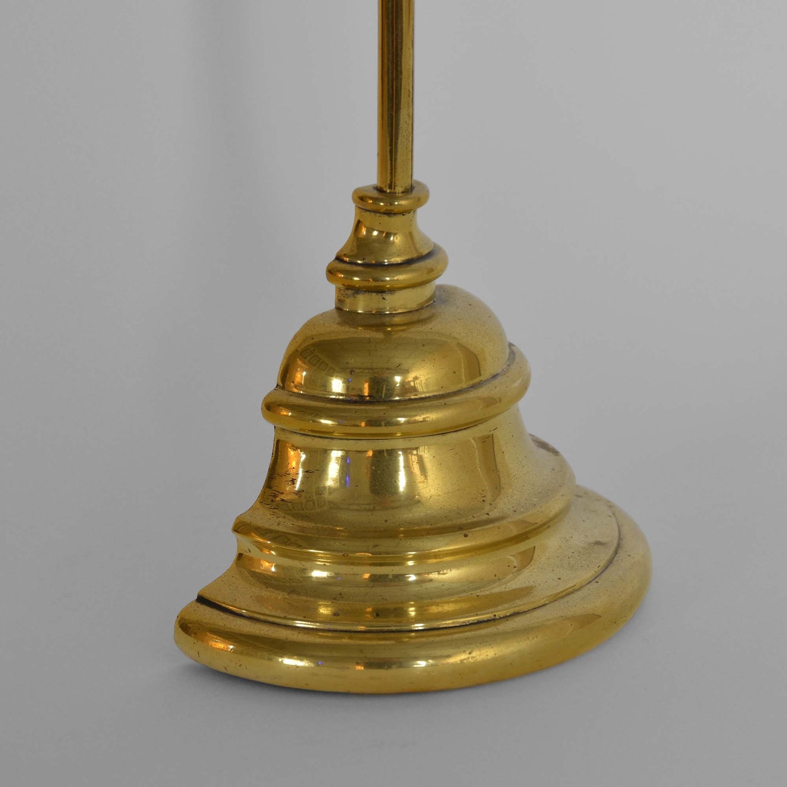 Stepped demi-lune bell shaped base to column with ring carrying handle.