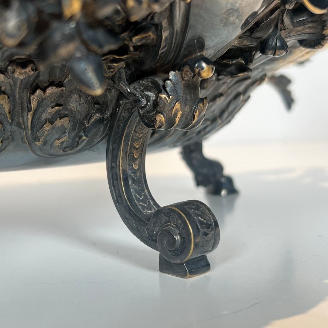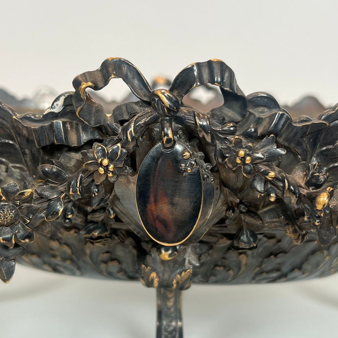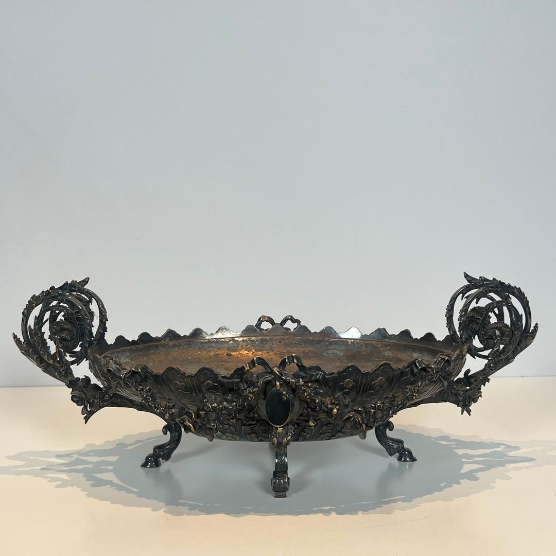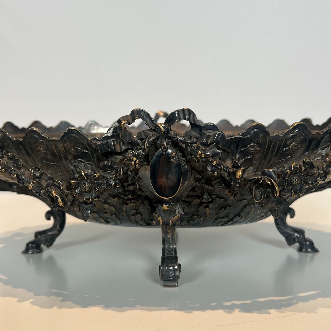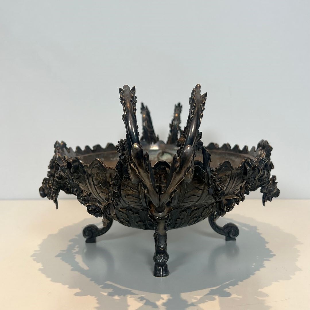 A silver-plated, chased metal centerpiece decorated with scrolls, medallions, and deer feet. French work, signed. Circa 1900