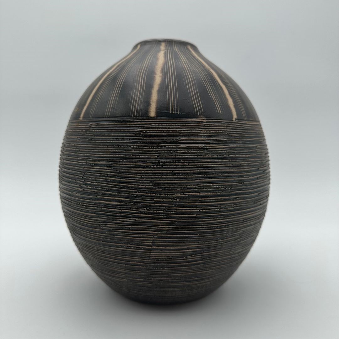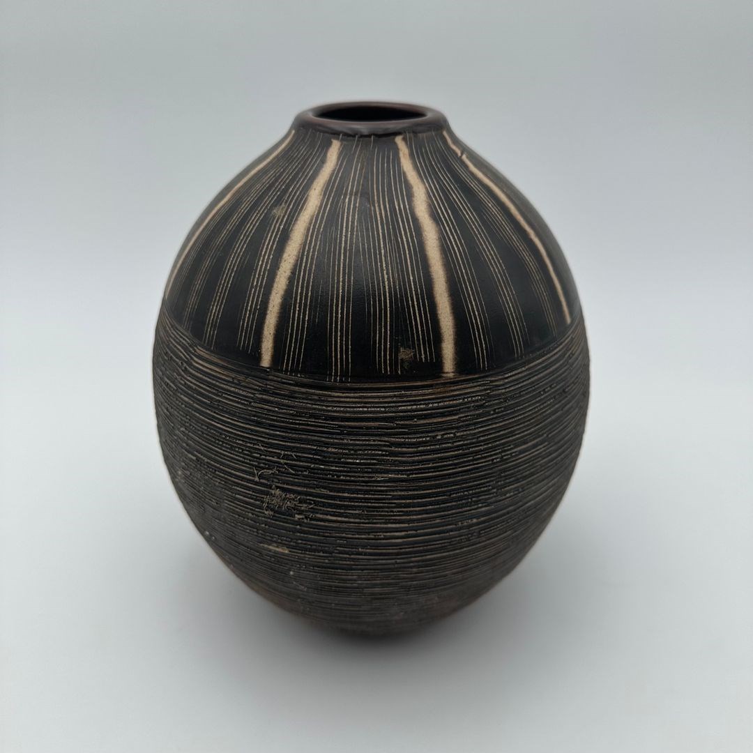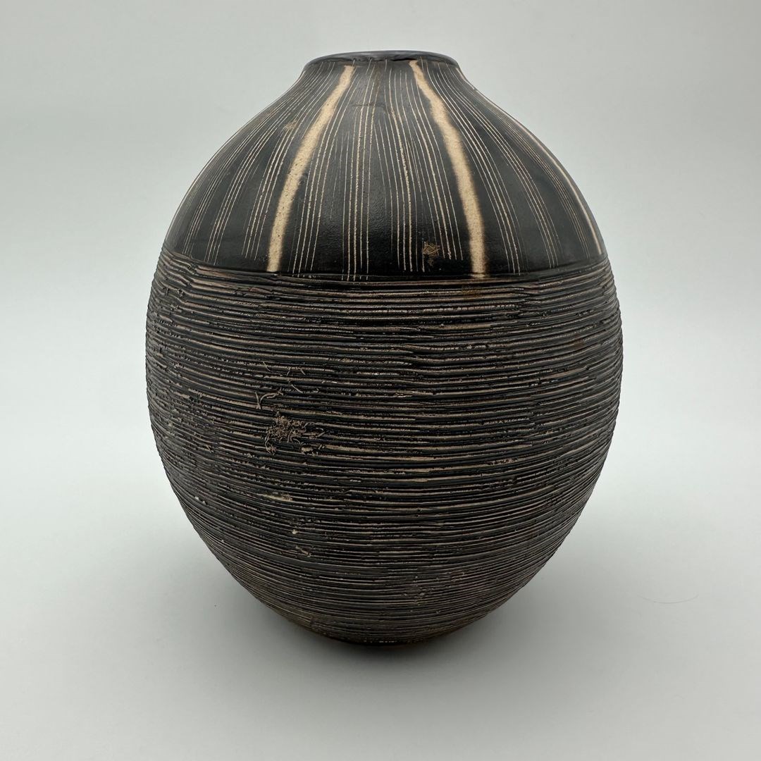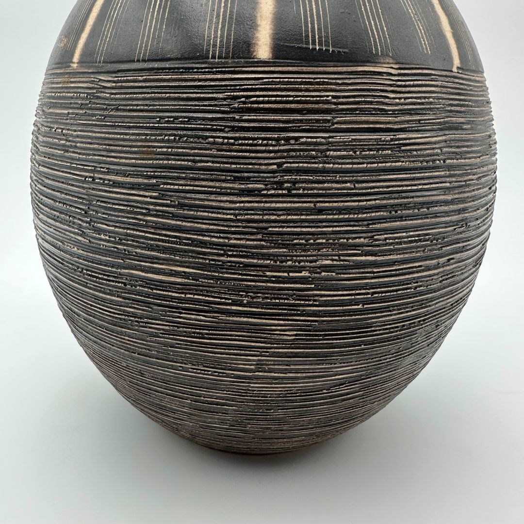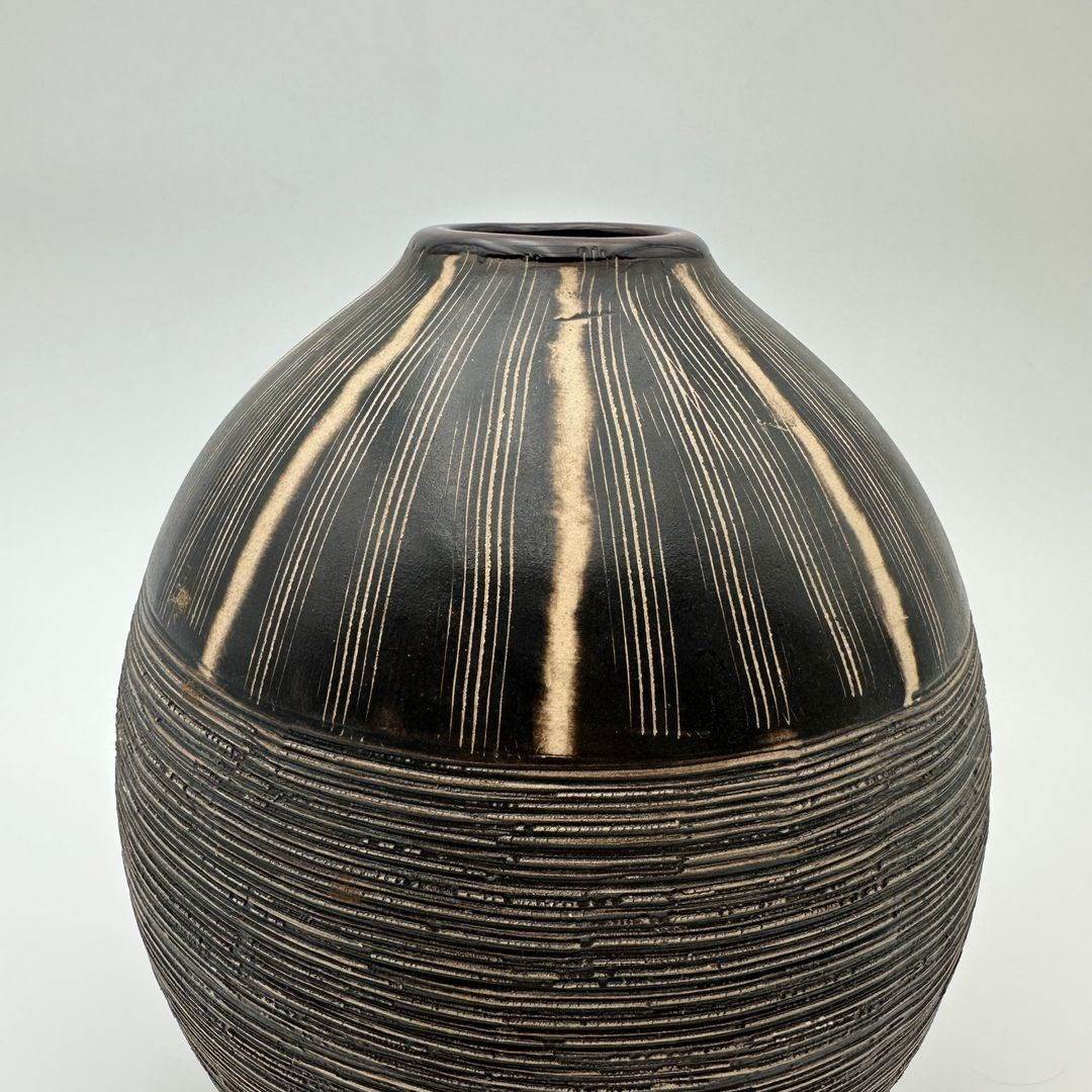 Black and white ceramic vase featuring a stylized monogram decoration rendered in a graphic and structured manner. The rhythmic composition recalls the decorative explorations of Jean Besnard and the modernist aesthetic of the 1950s.