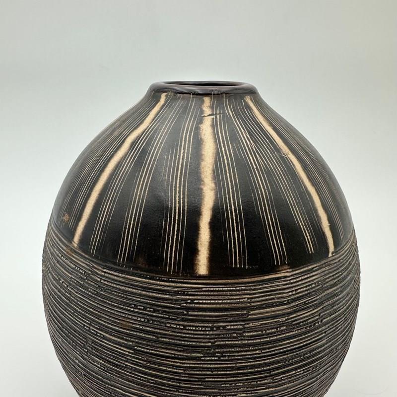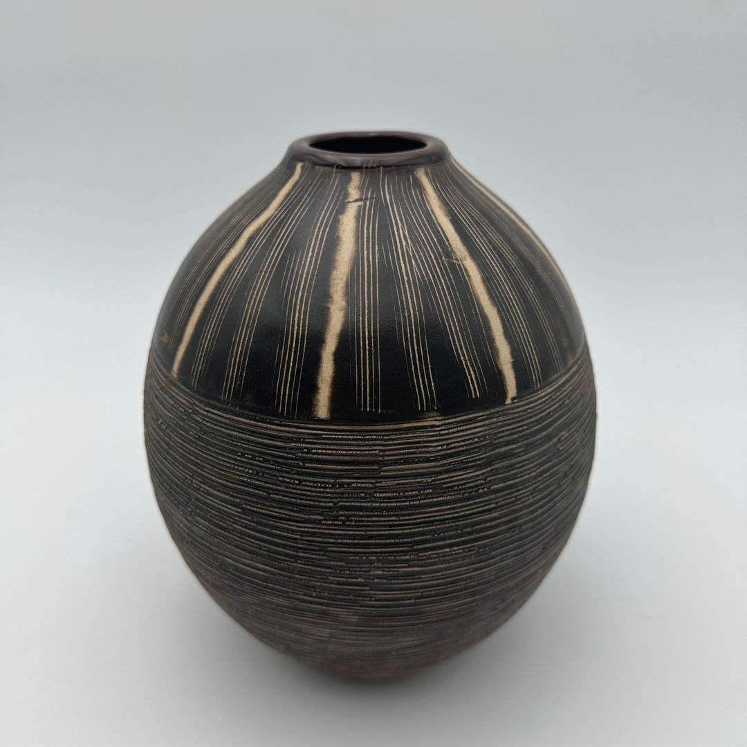 The glazed surface highlights the contrast between deep dark tones and lighter reserves, giving the piece a strong decorative presence.