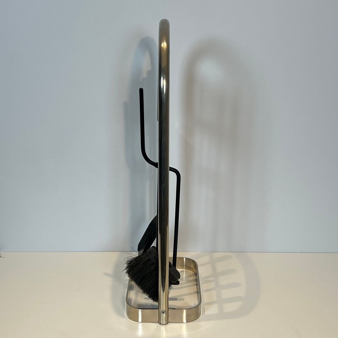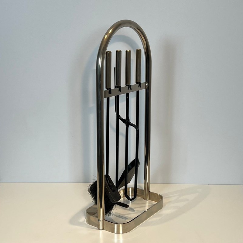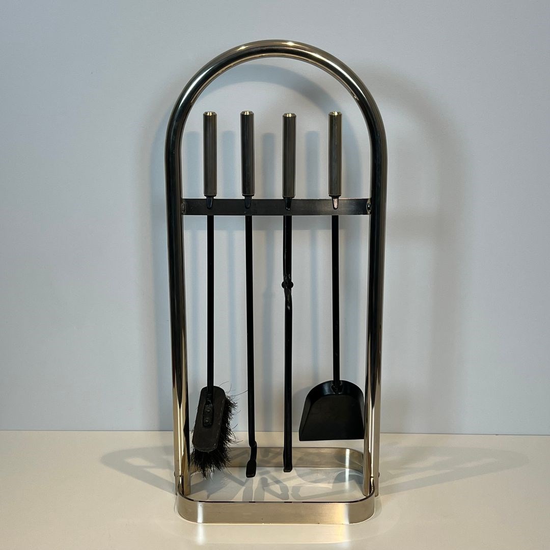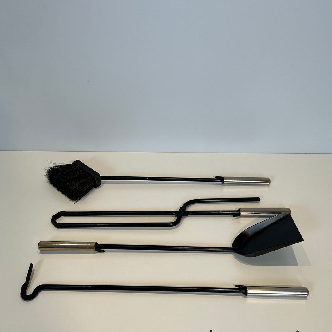 Black lacquered and chrome design fireplace tools on stand. French work. Circa 1970