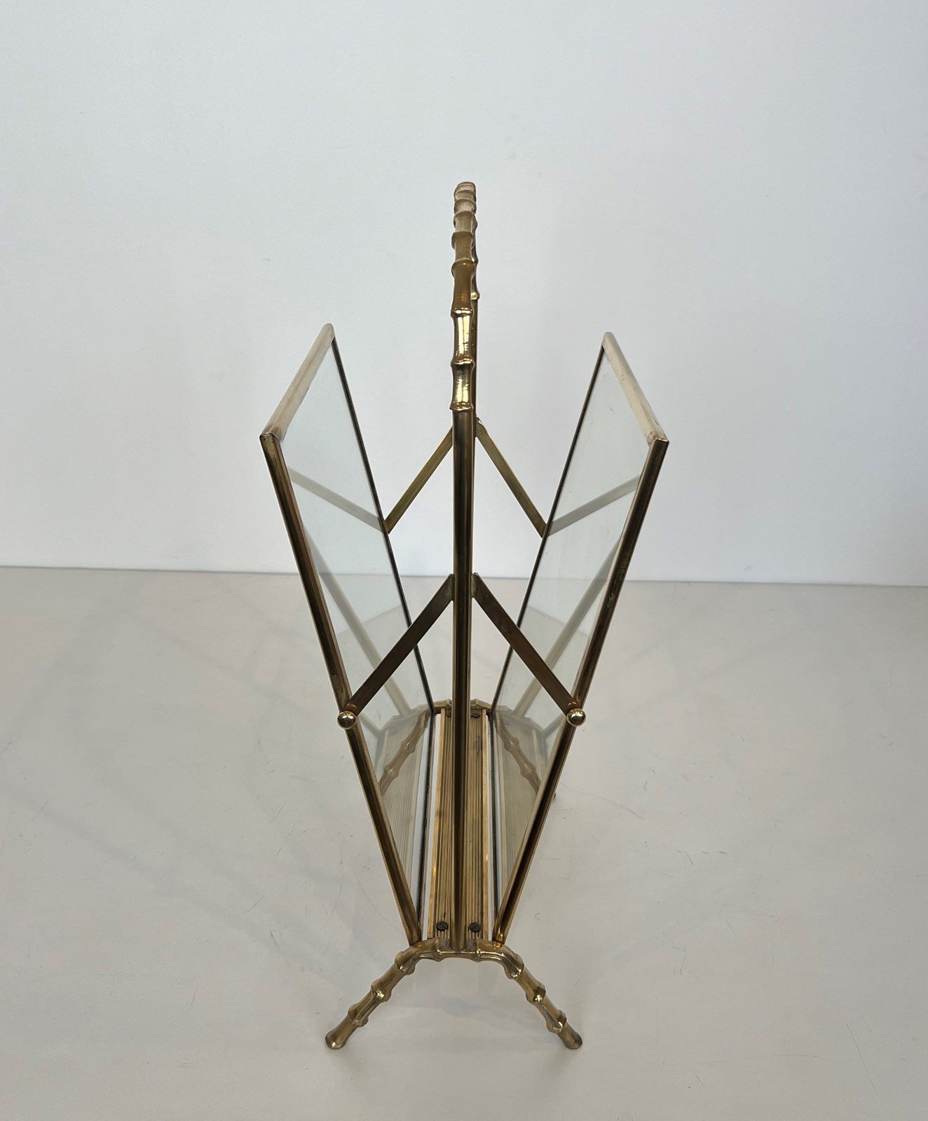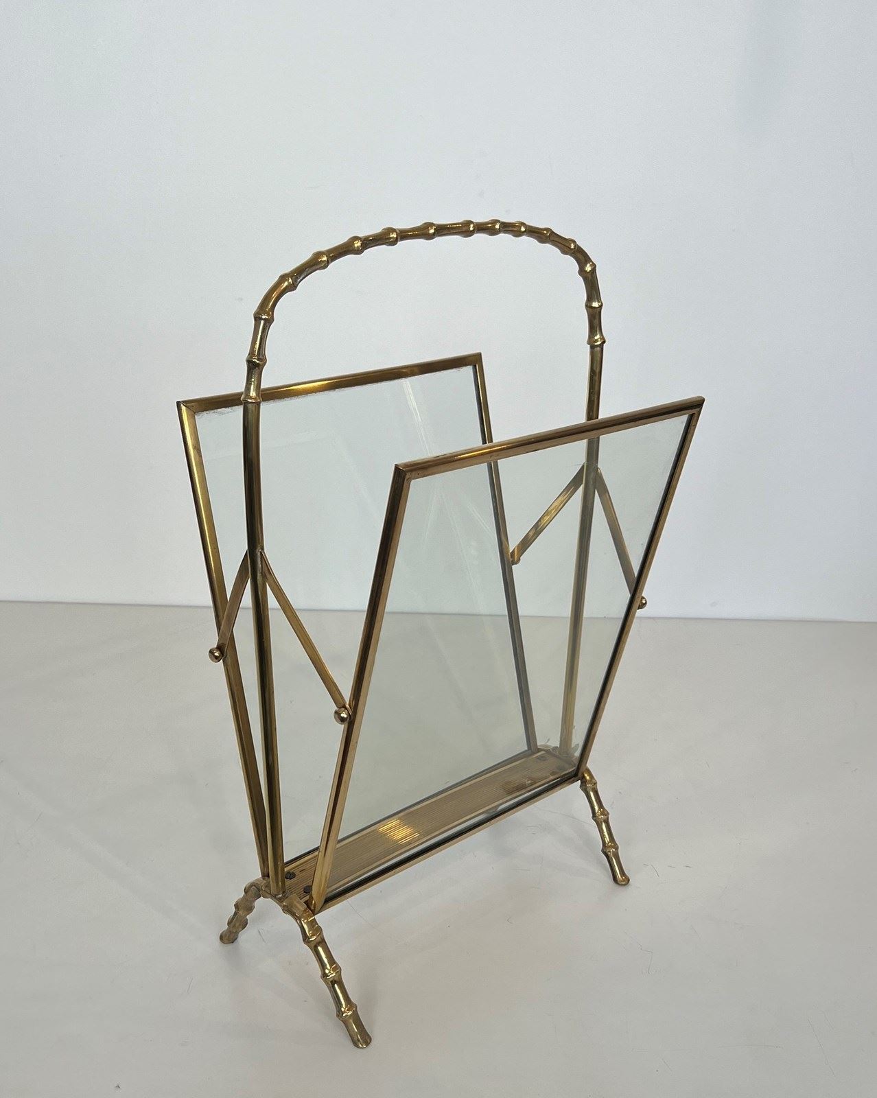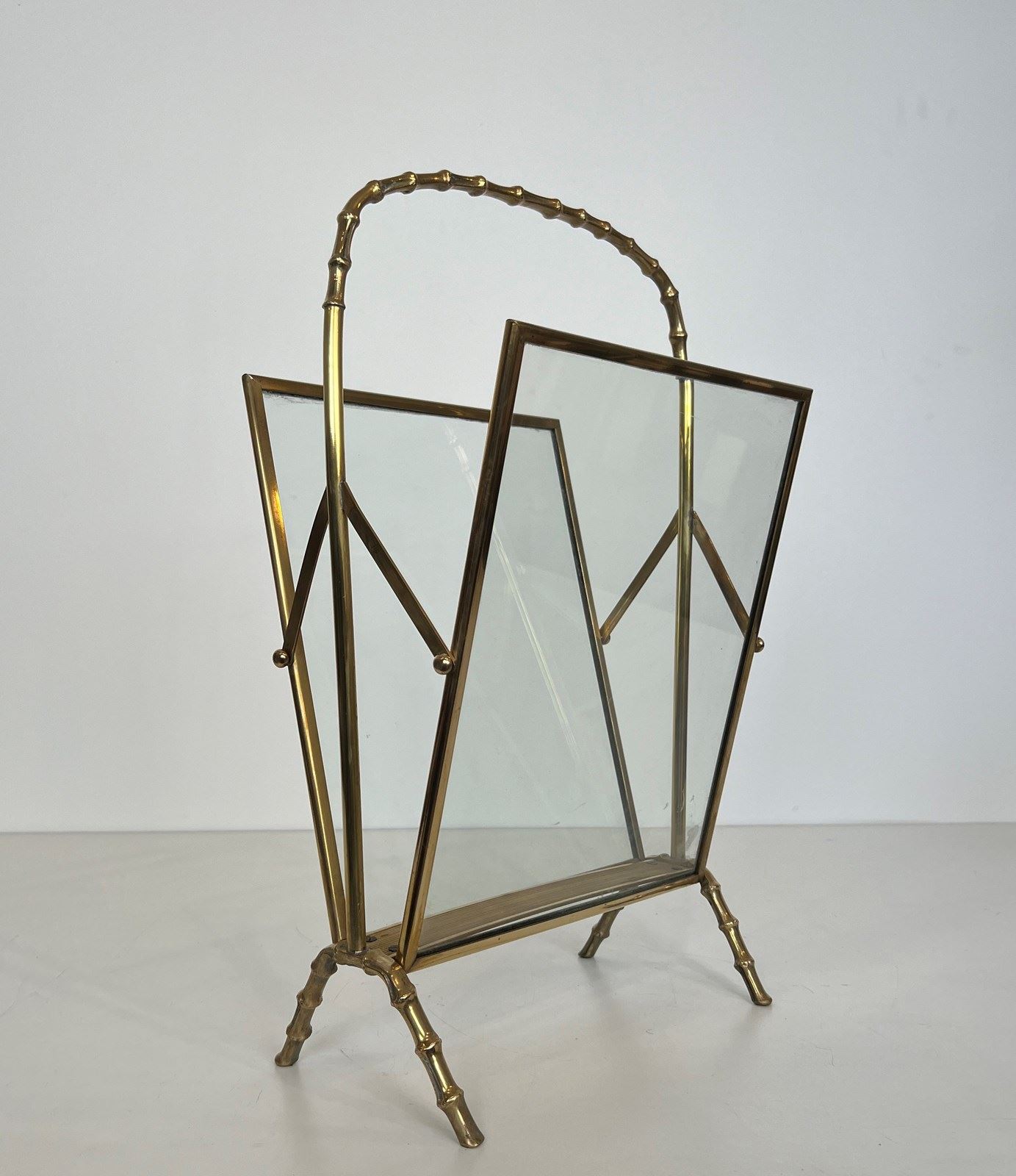Brass Faux-Bamboo Magazine Rack With Clear Glass Panels On Each Side.