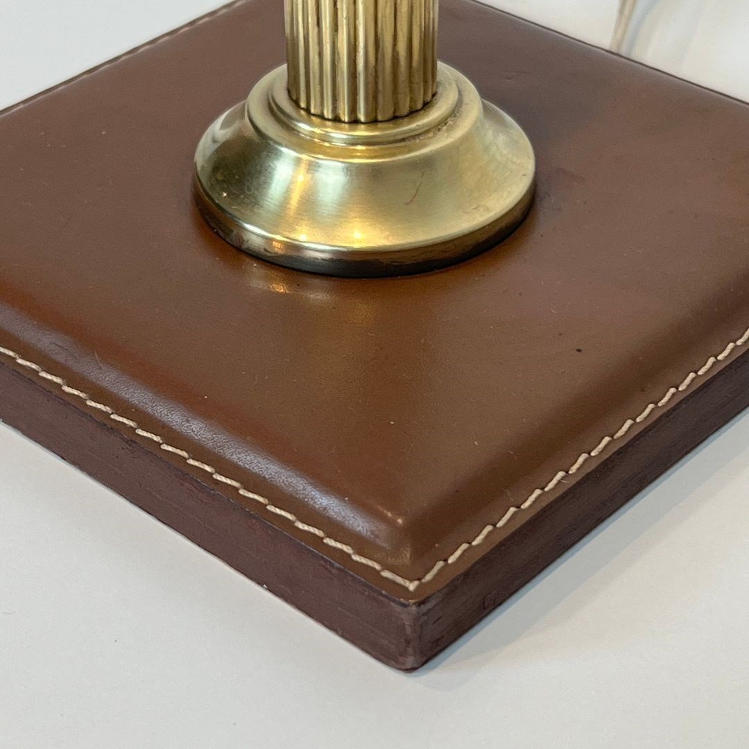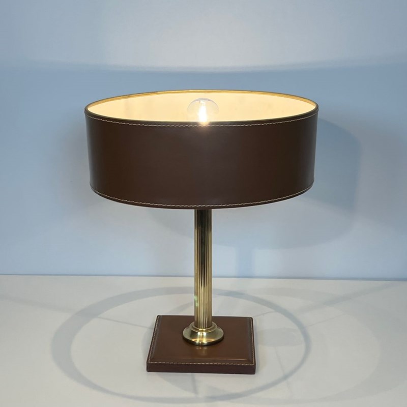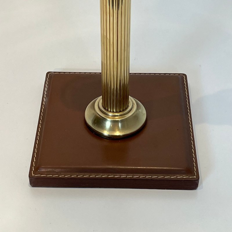 Brown leather and brass desk lamp. French work in the style of Jacques Adnet. Circa 1970